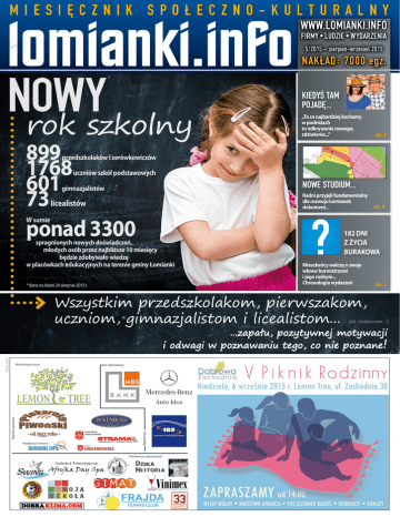 MIESIĘCZNIK SPOŁECZNO-KULTURALNY WWW.LOMIANKI.INFO FIRMY•LUDZIE•WYDARZENIA 5/2015 – sierpień-wrzesień 2015 NAKŁAD: 7000 egz. NOWY rok szkolny 899 1768 601 73 ponad 3300 KIEDYŚ TAM POJADĘ... „To co najbardziej kochamy w podróżach to odkrywanie nowego, zdziwienie...” str. 3 przedszkolaków i zerówkowiczów uczniów szkół podstawowych gimnazjalistów licealistów NOWE STUDIUM... Radni przyjęli fundamentalny dla rozwoju Łomianek dokument... str. 4 W sumie spragnionych nowych doświadczeń, młodych osób przez najbliższe 10 miesięcy będzie zdobywało wiedzę w placówkach edukacyjnych na terenie gminy Łomianki * dane na dzień 24 sierpnia 2015 r. 182 dni z życia Burakowa Mieszkańcy walczą o swoje wbrew burmistrzowi i jego radnym... Chronologia wydarzeń Wszystkim przedszkolakom, pierwszakom, uczniom, gimnazjalistom i licealistom... str. 5 i ich rodzicom :) REKLAMA ...zapału, pozytywnej motywacji i odwagi w poznawaniu tego, co nie poznane! PUB RESTAURACJA KONCERTY Cuba de Zoo / rock 5 września, godz. 20.00 Jeden z ulubionych zespołów dziennikarzy Radiowej Trójki. Koncerty Cuba de Zoo to potężna dawka energii i szczera radość grania. Moc, melodia i dobre polskie teksty. Jakub Kusior / rock, poezja 11 września, godz. 20.00 Młody, skromny chłopak, który techniką gry na gitarze znokautował jurorów Must Be the Music. Gitarę uzupełnił słowem, z czego powstały niezwykle dojrzałe piosenki. Pinakoteka / boogie, swing, jazz, pop 12 września, godz. 20.00 Czas spędzony z Pinakoteką to dużo emocji, energii i zaskakującej radości, połączonej z tekstami, które na długo pozostają w pamięci. Rytm, melodia, przekaz. Michał Szczerbiec Band / blues, rock 18 września, godz. 20.00 Zainspirowany takimi mistrzami jak: Mark Knopfler, Eric Clapton, Mike Oldfield, Carlos Santana, Zepół zagra covery oraz kompozycje autorskie. Small Mechanics / pop, akustycznie 25 września, godz. 20.00 Muzycy (Vavamuffin, Collage i The Cookies) opierają swoją twórczość na mechanicznych dźwiękach, samplując je i ubierając w elektroniczno-popowy styl na granicy dreamu i ambientu... ŁOMIANKI / DĄBROWA, ul. Zachodnia 38, tel. 798 110 522 MIESIĘCZNIK Redakcja: Maciek Moraczewski. Kontakt z redakcją: tel. 603 299 772, [email protected] Reklama: [email protected], tel. 603 299 772 Wydawca: M2Media, Łomianki, ul. Szkolna 32, Nakład: 7000 egz. Redakcja zastrzega sobie prawo skracania nadesłanych materiałów, redagowania i opatrywania własnymi tytułami. Redakcja zastrzega sobie również prawo odmowy przyjęcia reklamy lub ogłoszenia. Za treść reklam, ogłoszeń i listów redakcja i wydawca nie odpowiadają. Kiedyś tam pojadę podróżnicy z Łomianek Ona farmaceutka, on historyk, ona pracuje w korporacji, on prowadzi agencję nieruchomości. Odwiedziłam ich w domu pełnym pamiątek z licznych podróży. Rozmawialiśmy o planach na dalsze wyprawy oraz o tym, że warto marzenia zamieniać w działanie. Poznajcie Magdę Falandysz-Kasperską i Radka Kasperskiego – podróżników, którzy zaplanowali, że do emerytury objadą cały świat. Sylwia Maksim-Wójcicka: Dokąd teraz? Magdalena Falandysz-Kasperska: W sierpniu Filipiny, a w listopadzie do Kolumbii. Pierwotnie planowaliśmy na lato Grenlandię, ale okazało się, że jest problem z biletami, więc tym razem Filipiny. SMW: Macie jakiś plan na podróżowanie? MFK: Chcemy zobaczyć wszystkie państwa świata. W zależności od sposobu liczenia przyjmuje się, że jest ich 194. Do tej pory zwiedziliśmy 72 kraje, zostało więc jakieś 122. Planujemy, że cel osiągniemy w ciągu najbliższych 15 lat. SMW: Ambitnie. Od czego się zaczęło? Radosław Kasperski: Poznaliśmy się na studiach, okazało się, że pociąga nas świat. A że byliśmy młodzi i odważni, zaczęliśmy wspólnie jeździć. Pierwszy raz wyruszyliśmy chyba w 1997 r. MFK: U mnie zaczęło się od dziadka, który jest miłośnikiem geografii, ale nie miał dużej możliwości podróżowania. Oglądał mapy, prenumerował podróżnicze gazety i w wieku ponad 70 lat zaczął sam uczyć się języka angielskiego. Wyrastałam w środowisku ludzi ciekawych świata, no ale wiadomo, że możliwości były zupełnie inne, ograniczone. Kiedy mojej mamie w końcu udało się wyjechać do Indii, to była wiadomość, którą żyło całe miasteczko. świat odkrywać samemu. Poza tym samodzielne po- SMW: Jak wybieracie miejsce podróży? dróżowanie powoduje, że więcej zapamiętujemy. Kiedy MFK: Wszystko zależy od biletów. Mamy listę ok. nas wszędzie dowiozą, ktoś za nas wszystko zorganizu- 20 krajów, do których chcemy pojechać w najbliżje to mniej zapamiętamy z takiej podróży niż z wyjazdu szym czasie. Śledzę promocje ogłaszane przez linie samodzielnie zaplanowanego i przygotowanego. Wię- lotnicze, portale internetowe zbierające informacje o lotach, np. fly4free.pl, loter.pl, skyscanner.pl, cej tu emocji, pasji, adrenaliny. RK: Nasza strona także temu właśnie służy – na- kayak.pl itp. I jak trafia się okazja, to kupujemy mówieniu niezdecydowanych do ruszenia z domu bilety. w świat. Mamy w głowach wiele stereotypów o innych SMW: Jak długi jest każdy wyjazd? krajach i kontynentach, które nie przekładają się „Marzenia z dzieciństwa nigdy nie zostaną zapomniane na rzeczywistość. Media jeśli w dorosłym życiu zdecydujemy się na ich realizację”. informują głównie o tym co dzieje się w Europie, MFK: Niestety nie trwają długo, maksymalnie 2 tynie pokazują świata poza naszym kontynentem. SMW: Czy zdecydowalibyście się pojechać do kra- godnie. Mamy ograniczoną liczbę dni urlopu w roku, ju, w którym jest niebezpiecznie, trwa jakiś kon- staramy się więc tak planować wyjazdy, żeby wykorzystywać także wszystkie długie weekendy i święta. flikt? Np. do Syrii? MFK: W Syrii nie byliśmy i bardzo żałujemy, że nie Przed podróżą to ja zajmuję się planowaniem, dopizdążyliśmy zo