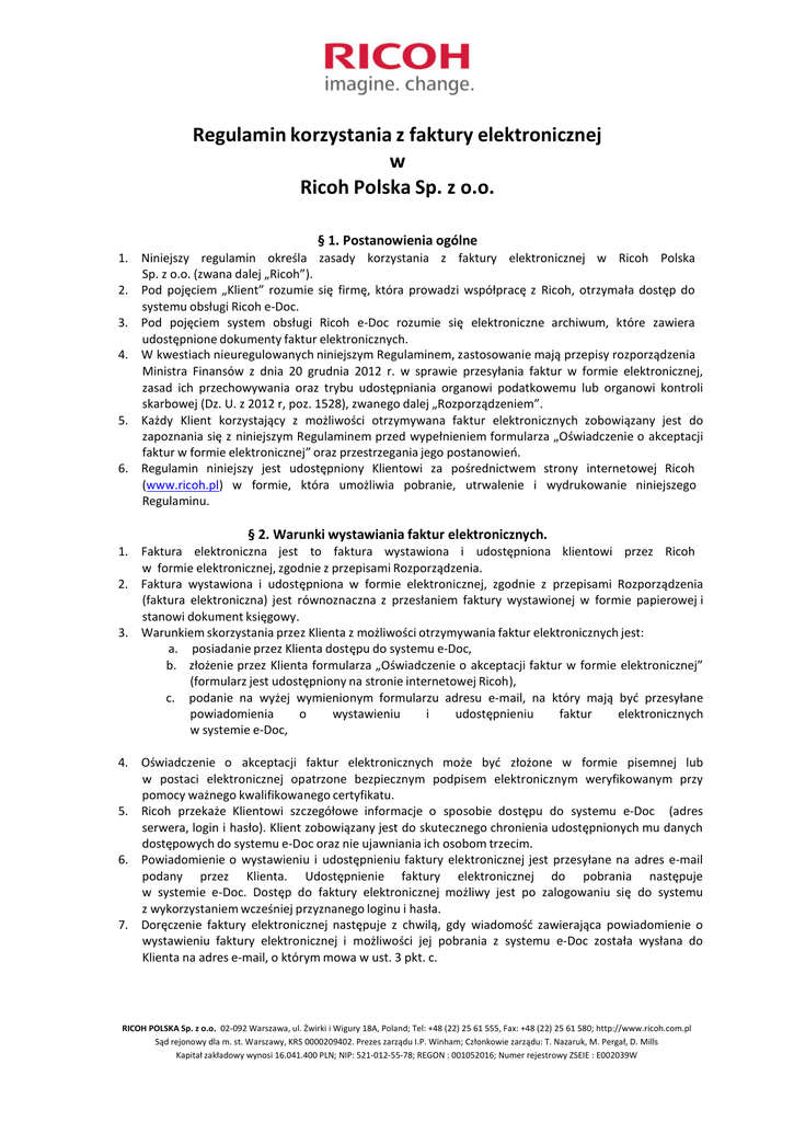Regulamin korzystania z faktury elektronicznej w Ricoh Polska Sp. z o.o. § 1. Postanowienia ogólne 1. Niniejszy regulamin określa zasady korzystania z faktury elektronicznej w Ricoh Polska Sp. z o.o. (zwana dalej „Ricoh”). 2. Pod pojęciem „Klient” rozumie się firmę, która prowadzi współpracę z Ricoh, otrzymała dostęp do systemu obsługi Ricoh e-Doc. 3. Pod pojęciem system obsługi Ricoh e-Doc rozumie się elektroniczne archiwum, które zawiera udostępnione dokumenty faktur elektronicznych. 4. W kwestiach nieuregulowanych niniejszym Regulaminem, zastosowanie mają przepisy rozporządzenia Ministra Finansów z dnia 20 grudnia 2012 r. w sprawie przesyłania faktur w formie elektronicznej, zasad ich przechowywania oraz trybu udostępniania organowi podatkowemu lub organowi kontroli skarbowej (Dz. U. z 2012 r, poz. 1528), zwanego dalej „Rozporządzeniem”. 5. Każdy Klient korzystający z możliwości otrzymywana faktur elektronicznych zobowiązany jest do zapoznania się z niniejszym Regulaminem przed wypełnieniem formularza „Oświadczenie o akceptacji faktur w formie elektronicznej” oraz przestrzegania jego postanowień. 6. Regulamin niniejszy jest udostępniony Klientowi za pośrednictwem strony internetowej Ricoh (www.ricoh.pl) w formie, która umożliwia pobranie, utrwalenie i wydrukowanie niniejszego Regulaminu. § 2. Warunki wystawiania faktur elektronicznych. 1. Faktura elektroniczna jest to faktura wystawiona i udostępniona klientowi przez Ricoh w formie elektronicznej, zgodnie z przepisami Rozporządzenia. 2. Faktura wystawiona i udostępniona w formie elektronicznej, zgodnie z przepisami Rozporządzenia (faktura elektroniczna) jest równoznaczna z przesłaniem faktury wystawionej w formie papierowej i stanowi dokument księgowy. 3. Warunkiem skorzystania przez Klienta z możliwości otrzymywania faktur elektronicznych jest: a. posiadanie przez Klienta dostępu do systemu e-Doc, b. złożenie przez Klienta formularza „Oświadczenie o akceptacji faktur w formie elektronicznej” (formularz jest udostępniony na stronie internetowej Ricoh), c. podanie na wyżej wymienionym formularzu adresu e-mail, na który mają być przesyłane powiadomienia o wystawieniu i udostępnieniu faktur elektronicznych w systemie e-Doc, 4. Oświadczenie o akceptacji faktur elektronicznych może być złożone w formie pisemnej lub w postaci elektronicznej opatrzone bezpiecznym podpisem elektronicznym weryfikowanym przy pomocy ważnego kwalifikowanego certyfikatu. 5. Ricoh przekaże Klientowi szczegółowe informacje o sposobie dostępu do systemu e-Doc (adres serwera, login i hasło). Klient zobowiązany jest do skutecznego chronienia udostępnionych mu danych dostępowych do systemu e-Doc oraz nie ujawniania ich osobom trzecim. 6. Powiadomienie o wystawieniu i udostępnieniu faktury elektronicznej jest przesyłane na adres e-mail podany przez Klienta. Udostępnienie faktury elektronicznej do pobrania następuje w systemie e-Doc. Dostęp do faktury elektronicznej możliwy jest po zalogowaniu się do systemu z wykorzystaniem wcześniej przyznanego loginu i hasła. 7. Doręczenie faktury elektronicznej następuje z chwilą, gdy wiadomość zawierająca powiadomienie o wystawieniu faktury elektronicznej i możliwości jej pobrania z systemu e-Doc została wysłana do Klienta na adres e-mail, o którym mowa w ust. 3 pkt. c. RICOH POLSKA Sp. z o.o. 02-092 Warszawa, ul. Żwirki i Wigury 18A, Poland; Tel: +48 (22) 25 61 555, Fax: +48 (22) 25 61 580; http://www.ricoh.com.pl Sąd rejonowy dla m. st. Warszawy, KRS 0000209402. Prezes zarządu I.P. Winham; Członkowie zarządu: T. Nazaruk, M. Pergał, D. Mills Kapitał zakładowy wynosi 16.041.400 PLN; NIP: 521-012-55-78; REGON : 001052016; Numer rejestrowy ZSEIE : E002039W 8. Oświadczenie Klienta o akceptacji faktur w formie elektronicznej nie pozbawia Ricoh prawa do wystawiania i przesyłania faktur, duplikatów faktur i faktur korygujących w formie papierowej w przypadkach przewidzianych przez prawo. 9. Ricoh rozpoczyna wystawianie faktur elektronicznych nie wcześniej niż w następnym dniu po otrzymaniu podpisanego formularza akceptacji oraz wystawia je nie dłużej niż do dnia otrzymania oświadczenia o wycofaniu akceptacji faktur w formie elektronicznej. 10. Klient zobowiązany jest do korzystania z otrzymanych (w tym przechowywania) faktur wyłącznie w formie elektronicznej zgodnie z zasadami określonymi w § 6 Rozporządzenia. 11. W przypadku rozwiązania umowy o współpracy, Klient traci dostęp do systemu e-Doc. W takim przypadku Klient zobowiązany jest do pobrania wszystkich wystawionych faktur elektronicznych z systemu e-Doc na wypadek konieczności wykorzystania ich np. w przypadku kontroli skarbowej. § 3. Zmiany adresu e-mail i rezygnacja. 1. Zmiany adresu e-mail, na który mają być przesyłanie powiadomienia o wystawieniu i udostępnieniu faktury elektronicznej można dokonać pisemnie przy wykorzystaniu formularza „Zmiana adresu e-mail do przesyłania faktury elektronicznej” udostępnionego na stronie internetowej Ricoh. 2. W przypadku braku powiadomienia Ricoh o zmianie adresu e-mail, faktury elektroniczne uważa się za skutecznie doręczone po ich udostępnieniu i przesłaniu powiadomienia o ich wystawieniu na ostatni podany przez Klienta adres e-mail. 3. Rezygnacji z możliwości wystawiania i otrzymywania faktur elektronicznych można dokonać w formie pisemnej przy wykorzystaniu formularza „Oświadczenie o wycofaniu akceptacji faktur w formie elektronicznej” udostępnionego na stronie internetowej Ricoh. 4. Ponowna aktywacja możliwości otrzymywania faktur elektronicznych wymaga ponownego złożenia oświadczenia, o którym mowa w §2 ust.3 pkt. b. niniejszego Regulaminu. § 4. Postanowienia końcowe 1. Ricoh zastrzega sobie prawo zmiany niniejszego Regulaminu. Wszelkie zmiany będą publikowane na stronie internetowej Ricoh (www.ricoh.pl) 2. Regulamin i wszelkie jego zmiany wchodzą w życie z