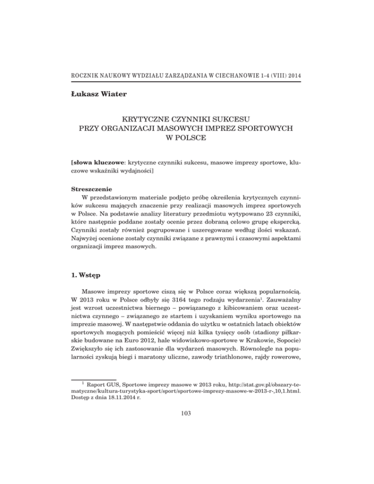 ROCZNIK NAUKOWY WYDZIAŁU ZARZĄDZANIA W CIECHANOWIE 1-4 (VIII) 2014 Łukasz Wiater KRYTYCZNE CZYNNIKI SUKCESU PRZY ORGANIZACJI MASOWYCH IMPREZ SPORTOWYCH W POLSCE [słowa kluczowe: krytyczne czynniki sukcesu, masowe imprezy sportowe, kluczowe wskaźniki wydajności] Streszczenie W przedstawionym materiale podjęto próbę określenia krytycznych czynników sukcesu mających znaczenie przy realizacji masowych imprez sportowych w Polsce. Na podstawie analizy literatury przedmiotu wytypowano 23 czynniki, które następnie poddane zostały ocenie przez dobraną celowo grupę ekspercką. Czynniki zostały również pogrupowane i uszeregowane według ilości wskazań. Najwyżej ocenione zostały czynniki związane z prawnymi i czasowymi aspektami organizacji imprez masowych. 1. Wstęp Masowe imprezy sportowe ciszą się w Polsce coraz większą popularnością. W 2013 roku w Polsce odbyły się 3164 tego rodzaju wydarzenia1. Zauważalny jest wzrost uczestnictwa biernego – powiązanego z kibicowaniem oraz uczestnictwa czynnego – związanego ze startem i uzyskaniem wyniku sportowego na imprezie masowej. W następstwie oddania do użytku w ostatnich latach obiektów sportowych mogących pomieścić więcej niż kilka tysięcy osób (stadiony piłkarskie budowane na Euro 2012, hale widowiskowo-sportowe w Krakowie, Sopocie) Zwiększyło się ich zastosowanie dla wydarzeń masowych. Równolegle na popularności zyskują biegi i maratony uliczne, zawody triathlonowe, rajdy rowerowe, 1 Raport GUS, Sportowe imprezy masowe w 2013 roku, http://stat.gov.pl/obszary-tematyczne/kultura-turystyka-sport/sport/sportowe-imprezy-masowe-w-2013-r-,10,1.html. Dostęp z dnia 18.11.2014 r. 103 Łukasz Wiater które przyciągają zarówno profesjonalnych sportowców, jak również zawodników amatorów2. Wskazana sytuacja jest szansą dla organizatorów imprez masowych. Mogą być nimi ukierunkowane na taką działalność podmioty gospodarcze, jednostki samorządu terytorialnego lub nawet osoby fizyczne. W każdym z tych przypadków osoby podejmujące się organizacji imprezy masowej w całości biorą na siebie odpowiedzialność za jej prawidłowe przygotowanie i przebieg. Poniższa praca ma za zadanie porównanie (występujących w literaturze przedmiotu) kilku obszarów, w których występują kluczowe czynniki sukcesu dla organizacji masowych imprez sportowych, z opiniami osób, które zawodowo zajmują się tego rodzaju działalnością. 2. Krytyczne czynniki sukcesu – KCS (Critical Success Factors) Krytyczne czynniki sukcesu3 określić można jako elementy, które wpływają na powodzenie przedsięwzięcia i osiągnięcie wyznaczonego celu. Można również rozumieć je jako posiadanie przez organizację pewnego rodzaju minimum zdolności i umiejętności w pewnych obszarach funkcjonowania. Pierwszy raz definicję KCS zaprezentował D.R Daniel4, ale spopularyzował je dopiero pod koniec lat siedemdziesiątych XX wieku J.F. Rockart5. Krytyczne czynniki sukcesu miały według niego służyć przedsiębiorstwom jako narzędzie ułatwiające realizację projektów i strategii. Lista kluczowych czynników sukcesu dla przedsięwzięć związanych z organizacją imprez sportowych zawierać może od kilku do kilkunastu pozycji uwzględniających specyfikę tego rodzaju działań. W przypadku masowych imprez sportowych specyfika częściowo narzucona jest przez prawo. W polskiej ustawie o bezpieczeństwie imprez masowych6 określony został wymóg ubiegania się (do 2 W ostatnim Maratonie Warszawskim wystartowało 6800 osób http://pzumaratonwarszawski.com/, (2014) w biegu Biegnij Warszawo około 12000 osób (2014) http://www. biegnijwarszawo.pl/pl/ 3 CSF – Critical Success Factors – w polskim piśmiennictwie stosuje się czasem zamiennie określenie krytyczne czynniki sukcesu lub kluczowe czynniki sukcesu. 4 Daniel, D. (1961). Managment information crises. “Harvard Business Review”, s. 111-116. 5 Rockart, J. (1979). Chief Executives Define their Own Data Needs. “Harvard Business Review”, 81-93. 6 Ustawa z dnia 20 marca 2009 r. o bezpieczeństwie imprez masowych Dz. U. 2009 Nr 62 poz. 504. 104 Krytyczne czynniki sukcesu przy organizacji masowych... właściwego ze względu na miejsce imprezy wójta, burmistrza lub prezydenta miasta) o wydanie pozwolenia na realizację tego typu przedsięwzięcia. Uzyskanie pozwolenia wiąże się z zapewnieniem właściwej organizacji imprezy masowej w obszarze przygotowania służb informacyjnych i porządkowych, pomocy medycznej, zaplecza sanitarnego, ochrony przeciwpożarowej oraz współpracy z odpowiednim służbami państwowymi. Przy tworzeniu listy krytycznych czynników dla danego projektu występują zasadniczo dwie podstawowe metody postępowania7. Pierwsza z nich jest metodą dwuetapową. W etapie pierwszym zadaniem osób zarządzających projektem powinna być jego analiza według wszystkich możliwych kryteriów, a następnie określenie jego słabych i mocnych stron. Etap drugi to wybranie spośród nich tych elementów, które będą miały największe znaczenie dla prawidłowej realizacji projektu. Przy wyborze kierować można się np. zaleceniami osób uważanych za ekspertów w danej dziedzinie. Druga metoda będzie metodą jednoetapową opierającą się na określeniu kompletnej listy krytycznych czynników sukcesu na podstawie posiadanego doświadczenia w zakresie realizacji podobnych projektów. Ryc. 1. Źródła krytycznych czynników sukcesu i ich wpływ na tworzenie kluczowych wskaźników wydajności. Źródło: Opracowanie własne. 7 Turner J. R. (2004). Five conditions for project success, “International Journal of Project Management”, 22(5), s. 349-350. 105 Łukasz Wiater Z powyższego podziału wnioskować można iż metoda dwuetapowa będzie bardziej właściwa dla podmiotów, które pierwszy raz podejmują działania związane z realizacją projektu jakim jest masowa impreza sportowa. Zarówno w jednej jak i w drugiej metodzie prz