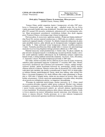 CZESŁAW GRAJEWSKI (Toruń / Warszawa) Musica Sacra Nova Nr 3/4 • 2009/2010, s. 651-653 Dwie płyty Tomasza Glanca: In memoriam, Missa pro pace (DOMI Classic, Niemcy 2008) Tomasz Glanc, polski organista, kantor i kompozytor, od roku 1987 przebywa w Niemczech, gdzie – można tak ująć – odnalazł swoje Sitz im Leben i gdzie prowadzi bardzo aktywną działalność. Dorobek tego artysty obejmuje 26 płyt CD i ponad 220 utworów wokalnych, orkiestrowych i na instrumenty solowe. Mam przyjemność przedstawić czytelnikom kolejne dwa dyski nagrane przez Tomasza Glanca, zawierające jego własne kompozycje. Pierwsza płyta, In memoriam, opatrzona mottem „Wojna jest klęską ludzkości” (Jan Paweł II), zawiera materiał zrealizowany w 2008 roku na wielkich, czteromanuałowych organach katedry w Kolonii. Na okładce książeczki dołączonej do płyty autor przybliża motywy, jakie skłoniły go do skomponowania i następnie nagrania tego dzieła. T. Glanc poświęcił swoje kompozycje ofiarom wszelkiej przemocy i wojen. Tematykę pacyfistyczną Glanc podjął także w muzyce do antywojennego musicalu Good morning Baghdad, którego premiera odbyła się w 2007 roku. Materiał muzyczny został przedstawiony w formie suity. Na płycie znalazło się pięć utworów skomponowanych w swobodnej (np. toccatowej) formie. Każdy z utworów został opatrzony tytułem odnoszącym się do konkretnej sytuacji z najnowszej historii świata, w której ludzkość doznawała cierpienia: Auschwitz, Getto, Hiroshima, 11. September i Katyń. Wszystkie kompozycje powstały w 2007 roku. Jak widać, niemal wszystkie utwory odnoszą się do czasu II wojny światowej, zaledwie jeden upamiętnia tragiczne wydarzenie 11 września 2001 roku. Można, oczywiście, dyskutować nad wyborem tych momentów i miejsc, zadając kompozytorowi pytanie, jakimi kryteriami kierował się, poświęcając własną muzykę ofiarom tamtych wydarzeń. Historia świata tylko na przestrzeni XX wieku odnotowała także inne zbrodnie, jak choćby wymordowanie w latach 1915-16 około półtora miliona Ormian zamieszkujących Turcję, około dwa miliony ofiar reżimu PolPota w ówczesnej Kampuczy czy około miliona ofiar wojny plemiennej w Rwandzie w 1994 roku. Z drugiej strony, chyba nie ma miejsca na świecie, które wolne byłoby od przemocy. Utwory muzyczne upamiętniające wszystkie ofiary złożyłyby się na pewno na wielopłytową edycję, i co najgorsze, niezamkniętą. Wracając do materiału muzycznego, można zauważyć, że T. Glanc starał się za pomocą dźwięku organów oddać grozę wydarzeń. Słychać więc imitacje wrzasków esesmanów w Oświęcimiu, wybuchu bomby nuklearnej w Hiroszimie i nawet krzyku przestraszonych ptaków po salwach plutonu egzekucyjnego w lesie katyńskim. Wyobraźnia podsuwa także obrazy tańczących Żydów, kiedy w Getcie pojawia się motyw hebrajskiej muzyki tanecznej, oraz kolumny wojskowe w marszu (Katyń). Trzeba przyznać, że w tym zakresie kompozytor umiejętnie wykorzystał ogromne możliwości instrumentu. RECENZJE I SPRAWOZDANIA Od strony harmonicznej zdecydowana większość materiału utrzymana jest w stylistyce późnoromantycznej, a więc z częstymi modulacjami, zmianami trybów czy silnym zabarwieniem chromatyką. Można rozpoznać fragmenty inspirowane twórczością Maxa Regera czy Charlesa-Marii Widora. Nie brak również klasterów, ostrych dysonansów i innych środków wyrazowych, właściwych dla muzyki współczesnej. Wskazuje to na dobre opanowanie przez Tomasza Glanca różnych stylów muzycznych i wszechstronnej znajomości muzyki organowej. Najbardziej przypadł mi do gustu 11. September. Duże wrażenie wywarł także Katyń, choć – co zrozumiałe – są to subiektywne oceny. Reasumując, nieco ponad godzinne nagranie wprawia słuchacza w pewną zadumę. Nie jest to muzyka lekka. Kompozytor zmusza do wysłuchania jej w skupieniu. Jestem jednak przekonany, że nawet ci, którzy współczesną muzykę traktują z dystansem, wysłuchają kompozycji Tomasza Glanca do końca. Zapis na recenzowanym dysku jest także świadectwem dzisiejszego brzmienia obecnych organów (w przyszłości zostaną wymienione na nowe) w jednej z najpiękniejszych katedr świata. T. Glancowi należą się słowa gratulacji za pomysł nagrania takiego materiału. Druga autorska płyta T. Glanca zawiera wieloczęściową Missae pro pace. Dzieło wpisuje się w historyczne continuum tego gatunku, istniejące nieprzerwanie od wczesnego średniowiecza. Punktem odniesienia jest pięcioczęściowy cykl zdefiniowany w XV w. przez J. Tinctorisa. Typologia mszy jest zresztą bardziej rozbudowana. Ze względu na typ struktury tekstu może to być missa pro defunctis, missa plena (ordinarium + proprium), missa brevis i inne. Polska praktyka XX w. (od J. Surzyńskiego do Z. Bagińskiego) wyróżnia w tym zakresie sześcioczęściowy cykl ze względu na oddzielenie Sanctus od Benedictus. Słynna msza beatowa K. Gärtner z 1967 r. tworzy już ośmioczęściowy cykl z dodanymi tekstami psalmowymi w opracowaniu K. Grześkowiaka. W 1974 r. J. Bauer do swojej dziesięcioczęściowej mszy wprowadził pieśni R. Brandstaettera. W tym samym roku J. Fotek stworzył piętnastoczęściową Mszę o Najświętszej Marii Pannie z tekstami J. Korczakowskiej. 652 RECENZJE I SPRAWOZDANIA „Gospelowa” msza o pokój (Missa pro pace) Tomasza Glanca, skomponowana w 2007 r., od strony formalnej zamyka się w ośmioczęściowym cyklu: Instrumis, Kyrie, Gloria, Psalm 120, Credo, Sanctus et Benedictus, Psalm 62 i Agnus Dei. Pomiędzy poszczególnymi jej częściami twórca umieścił recytacje (na płycie w wykonaniu Teresy Lipowskiej). Teksty owych recytacji pochodzą częściowo z Księgi Psalmów w swobodnej parafrazie, pozostałe są tłumaczeniami tekstów anonimowych. Kompozytor napisał Missae pro pace do liturgicznego tekstu łacińskiego. Wyjątkiem są jedynie recytacje, które realizowane są w języku pols