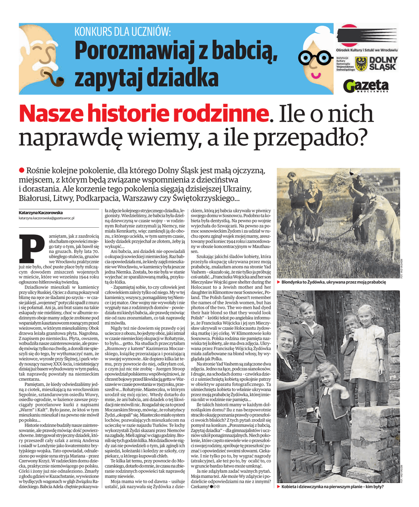 Gazeta Wrocławska Piątek, 9 września 2016 KONKURS DLA UCZNIÓW: •I www.gazetawroclawska.pl Magazyn Porozmawiaj z babcią, zapytaj dziadka Nasze historie rodzinne. Ile o nich naprawdę wiemy, a ile przepadło? A Rośnie kolejne pokolenie, dla którego Dolny Śląsk jest małą ojczyzną, [email protected] amiętam, jak z zazdrością słuchałam opowieści mojego taty o tym, jak bawił się na gruzach. Były lata 70. ubiegłego stulecia, gruzów we Wrocławiu praktycznie już nie było, choć puste place były milczącym dowodem zniszczeń wojennych w mieście, które we wrześniu 1944 roku ogłoszono hitlerowską twierdzą. Dziadkowie mieszkali w kamienicy przy ulicy Ruskiej. Ojciec z dumą pokazywał bliznę na ręce ze śladami po szyciu – w czasie jakiejś „wojennej” potyczki spadł z muru i się połamał. Ani ja, ani brat szans na takie eskapady nie mieliśmy, choć w albumie rodzinnym oboje mamy zdjęcie zrobione pod wspaniałym kasztanowcem rosnącym przed wieżowcem, w którym mieszkaliśmy. Obok drzewa leżała granitowa płyta. Nagrobna. Z napisem po niemiecku. Płyta, owszem, wzbudziła nasze zainteresowanie, ale prawdę mówiąc tylko na chwilę, a dorośli nie spieszyli się do tego, by wytłumaczyć nam, że wieżowce, wyrosłe przy Ślężnej, i park wtedy noszący nazwę XXX-lecia, i nieistniejący dzisiaj już basen wybudowany w tym parku, tak naprawdę powstały na niemieckim cmentarzu. Pamiętam, że kiedy odwiedzaliśmy jedną z ciotek, mieszkającą na wrocławskim Sępolnie, sztandarowym osiedlu Wuwy, osiedlu-ogrodzie, w łazience zawsze przyciągały porcelanowe kurki z napisami „Warm” i Kalt”. Było jasne, że ktoś w tym mieszkaniu mieszkał i na pewno nie mówił po polsku... Historie rodzinne budziły nasze zainteresowanie, ale prawdę mówiąc dość powierzchowne. Intrygował stryjeczny dziadek, który przeszedł cały szlak z armią Andersa i osiadł w Londynie jako kwatermistrz brytyjskiego wojska. Tato opowiadał, odnaleziono po wojnie syna stryja Mariana – przez Czerwony Krzyż. W radzieckim domu dziecka, praktycznie niemówiącego po polsku. Córki i żony już nie odnaleziono. Zmarły z głodu gdzieś w Kazachstanie, wywiezione w bydlęcych wagonach w głąb Związku Radzieckiego. Babcia Adela chętnie pokazywa- P ła zdjęcie kolejnego stryjecznego dziadka, legionisty. Wiedzieliśmy, że babcia była dzielną dziewczyną w czasie wojny – w rodzinnym Rohatynie zatrzymali ją Niemcy, nie miała Kennkarty, więc zamknęli ją do obozu, z którego uciekła, w tym samym czasie, kiedy dziadek przyjechał ze złotem, żeby ją wykupić... Ani babcia, ani dziadek nie opowiadali o okupacji sowieckiej i niemieckiej. Raz babcia opowiedziała mi, że kiedy zajęli mieszkanie we Wrocławiu, w kamienicy była jeszcze jedna Niemka. Została, bo nie była w stanie wyjechać ze sparaliżowaną matką, przykutą do łóżka. – Zapamiętaj sobie, to czy człowiek jest człowiekiem zależy tylko od niego. My w tej kamienicy, wszyscy, pomagaliśmy tej Niemce i jej matce. One wojny nie wywołały i nie wygnały nas z rodzinnych domów – powiedziała mi kiedyś babcia, ale prawdę mówiąc nie od razu zrozumiałam, co tak naprawdę mi mówiła. Nigdy też nie dowiem się prawdy o jej ucieczce z obozu, bo jedyny obóz, jaki istniał w czasie niemieckiej okupacji w Rohatynie, to było... getto. Na studiach przeczytałam „Rozmowy z katem” Kazimierza Moczarskiego, książkę przerażająca i porażającą w swojej wymowie. Ale dopiero kilka lat temu, przy powrocie do niej, odkryłam coś, z czym już nic nie zrobię – Juergen Stroop opowiedział polskiemu współwięźniowi, że chrzest bojowy przed likwidacją getta w Warszawie w czasie powstania w 1943 roku, przeszedł w... Rohatynie. Miasteczku, w którym urodził się mój ojciec. Wtedy dotarło do mnie, że ani babcia, ani dziadek o tej likwidacji nie mówili nic. Rozgadał się za to przed Moczarskim Stroop, mówiąc, że rohatyńscy Żydzi „okopali” się. Miasteczko miało system lochów, pozwalających mieszkańcom na ucieczkę w razie najazdu Turków. Te lochy wykorzystali Żydzi skazani przez Niemców na zagładę. Mieli zginąć w ciągu godziny. Bronili się tych godzin kilka. Moi dziadkowie nigdy zaś nie powiedzieli o tym, jak zginęli ich sąsiedzi, koleżanki i koledzy ze szkoły, czy piekarz, u którego kupowali chleb. Te kilka lat temu, przy powrocie do Moczarskiego, dotarło do mnie, że czasu na zbieranie rodzinnych opowieści tak naprawdę mamy niewiele. Moja mama wie to od dawna – usiłuje ustalić, jak nazywała się Żydówka z dzie- ckiem, którą jej babcia ukrywała w piwnicy swojego domu w Sosnowcu. Podobno ta kobieta była dentystką. Na pewno po wojnie wyjechała do Szwajcarii. Na pewno za pomoc sosnowieckim Żydom i za udział w ruchu oporu zginął wujek mojej mamy, aresztowany pod koniec 1944 roku i zamordowany w obozie koncentracyjnym w Mauthausen. Szukając jakichś śladów kobiety, która przeżyła okupację ukrywana przez moją prababcię, znalazłam anons na stronie Yad Vashem – okazało się, że nie tylko ja próbuję coś ustalić. „Franciszka Wojcicka and her son Mieczyslaw Wojciki gave shelter during the Holocaust to a Jewish mother and her daughter in Klimontow near Sosnowiec, Poland. The Polish family doesn’t remember the names of the Jewish women, but has photos of the two. The wo-men had dyed their hair blond so that they would look Polish” – krótki tekst po angielsku informuje, że Franciszka Wójcicka i jej syn Mieczysław ukrywali w czasie Holocaustu żydowską matkę i jej córkę. W Klimontowie koło Sosnowca. Polska rodzina nie pamięta nazwiska tej kobiety, ale ma dwa zdjęcia. Ukrywana przez Franciszkę Wójcicką Żydówka miała zafarbowane na blond włosy, by wyglądała jak Polka. Na stronie Yad Vashem są załączone dwa zdjęcia. Jedno na łące, podczas sianokosów. I drugie, na schodach domu – czwórka dzieci z uśm