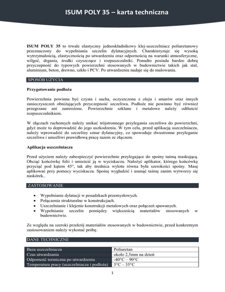ISUM POLY 35 – karta techniczna ISUM POLY 35 – karta techniczna ISUM POLY 35 to trwale elastyczny jednoskładnikowy klej-uszczelniacz poliuretanowy przeznaczony do wypełniania szczelin dylatacyjnych. Charakteryzuje się wysoką wytrzymałością, elastycznością po utwardzeniu oraz odpornością na warunki atmosferyczne, wilgoć, drgania, środki czyszczące i rozpuszczalniki. Ponadto posiada bardzo dobrą przyczepność do typowych powierzchni stosowanych w budownictwie takich jak stal, aluminium, beton, drewno, szkło i PCV. Po utwardzeniu nadaje się do malowania. SPOSÓB UŻYCIA Przygotowanie podłoża Powierzchnia powinna być czysta i sucha, oczyszczona z oleju i smarów oraz innych zanieczyszczeń obniżających przyczepność szczeliwa. Podłoże nie powinno być również przegrzane ani zamrożone. Powierzchnie szklane i metalowe należy odtłuścić rozpuszczalnikiem. W złączach ruchomych należy unikać trójstronnego przylegania szczeliwa do powierzchni, gdyż może to doprowadzić do jego uszkodzenia. W tym celu, przed aplikacją uszczelniacza, należy wprowadzić do szczeliny sznur dylatacyjny, co spowoduje dwustronne przyleganie szczeliwa i umożliwi prawidłową pracę razem ze złączem. Aplikacja uszczelniacza Przed użyciem należy zabezpieczyć powierzchnie przylegające do spoiny taśmą maskującą. Obciąć końcówkę folii i umieścić ją w wyciskaczu. Nałożyć aplikator, którego końcówkę przyciąć pod kątem 45°, tak aby średnica wylotu równa była szerokości spoiny. Masę aplikować przy pomocy wyciskacza. Spoinę wygładzić i usunąć taśmę zanim wytworzy się naskórek.. ZASTOSOWANIE Wypełnianie dylatacji w posadzkach przemysłowych. Połączenia strukturalne w konstrukcjach. Uszczelnianie i klejenie konstrukcji metalowych oraz połączeń spawanych. Wypełnianie szczelin pomiędzy większością materiałów stosowanych budownictwie. w Ze względu na szeroki przekrój materiałów stosowanych w budownictwie, przed konkretnym zastosowaniem należy wykonać próbę. DANE TECHNICZNE Baza uszczelniacza Czas utwardzania Odporność termiczna po utwardzeniu Temperatura pracy (uszczelniacza i podłoża) Poliuretan około 2,5mm na dzień -40°C – 90°C 5°C – 35°C 1 ISUM POLY 35 – karta techniczna Twardość Powrót elastyczny Wydłużenie przy zerwaniu Ciężar właściwy Maksymalne napięcie System utwardzania Kolor 35°–40° Shore A >70% (ISO 7389) >600% 1,20–1,25g/ml 1,5–2,0N/mm2 Pod wpływem wilgoci szary WYDAJNOŚĆ Szerokość szczeliny [mm] Zalecana głębokość [mm] 4 5 6 8 10 12 15 20 5 5 6 6 6 8 8 10 Folia 600ml wystarcza na ok. [mb] 30 20 13 10 8 5 4 2 Zalecana średnica sznura dylatacyjnego [mm] 6 8 8 10 13 15 20 25 Podane powyżej dane są przybliżone i uwzględniają około 20% strat powstałych w procesie aplikacji oraz wynikających z różnic w umiejscowieniu sznura dylatacyjnego. PRZECHOWYWANIE Produkt należy przechowywać w temperaturze 10-25o C. Podczas przechowywania chronić przed dostępem wilgoci oraz promieni słonecznych. Nie przechowywać na zewnątrz. UWAGI KOŃCOWE Powyższe dane opierają się na naszej wiedzy i badaniach. Producent odpowiada za jakość wyrobu i gwarantuje jej wysoki poziom. Nie ponosi jednak odpowiedzialności za konkretne zastosowania. Stosując produkt należy przestrzegać zapisów niniejszej karty technicznej, przepisów BHP, zasad dobrej praktyki sztuki budowlanej oraz prawa lokalnego. 2