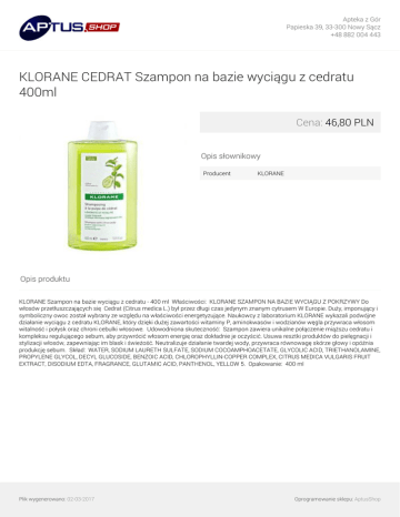 Apteka z Gór Papieska 39, 33-300 Nowy Sącz +48 882 004 443 KLORANE CEDRAT Szampon na bazie wyciągu z cedratu 400ml Cena: 46,80 PLN Opis słownikowy Producent KLORANE Opis produktu KLORANE Szampon na bazie wyciągu z cedratu - 400 ml Właściwości: KLORANE SZAMPON NA BAZIE WYCIĄGU Z POKRZYWY Do włosów przetłuszczających się Cedrat (Citrus medica L.) był przez długi czas jedynym znanym cytrusem W Europie. Duży, imponujący i symboliczny owoc został wybrany ze względu na właściwości energetyzujące. Naukowcy z laboratorium KLORANE wykazali podwójne działanie wyciągu z cedratu KLORANE, który dzięki dużej zawartości witaminy P, aminokwasów i wodzianów węgla przywraca włosom witalność i połysk oraz chroni cebulki włosowe. Udowodniona skuteczność: Szampon zawiera unikalne połączenie miąższu cedratu i kompleksu regulującego sebum, aby przywrócić włosom energię oraz dokładnie je oczyścić. Usuwa resztki produktów do pielęgnacji i stylizacji włosów, zapewniając im blask i świeżość. Neutralizuje działanie twardej wody, przywraca równowagę skórze głowy i opóźnia produkcję sebum. Skład: WATER, SODIUM LAURETH SULFATE, SODIUM COCOAMPHOACETATE, GLYCOLIC ACID, TRIETHANOLAMINE, PROPYLENE GLYCOL, DECYL GLUCOSIDE, BENZOIC ACID, CHLOROPHYLLIN-COPPER COMPLEX, CITRUS MEDICA VULGARIS FRUIT EXTRACT, DISODIUM EDTA, FRAGRANCE, GLUTAMIC ACID, PANTHENOL, YELLOW 5. Opakowanie: 400 ml Plik wygenerowano: 02-03-2017 Powered by TCPDF (www.tcpdf.org) Oprogramowanie sklepu: AptusShop