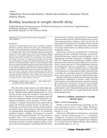 Borgis *Magdalena Wyszkowska-Kolatko, Paulina Koczurkiewicz, Katarzyna Wójcik, Elżbieta Pękala Rośliny lecznicze w terapii chorób skóry Zakład Biochemii Farmaceutycznej, Wydział Farmaceutyczny Uniwersytetu Jagiellońskiego, Collegium Medicum w Krakowie Kierownik Zakładu: dr hab. Elżbieta Pękala MEDICINAL PLANTS USED IN SKIN DISEASES TREATMENT SUMMARY Treatment of dermatological diseases are developed in different directions. Common skin diseases (like acne, dermatomycosis, psoriasis, atopic dermatitis) are a huge problem, both physiological and social. More than 80% of teenagers suffer from acne, and as ,”Achilles study” shows, of the 40 thousand surveyed people in Poland, 42% have athlete’s foot and 21% onychomycosis. Rising expectations of patients regarding the efficacy of skin diseases therapies forced the search for new treatments. New therapies are sought everywhere, it is observed increasingly returns to the natural therapeutic methods. The phytochemical data show that substances derived from plants may have a better therapeutic effect than conventional therapeutic agents and also shows greater safety for the human organism. Substances derived from plants exert a wide range of pharmacological activity, including: antibacterial, antifungal, anti-inflammatory and many others. In addition, they can be used for a long time without worrying about side effects. Moreover, natural substances haven’t often irritating the skin and not cause bacterial resistance, what is often seen in the case of antibiotic therapies. The article reviews the most interesting plants in a point of view of skin diseases treatment. KEYWORDS: MEDICINAL PLANTS – SKIN DISEASES – ALTERNATIVE TREATMENT Choroby skóry nadal stanowią nie tylko duży problem terapeutyczny, ale także psychologiczny i społeczny. Według badań epidemiologicznych, co trzeci dorosły Polak cierpi lub cierpiał w przeszłości na choroby skóry (1). Najczęściej występującą chorobą skóry jest trądzik pospolity, na który zapada 80% populacji nastolatków; uważa się nawet, że 100% społeczeństwa w różnych momentach życia chorowało na mniej lub bardziej nasiloną postać tej choroby (2). Obserwuje się również stale rosnącą zachorowalność na grzybice skóry, spowodowane rozprzestrzenianiem się dermatofitów antropofilnych (3). Na podstawie wyników projektu ,,Achilles” oszacowano, że pośród 40 tysięcy przebadanych Polaków, 42% chorowało na grzybicę stóp, a 21% na grzybicę paznokci. Dużym wyzwaniem terapeutycznym dla dermatologów nadal pozostają: łuszczyca, atopowe zapalenie skóry, a także coraz częściej występujące w populacji choroby nowo184 tworowe skóry. Istnieje zatem potrzeba i konieczność opracowywania nowych, bardziej skutecznych rozwiązań terapeutycznych. Jednym z nich jest powrót do tradycyjnych metod leczenia. Źródłem wielu cennych substancji o działaniu terapeutycznym stosowanych w leczeniu chorób skóry są rośliny lecznicze oraz ich metabolity wtórne. Substancje lecznicze pochodzenia roślinnego wykazują szerokie spektrum działania: od przeciwdrobnoustrojowego, poprzez przeciwzapalne, aż do regulującego stężenie hormonów w ludzkim organizmie (4). Odpowiednie dawkowanie środków roślinnych pozwala stosować je przez długi okres czasu bez obaw o skutki uboczne (5). Niejednokrotnie substancje biologicznie aktywne pozyskiwane z roślin mają równie dobre, a nawet bardziej skuteczne działanie w porównaniu do tradycyjnych leków syntetycznych, w dodatku nie wywołują oporności drobnoustrojów, która często pojawia się podczas antybiotykoterapii. Badania nad nowymi substancjami terapeutycznymi pochodzenia roślinnego są bardzo ważne, bowiem wykorzystanie tych substancji niesie ogromne nadzieje dla współczesnej medycyny, farmacji i kosmetologii. W pracy opisano przykłady gatunków roślin oraz pozyskiwanych z nich substancji biologicznie aktywnych, mających zastosowanie w terapii niektórych chorób dermatologicznych. Surowce roślinne stosowane w terapii chorób skóry Olejek z drzewa herbacianego Olejek z drzewa herbacianego pozyskuje się metodą destylacji parowej z liści rośliny Malaleuca alternifolia, która należy do rodziny Myrtaceae (Mirtowate) (4, 6-9). Głównymi składnikami biologicznie aktywnymi olejku z drzewa herbacianego są γ- i α-terpinen, α-terpineol, 1,8-cyneol, p-cymen, α-pinen i limonen, jednakże najważniejszym bez wątpienia jest terpinen-4-ol, dzięki któremu olejek wykazuje silne działanie przeciwbakteryjne (6, 10, 11). Postępy Fitoterapii 3/2015 Rośliny lecznicze w terapii chorób skóry Właściwości terapeutyczne olejku z drzewa herbacianego wykorzystywane są od wieków do leczenia ran, a także przeciwko bólom głowy czy też przeziębieniom. Olejek z drzewa herbacianego ma charakter lipofilowy, dzięki czemu dobrze penetruje w głąb skóry (6, 10). Jest wykorzystywany w leczeniu chorób skóry, m.in. w trądziku, łupieżu, łuszczycy, łojotokowym zapaleniu skóry, stwardnieniach, odciskach, grzybicy stóp i skóry głowy, drożdżycy paznokci, w terapii owrzodzeń cukrzycowych i żylakowych, w zakażonych ranach, oparzeniach, alergiach kontaktowych, wypryskach atopowych, czyrakach i zanokcicy (6, 9, 10, 12). Nierozcieńczony olejek nie powinien być stosowany na skórę dłużej niż 2 dni, a najlepiej tolerowane są stężenia mieszaniny w zakresie od 1 do 10%, które mogą być stosowane nawet przez okres 6 mies., przy czym nie zaleca się stosowania olejku z drzewa herbacianego u dzieci poniżej 6. roku życia (13). Olejek z drzewa herbacianego skutecznie zwalcza także zakażenia bakteryjne i grzybicze jamy ustnej, niweluje zakażenia górnych dróg oddechowych, pochwy, dróg moczowych; ponadto stosowany jest w terapii hemoroidów oraz robaczyc. Zanotowano także skuteczne działanie olejku z drzewa herbacianego przeciw wirusom opryszczki i grypy. Interesujące zastosowanie znalaz
