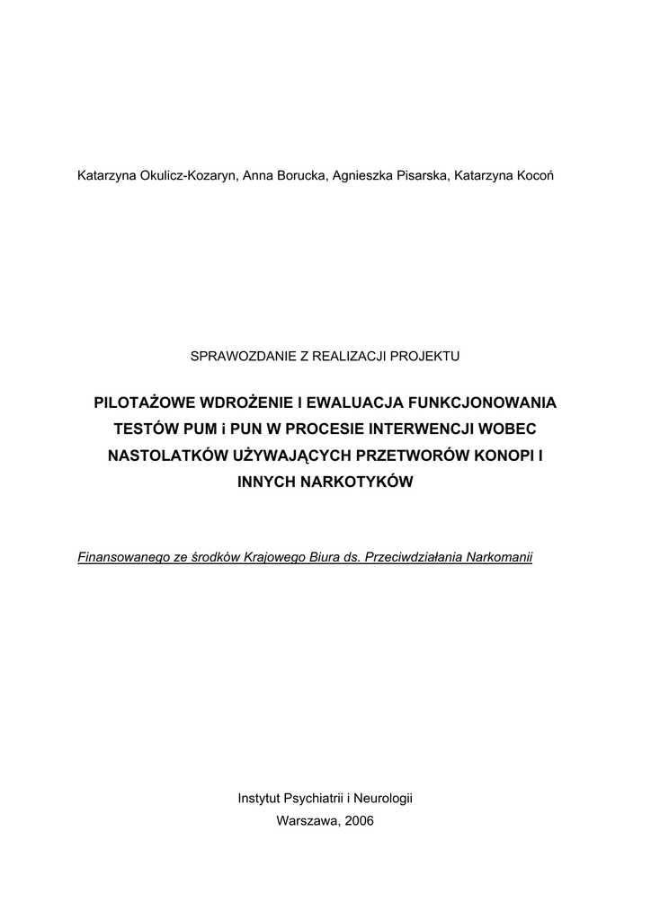 Katarzyna Okulicz-Kozaryn, Anna Borucka, Agnieszka Pisarska, Katarzyna Kocoń SPRAWOZDANIE Z REALIZACJI PROJEKTU PILOTAŻOWE WDROŻENIE I EWALUACJA FUNKCJONOWANIA TESTÓW PUM i PUN W PROCESIE INTERWENCJI WOBEC NASTOLATKÓW UŻYWAJĄCYCH PRZETWORÓW KONOPI I INNYCH NARKOTYKÓW Finansowanego ze środków Krajowego Biura ds. Przeciwdziałania Narkomanii Instytut Psychiatrii i Neurologii Warszawa, 2006 Spis treści 1. Wprowadzenie 3 2. Cel projektu 3 3. Realizacja 4 4. 1.0. Dobór respondentów 4 2.0. Procedura badań 5 3.2.1. Charakterystyka respondentów 5 3.2.2. Analiza danych 6 Wyniki 4.1. Interwencje z zastosowaniem testów PUM i PUN 6 6 4.1.1. Sytuacje w jakich testy były stosowane 6 4.1.2. Warunki stosowania testów – kontakt, zaufanie, dyskrecja 9 4.1.3. Reakcje nastolatków na propozycję odpowiedzi na pytania testu PUM lub PUN 14 4.1.4. Omówienie wyników testu (przedstawienie wyników i ich przyjęcie przez nastolatków i rodziców) 14 4.1.5. Dalsze postępowanie interwencyjne i pojawiające się w jego trakcie trudności 18 4.1.6. Dalsze losy nastolatka 20 4.2. Opinie na temat testów 22 4.2.1. Ogólna ocena 22 4.2.2. Czynniki wzmacniające lub ograniczające przydatność testów 25 4.2.3. Zagrożenia związane ze stosowaniem testów PUM i PUN 30 5. Podsumowanie wyników 30 6. Rekomendacje 32 Załącznik 1 34 Załącznik 2 35 Załącznik 3 36 2 1. Wprowadzenie Testy ułatwiające rozpoznawanie Problemowego Używania Marihuany (PUM) i Problemowego Używania Narkotyków (PUN) przez dorastających spełniają wszystkie wymagania stawiane tego typu narzędziom. Są krótkie (PUM składa się z 8, a PUN z 10 pytań dotyczących wzoru używania i zmian w funkcjonowaniu związanych z przyjmowaniem środka w okresie ostatniego roku) i łatwe w użyciu (na każde pytanie można odpowiedzieć „tak” lub „nie”, a wynik oblicza się sumując odpowiedzi twierdzące). Mają też wysoką trafność diagnostyczną. Z prawdopodobieństwem przekraczającym 80% pozwalają stwierdzić problemowe używanie przetworów konopi lub innych narkotyków przez nastolatka. Jednak samo stwierdzenie wysokiej jakości narzędzia nie przesądza o tym, w jaki sposób będzie ono wykorzystywane w praktyce przez różne osoby i w różnych sytuacjach. Plany udostępnienia testów przedstawicielom różnych instytucji i różnych zawodów wywołały ożywioną dyskusję wśród specjalistów (Pacewicz, Prajsner, 2005). Przede wszystkim pojawiły się wątpliwości dotyczące wprowadzania testów do szkół i związanego z tym ryzyka wykorzystywania testów przeciwko uczniom (jako narzędzia ułatwiającego karanie a nie udzielanie pomocy). Podnoszono też kwestię sposobu przygotowywania przedstawicieli różnych grup zawodowych do przeprowadzenia testu. Rozważano także, kto i w oparciu o jakie standardy powinien kierować nastolatka używającego narkotyków problemowo do profesjonalistów ds. uzależnień lub też podejmować decyzję o braku potrzeby takiego kontaktu. Dlatego też zdecydowano, że szerokie upowszechnienie testów powinno być poprzedzone ich wdrożeniem w kilku ośrodkach. W 2005 roku opracowano model interwencji wobec nastolatków sięgających po środki odurzające, której elementem jest wstępne rozpoznanie fazy używania przetworów konopi lub innych narkotyków na podstawie testów PUM i PUN. Ten model interwencji został następnie zaprezentowany przedstawicielom różnych grup zawodowych (lekarzy pierwszego kontaktu, pielęgniarek szkolnych, pracowników poradni psychologiczno-pedagogicznych i poradni zdrowia psychicznego, przedstawicieli szkół, pracowników placówek profilaktyki i terapii uzależnień), którzy w maju i czerwcu 2005 uczestniczyli w szkoleniach organizowanych w Warszawie i Bydgoszczy. W sumie przeprowadzono szkolenia przedstawicieli 6 grup zawodowych, w których wzięły udział 153 osoby. Zakres, treść i forma szkoleń były dostosowane do specyfiki zawodu uczestników i ich miejsca pracy (Okulicz-Kozaryn, 2005). 1. Cel projektu Celem badań prowadzone w 2006 roku była ocena funkcjonowania i przydatności testów w działaniach interwencyjnych wobec nastolatków sięgających po środki odurzające. Szczególnie interesowało nas sprawdzenie: 3 Czy przeprowadzenie testu ułatwia (czy też utrudnia) dalsze działania interwencyjne wobec nastolatka sięgającego po narkotyki? Czy przeprowadzenie testu może mieć negatywny wpływ na dalsze losy nastolatka? Jakie są optymalne warunki i sposoby stosowania testów? Po to by odpowiedzieć na powyższe pytania badawcze zaplanowano zebranie informacji od uczestników szkoleń realizowanych w 2005 roku oraz od nastolatków objętych działaniami interwencyjnycmi z zastosowaniem testów PUM lub PUN. Celem wywiadów z osobami prowadzącymi interwencje było poznanie ich doświadczeń związanych ze stosowaniem testów PUM i PUN oraz opinii na temat ich przydatności. Celem wywiadów z nastolatkami było zebranie informacji na temat percepcji działań osoby, która zaproponowała wypełnienie testu dotyczącego problemów związanych z używaniem przetworów konopi lub innych narkotyków oraz skutków przeprowadzonej interwencji. 2. Realizacja 3.1 Dobór respondentów Informacje od realizatorów interwencji zaczęto zbierać w lutym, a zakończono na początku lipca 2006 roku. Kontaktowano się ze wszystkimi osobami, które w 2005 roku brały udział w szkoleniach przygotowujących do stosowania testów PUM i PUN w procesie interwencji. Z uczestnikami szkoleń kontaktowano się przede wszystkim drogą telefoniczną, a niekiedy mailową (w kilku przypadkach skontaktowanie się było niemożliwe, gdyż osoby zmieniły miejsce zatrudnienia, numer telefonu lub były niedostępne z innych przyczyn). Spośród 153 uczestników szkoleń 17 osób (11%) przynajmniej raz podjęło próbę przeprowadzenie działań interwencyjnych z zastosowaniem testu PUM lub PUN. Pozostałe osoby nie wykorzystały zaproponowanej podcza