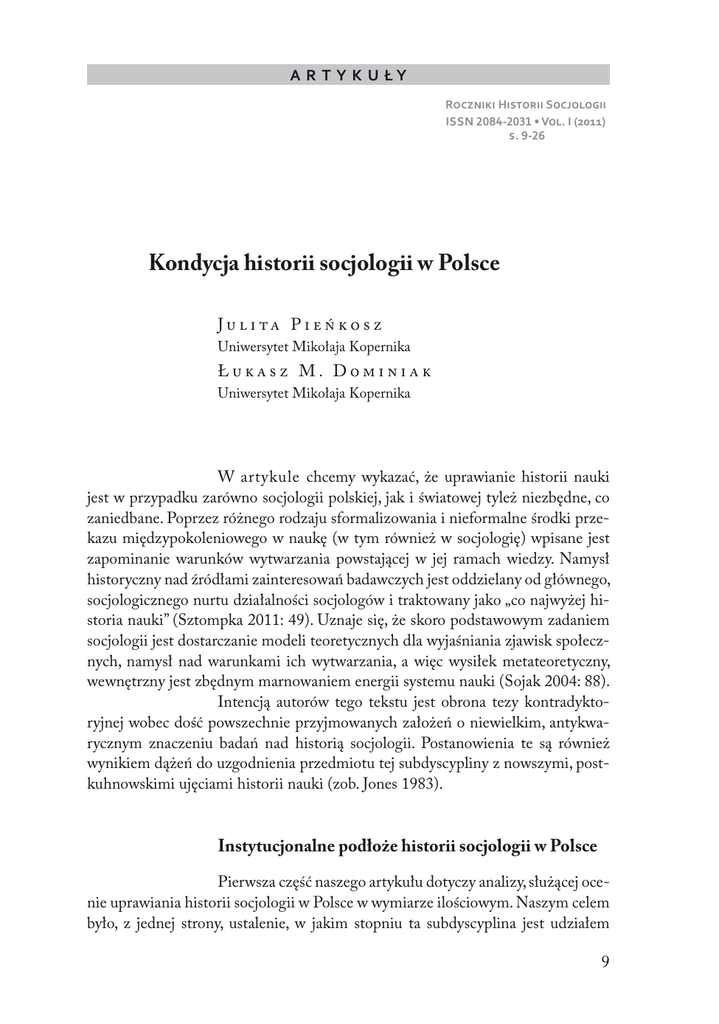 A R T Y K U ŁY R H S ISSN 8- • V. I (2011) . - Kondycja historii socjologii w Polsce J u l i ta P i e ń k o s z Uniwersytet Mikołaja Kopernika Łukasz M. Dominiak Uniwersytet Mikołaja Kopernika W artykule chcemy wykazać, że uprawianie historii nauki jest w przypadku zarówno socjologii polskiej, jak i światowej tyleż niezbędne, co zaniedbane. Poprzez różnego rodzaju sformalizowania i nieformalne środki przekazu międzypokoleniowego w naukę (w tym również w socjologię) wpisane jest zapominanie warunków wytwarzania powstającej w jej ramach wiedzy. Namysł historyczny nad źródłami zainteresowań badawczych jest oddzielany od głównego, socjologicznego nurtu działalności socjologów i traktowany jako „co najwyżej historia nauki” (Sztompka 2011: 49). Uznaje się, że skoro podstawowym zadaniem socjologii jest dostarczanie modeli teoretycznych dla wyjaśniania zjawisk społecznych, namysł nad warunkami ich wytwarzania, a więc wysiłek metateoretyczny, wewnętrzny jest zbędnym marnowaniem energii systemu nauki (Sojak 2004: 88). Intencją autorów tego tekstu jest obrona tezy kontradyktoryjnej wobec dość powszechnie przyjmowanych założeń o niewielkim, antykwarycznym znaczeniu badań nad historią socjologii. Postanowienia te są również wynikiem dążeń do uzgodnienia przedmiotu tej subdyscypliny z nowszymi, postkuhnowskimi ujęciami historii nauki (zob. Jones 1983). Instytucjonalne podłoże historii socjologii w Polsce Pierwsza część naszego artykułu dotyczy analizy, służącej ocenie uprawiania historii socjologii w Polsce w wymiarze ilościowym. Naszym celem było, z jednej strony, ustalenie, w jakim stopniu ta subdyscyplina jest udziałem 9 Julita Pieńkosz • Łukasz M. Dominiak polskiej socjologii w ogóle, z drugiej – w jaki sposób jest ona uprawiana. Do zmierzenia aktywności badawczej wzięliśmy pod uwagę kilka obszarów: czasopisma naukowe, antologie tekstów źródłowych, ilość uniwersyteckich katedr i zakładów zajmujących się historią socjologii oraz dydaktykę tej subdyscypliny. Czasopisma naukowe stanowią ten wymiar instytucjonalizacji danej nauki, dzięki któremu można określić poziom aktywności w różnych polach zainteresowań. Dla nas najważniejsze było uchwycenie tego, jak na tle różnorodnej tematyki socjologicznej wygląda zainteresowanie historią socjologii oraz w jaki sposób się o niej pisze. W tym celu dokonaliśmy analizy polskojęzycznych czasopism naukowych o szerokim profilu socjologicznym. Wykluczyliśmy wszystkie czasopisma tematyczne, jak również ukazujące się w innym języku niż polski. Analiza objęła łącznie 74 numery „Studiów Socjologicznych”, 40 numerów „Kultury i Społeczeństwa” oraz 30 „Przeglądu Socjologicznego” ukazujących się w latach 1989-2008 i dotyczyła tylko tych artykułów, które traktowały o historii socjologii sensu stricto. Nie uwzględnialiśmy tekstów dotyczących zagadnień związanych z historią myśli społecznej. Analizą objęliśmy artykuły naukowe oraz recenzje, biorąc pod uwagę tytuły, śródtytuły, treść oraz okoliczności, w jakich powstał tekst, czy dotyczył zagadnień związanych z teorią klasyków, ich biografią, kontekstem, w którym tworzyli oraz, czy obejmowały próbę określenia teoretyczno-metodologicznej ramy badania historii socjologii. Sprawdziliśmy 1 426 artykułów, w tym 739 w „Kulturze i Społeczeństwie” (KiS), 343 w „Studiach Socjologicznych” (SS) i 344 w „Przeglądzie Socjologicznym” (PS) oraz 636 recenzji, z czego w KiS 339, w SS 224 oraz w PS 74. Spośród wszystkich artykułów jedynie 27 poruszało kwestie związane z historią socjologii, recenzji książek dotyczących historii socjologii odnotowaliśmy 25. Największa ilość, 14 artykułów, pojawiła się w „Kulturze i Społeczeństwie”, to czasopismo zamieściło także najwięcej, 14 recenzji książek związanych z historią socjologii. W „Studiach Socjologicznych” 14 artykułów oraz 10 recenzji dotyczyło historii socjologii. W „Przeglądzie Socjologicznym” w ciągu prawie dwóch dekad odnotowaliśmy jedynie 1 artykuł oraz 1 recenzję. Należy jednak zaznaczyć, że od roku 2002 corocznie pojawiały się w Przeglądzie „Wyimki z kalendarza socjologii polskiej”, w których Włodzimierz Wincławski skrupulatnie odnotowywał te wydarzenia socjologii polskiej, które miały największy wpływ na jej rozwój. Materiały te z pewnością są wskaźnikiem otwarcia socjologii na swoją przeszłość, stanowią także cenne źródło faktów polskiej socjologii, o których rzadko możemy przeczytać w podręcznikach historii socjologii. Jest to bogaty materiał empiryczny, który w przyszłości może stać się punktem wyjścia do wielu analiz z zakresu historii socjologii polskiej. Jednak jako materiały źródłowe nie uwzględniliśmy tych publikacji w naszym zestawieniu, które prezentujemy w dalszej części tekstu. 10 Kondycja historii socjologii w Polsce Tab. 1. Porównanie ogólnej liczby artykułów i recenzji z ich liczbą poświęconą historii socjologii Łączna liczba artykułów Artykuły dotyczące HS Łączna liczba recenzji Recenzje dotyczące HS „Studia Socjologiczne” 343 (100%) 12 (3,5%) 224 (100%) 10 (4,5%) „Kultura i Społeczeństwo” 739 (100%) 14 (1,9%) 338 (100%) 14 (4,1%) „Przegląd Socjologiczny” 344 (100%) 1 (0,3%) 74 (100%) 1 (1,4%) Suma 1426 (100%) 27 (1,9%) 636 (100%) 25 (3,9%) Przegląd czasopism socjologicznych z jednej strony pozwolił określić stan historii socjologii w wymiarze ilościowym, z drugiej pomógł wskazać główne pola zainteresowań w obrębie historii socjologii, a więc odpowiedzieć na pytanie o sposoby narracji historii socjologii oraz wskazać tych klasyków, którzy są najbardziej popularni, czyli odpowiedzieć na pytania o kim się pisze i w jaki sposób. Najwięcej analizowanych artykułów dotyczyło klasyków polskich; Józefa Chałasińskiego
