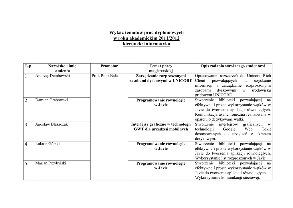 Wykaz tematów prac dyplomowych w roku akademickim 2011/2012 kierunek: informatyka 1 Nazwisko i imię studenta Andrzej Dembowski 2 Damian Grabowski 3 Jarosław Błaszczak 4 Łukasz Górski 5 Marian Przybylski L.p. Promotor Prof. Piotr Bała Temat pracy Opis zadania stawianego studentowi magisterskiej Opracowanie rozszerzeń do Unicore Rich Zarządzanie rozproszonymi pozwalających na uzyskanie zasobami dyskowymi w UNICORE Client informacji i zarządzanie rozproszonymi zasobami dyskowymi w środowisku gridowym UNICORE Stworzenie biblioteki pozwalającej na Programowanie równoległe efektywne i proste wykorzystanie wątków w w Javie Javie do tworzenia aplikacji równoległych. Komunikacja asynchroniczna realizowana w oparciu o dedykowane wątki. Interfejsy graficzne w technologii Stworzenie interfejsów graficznych w technologii Google Web Tokit GWT dla urządzeń mobilnych dostosowanych do urządzeń z ekranem dotykowym. Stworzenie biblioteki pozwalającej na Programowanie równoległe efektywne i proste wykorzystanie wątków w w Javie Javie do tworzenia aplikacji równoległych. Wykorzystanie list rozproszonych w Javie Stworzenie biblioteki pozwalającej na Programowanie równoległe efektywne i proste wykorzystanie wątków w w Javie Javie do tworzenia aplikacji równoległych. Wykorzystanie komunikacji sieciowej. 6 Mariusz Tycz 7 Piotr Sionkowski 1 Kuik Jakub 2 Łuczak Mateusz 3 Orzechowski Sebastian 4 Polak Radosław Webowy system konsultacji obrazów medycznych Modelowanie procesów kwantowych Dr Maria BerndtSchreiber Stworzenie rozproszonego systemu konsultacji obrazów medycznych z wykorzystaniem technologii webowych, rozproszonego dostępu i zaawansowanych możliwości kolejkowania zadań. Wykorzystanie zależnej od czasu dynamiki kwantowej do modelowania procesów kwantowych Analiza wybranych metod grafiki Przegląd wybranych algorytmów; komputerowej w powiązaniu implementacja w aplikacji własnej; z algorytmami przetwarzania przykładowe zastosowania. obrazów i zastosowanie do rewitalizacji obrazów Metody przetwarzania obrazu w technikach biometrycznych na przykładzie analizy linii papilarnych Przegląd wybranych algorytmów; implementacja w aplikacji własnej; przykładowe zastosowania. wybranych algorytmów; Metody ukrywania i odkrywania Analiza aplikacji własnej; informacji obrazowej w obrazach implementacja w przykładowe zastosowania. cyfrowych Metody przetwarzania obrazu w technikach biometrycznych na przykładzie analizy kształtów twarzy Przegląd wybranych algorytmów; implementacja w aplikacji własnej; przykładowe zastosowania. 5 Socha Mateusz 1 Derkowski Kamil 2 Kwiatkowski Paweł 3 Kwiatkowski Tomasz Dr Andrzej Kurpiel Metody segmentacji obrazu w technikach biometrycznych na przykładzie analizy danych biomedycznych Przegląd i analiza wybranych algorytmów; implementacja w aplikacji własnej; przykładowe zastosowania. Uwierzytelnianie użytkowników w Sieci Lokalnej Na podstawie analizy istniejących metod uwierzytelniania użytkowników w Sieci Lokalnej (Ldap, Active Directory, Radius itp.) utworzyć narzędzie umożliwiające współpracę tych metod w zakresie łatwego wpółdzielenia i wymiany danych. Porównanie istniejących metod zdalnej instalacji systemu operacyjnego ( Linux, Solaris, Windows). Przygotowanie jednorodnego środowiska zdalnej instalacji zawierającego automatyczne zbieranie informacji o komputerach w sieci, tworzącego wspólną konfigurację dla wybranej grupy komputerów i instalującego wybrany system operacyjny na wybranej grupie maszyn. Metody przechowywania danych użytkownika na różnych urządzeniach zewnętrznych komputera (dyski, pamięci zewnętrzne, urządzenia mobilne) oraz na dyskach sieciowych (w chmurze). Analiza tych metod pod kątem dostępności, wydajności, kosztów oraz bezpieczeństwa. Utworzenie oprogramowania będącego „interfejsem graficznym” do wykorzystania tych metod. Automatyczna instalacja i uaktualnianie systemów operacyjnych Synchronizacja danych w sieci 4 Oparka Jarosław 5 Radoszewski Marcin 6 Stasiak Karol 7 Wróblewski Andrzej Analiza jądra systemu operacyjnego w Jądro systemu jako źródło podatności na błędy zagrożeń dla systemu operacyjnego zakresie programistyczne i ataki na jadro. Porównanie metod ochrony jądra i reagowania na błędy i ataki w popularnych systemach operacyjnych (Linux, Windows, Solaris). Przygotowanie własnego modułu jądra realizującego obronę przed przykładowym atakiem. Analiza protokołów UNPN oraz DLNA w Multimedia w Sieci Lokalnej zakresie przygotowania Sieci Lokalnej do strumieniowania multimediów i wykorzystania nowoczesnych rozwiązań sprzętowych w tym zakresie. Porównanie istniejących rozwiązań programistycznych ( serwery, kontrolery, „renderery” ) oraz przygotowanie własnego klienta DLNA. Porównanie różnych wersji protokołu Gromadzenie, przesyłanie i prezentowanie danych o ruchu NetFlow służącego badaniu przepływu w sieci. Przygotowania aplikacji analizującej i w sieci prezentującej dane zgromadzone przez programy „eksportera”, „kolektora” i „analizatora” NetFlow. Przygotowanie „rozszerzenia” protokołu Zdalne zarządzanie usługami SNMP o możliwość zarządzania sieciowymi i monitorowania wybranych serwerów usług sieciowych za pomocą zdalnej konsoli administratora. Oprogramowanie konsoli graficznej administratora oraz agenta realizującego polecenia przekazywane z konsoli. 1 Fabiszewski Mariusz dr Mirosława Skowrońska Planowanie gier terenowych z wykorzystaniem algorytmów szeregowania zadań 2 Moczadło Błażej Zastosowanie grafów do przetwarzania obrazów 3 Stankowski Michał Algorytmy heurystyczne w transporcie miejskim 1 Małgorzata Baron 2 Gabriel Filipiak Dr Piotr Wiśniewski Składowanie obrazowań medycznych ze wsparciem dla indeksowań metadanych Integracja dynamicznego SQL z odwzorowaniami obiektowo relacyjnymi Stworzenie aplikacji, która pozwala zaplanować przebieg gry terenowe