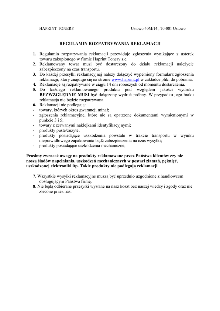 HAPRINT TONERY Ustowo 40M/14 , 70-001 Ustowo REGULAMIN ROZPATRYWANIA REKLAMACJI 1. Regulamin rozpatrywania reklamacji przewiduje zgłoszenia wynikające z usterek towaru zakupionego w firmie Haprint Tonery s.c. 2. Reklamowany towar musi być dostarczony do działu reklamacji należycie zabezpieczony na czas transportu. 3. Do każdej przesyłki reklamacyjnej należy dołączyć wypełniony formularz zgłoszenia reklamacji, który znajduje się na stronie www.haprint.pl w zakładce pliki do pobrania. 4. Reklamacje są rozpatrywane w ciągu 14 dni roboczych od momentu dostarczenia. 5. Do każdego reklamowanego produktu pod względem jakości wydruku BEZWZGLĘDNIE MUSI być dołączony wydruk próbny. W przypadku jego braku reklamacja nie będzie rozpatrywana. 6. Reklamacji nie podlegają: - towary, których okres gwarancji minął; - zgłoszenia reklamacyjne, które nie są opatrzone dokumentami wymienionymi w punkcie 3 i 5; - towary z zerwanymi naklejkami identyfikacyjnymi; - produkty puste/zużyte; - produkty posiadające uszkodzenia powstałe w trakcie transportu w wyniku nieprawidłowego zapakowania bądź zabezpieczenia na czas wysyłki; - produkty posiadające uszkodzenia mechaniczne; Prosimy zwracać uwagę na produkty reklamowane przez Państwa klientów czy nie noszą śladów napełniania, uszkodzeń mechanicznych w postaci złamań, pęknięć, uszkodzonej elektroniki itp. Takie produkty nie podlegają reklamacji. 7. Wszystkie wysyłki reklamacyjne muszą być uprzednio uzgodnione z handlowcem obsługującym Państwa firmę. 8. Nie będą odbierane przesyłki wysłane na nasz koszt bez naszej wiedzy i zgody oraz nie zlecone przez nas.