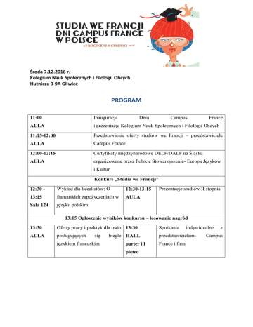 Środa 7.12.2016 r. Kolegium Nauk Społecznych i Filologii Obcych Hutnicza 9-9A Gliwice PROGRAM 11:00 Inauguracja Dnia Campus France AULA i prezentacja Kolegium Nauk Społecznych i Filologii Obcych 11:15-12:00 Przedstawienie oferty studiów we Francji – przedstawiciele AULA Campus France 12:00-12:15 Certyfikaty międzynarodowe DELF/DALF na Śląsku AULA organizowane przez Polskie Stowarzyszenie- Europa Języków i Kultur Konkurs „Studia we Francji” 12:30 - Wykład dla licealistów: O 12:30-13:15 13:15 francuskich zapożyczeniach w AULA Sala 124 języku polskim Prezentacje studiów II stopnia 13:15 Ogłoszenie wyników konkursu – losowanie nagród 13:30 Oferty pracy i praktyk dla osób 13:30 Spotkania AULA posługujących przedstawicielami się językiem francuskim biegle HALL parter i I piętro France i firm indywidualne z Campus