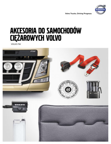 Volvo Trucks. Driving Progress AKCESORIA DO SAMOCHODÓW CIĘŻAROWYCH VOLVO VOLVO FM 3–6 7–16 Dbałość o szczegóły Elementy zewnętrzne Kabina Oświetlenie Koła Podwozie 17–23 Wnętrze Komfort Schowki 24–29 Komunikacja i systemy elektroniczne 30–31 2 Zalecane dodatki Jak zmienić samochód ciężarowy w prawdziwego przyjaciela w drodze. Dla niektórych życie w drodze to coś więcej niż praca. Zgadzamy się z tym. Wielu kierowców postrzega swój samochód ciężarowy jako dobrego przyjaciela albo biuro na kołach. A jak to jest z Tobą? Oto akcesoria, które pozwolą Ci zmaterializować swoje podejście. Dodatki, za pomocą których dostosujesz Volvo FM do swoich wymagań, potrzeb i przyzwyczajeń. Pakiet oprogramo wania I-Shift i zestaw spoilerów, które zaoszczędzą Twoje paliwo. Dodatkowe światła i rozwiązania, które ułatwią Ci pracę i uczynią ją bezpieczniejszą. Wszystko wpływa na wzrost efektywności Twojej pracy i rentowności Twojej firmy. Sprzyja temu także przytulność i komfort kabiny – wystarczy kilka drobiazgów, takich jak schowki czy zasłony leżanki. Dzięki nim Twój samochód ciężarowy stanie się Twoim bliskim przyjacielem. Oczywiście, jeżeli zależy Ci na absolutnej wyjątkowości pojazdu, same akcesoria Volvo nie wystarczą. Ale stanowią naturalny punkt wyjścia. 3 4 5 Zadbaj o siebie. Witamy w katalogu akcesoriów do samochodów ciężarowych Volvo. Znajdziesz tu szeroką gamę wyposażenia, dzięki któremu precyzyjnie dostosujesz samochód ciężarowy do swoich zadań transportowych – i swojej osobowości, jeżeli tego pragniesz. Jedno jest pewne: na akcesoriach do samochodów ciężarowych Volvo możesz polegać. Każdy opracowany lub wybrany przez nas produkt spełnia rygorystyczne wymagania Volvo dotyczące jakości i bezpieczeństwa. Pasuje idealnie, ponieważ został zaprojektowany specjalnie z myślą o pojazdach Volvo. Wybór należy do Ciebie. 6 Kabina Elementy zewnętrzne ZESTAW SPOILERÓW SPOILERY BOCZNE KABINY SPOILER DACHOWY Zestaw spoilerów obejmuje spoiler dachowy i spoilery boczne kabiny. Aby zapewnić jak największe oszczędności paliwa, spoiler został poddany wszechstronnym testom w tunelu aerodynamicznym oraz rzeczywistych warunkach drogowych. Spoilery boczne kabiny są zasadniczym elementem zestawu spoilerów kabiny. Zastosowanie spoilerów bocznych kabiny w połączeniu ze spoilerem dachowym pozwala uzyskać znacznie mniejszy opór powietrza, co skutkuje niższym zużyciem paliwa. Spoiler dachowy zmniejsza opór powietrza i jest zasadniczym elementem zestawu spoilerów kabiny. CECHY I KORZYŚCI CECHY I KORZYŚCI • Duży potencjał oszczędności paliwa • Mniejsza emisja spalin • Zharmonizowany kształt, zaprojektowany specjalnie dla kabin Volvo • Duży potencjał oszczędności paliwa • Mniejsza emisja spalin • Zharmonizowany kształt, zaprojektowany specjalnie dla kabin Volvo CECHY I KORZYŚCI • Duży potencjał oszczędności paliwa • Mniejsza emisja spalin • Zharmonizowany kształt, zaprojektowany specjalnie dla kabin Volvo 7 Elementy zewnętrzne Kabina PRZEDNIA DOLNA OSŁONA Przednia dolna osłona dla dodatkowej ochrony i montażu dodatkowych reflektorów. Dostępne są wsporniki dla dwóch rodzajów reflektorów: dużych reflektorów ksenonowych/LED lub reflektorów o mniejszych wymiarach. CECHY I KORZYŚCI • Skuteczniejsza ochrona w przypadku zderzenia z dzikim zwierzęciem • Odporna na korozję • Doskonałe miejsce do montażu dodatkowych reflektorów • Idealnie dopasowany WSPORNIK DACHOWY DLA POJAZDÓW ZE SPOILERAMI LUB BEZ SPOILERÓW WSPORNIK DACHOWY DLA POJAZDÓW BEZ SPOILERÓW Wytrzymały aluminiowy wspornik zapewnia szerokie możliwości montażu akcesoriów na dachu kabiny, takich jak np. dodatkowe reflektory i światła ostrzegawcze. Dla każdego z akceso riów dostępny jest zestaw montażowy zawie rający odpowiednie uchwyty. Spełnia wysokie standardy Volvo dotyczące szczelności kabiny. Przeznaczony dla samochodów ciężarowych bez spoilerów kabiny. Wytrzymały aluminiowy wspornik zapewnia szerokie możliwości montażu akceso riów na dachu kabiny, takich jak np. dodatkowe reflektory i światła ostrzegawcze. Dla każdego z akcesoriów dostępny jest zestaw montażowy za wierający odpowiednie uchwyty. Spełnia wysokie standardy Volvo dotyczące szczelności kabiny. CECHY I KORZYŚCI • Łatwy montaż dodatkowego wyposażenia na dachu kabiny • Montowany w sposób gwarantujący szczelność kabiny • Dostarczany w komplecie z elementami mocującymi i instrukcją montażu • Niewielki wpływ na aerodynamikę i masę pojazdu 8 CECHY I KORZYŚCI • Łatwy montaż dodatkowego wyposażenia na dachu kabiny • Montowany w sposób gwarantujący szczelność kabiny • Dostarczany w komplecie z elementami mocującymi i instrukcją montażu • Niewielki wpływ na aerodynamikę i masę pojazdu WSPORNIK NA DACHU KABINY: TYLNY Tylny wspornik na akcesoria na dachu kabiny wydatnie ułatwia rozmieszczanie i montaż akcesoriów, takich jak np. pneumatyczne sygnały dźwiękowe, lampy ostrzegawcze czy reflektory dalekosiężne. CECHY I KORZYŚCI • Łatwe rozmieszczanie i montaż akcesoriów • Wykonany z wyciskanego aluminium – dopuszczalne obciążenie maks. 10 kg Kabina SIATKA CHRONIĄCA PRZED OWADAMI Siatka ochronna zapobiegająca zatykaniu chłodnicy przez owady. Osłona jest łatwa w czyszczeniu. Wystarczy podnieść górną przednią pokrywę i spłukać osłonę od dołu. CECHY I KORZYŚCI • Zapobiega wpadaniu owadów do wnętrza chłodnicy • Zwiększa skuteczność chłodzenia silnika • Zwiększa trwałość chłodnicy • Szybka i łatwa w czyszczeniu SPOILER POD ZDERZAKIEM Spoiler pod zderzakiem polepsza aerodynamikę pojazdu i pozwala zaoszczędzić paliwo. Dostarczany w stanie nie lakierowanym lub z powierzchnią szarą teksturowaną. Elementy zewnętrzne PNEUMATYCZNY SYGNAŁ DŹWIĘKOWY, MONTOWANY NA DACHU Elektrycznie sterowany pneumatycz