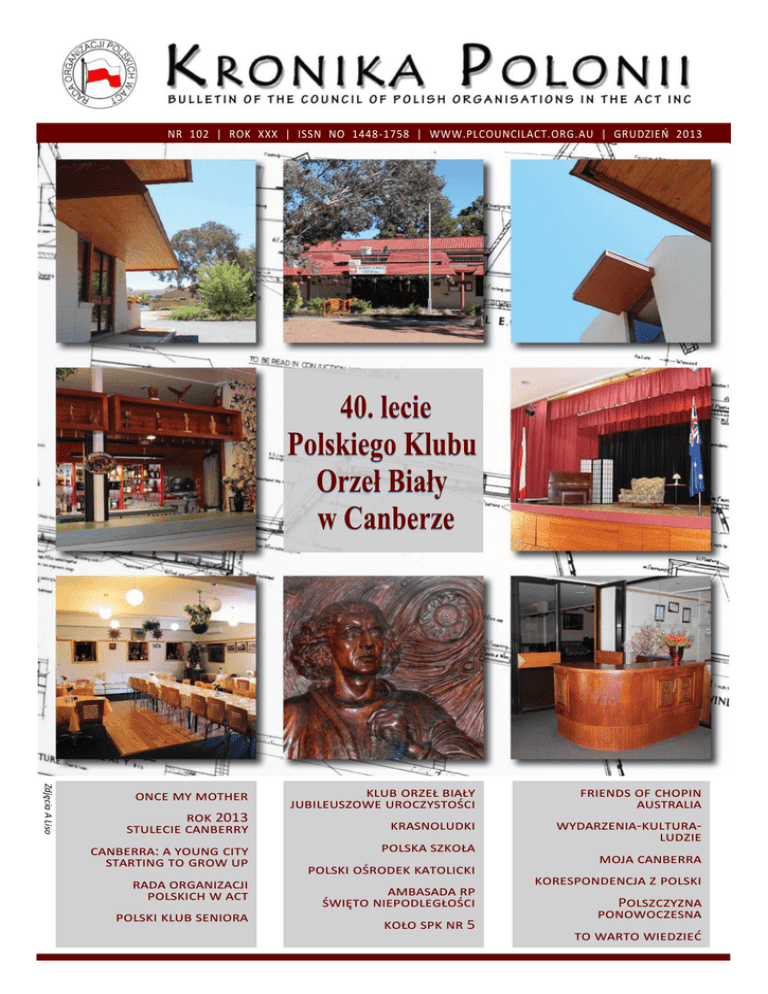 NR 102 | ROK XXX | ISSN NO 1448 -1758 | WWW.PLCOUNCILACT.ORG.AU | GRUDZIEŃ 2013 Zdjęcia A Liso once my mother klub orzeł biały jubileuszowe uroczystości friends of chopin australia rok 2013 stulecie canberry krasnoludki wydarzenia-kulturaludzie canberra: a young city starting to grow up rada organizacji polskich w act polski klub seniora polska szkoła polski ośrodek katolicki ambasada rp święto niepodległości koło spk nr 5 moja canberra korespondencja z polski Polszczyzna ponowoczesna to warto wiedzieć Od Redakcji Kontakty Polonijne Aleksandra Płazińska Drodzy Czytelnicy, Dzięki dotacjom prywatnym i grantom jakie otrzymaliśmy w tym roku, zdecydowaliśmy się raz jeszcze na druk Kroniki w kolorze. W tym numerze kończymy temat stulecia Canberry – zapraszamy do przeczytania drugiej części historii Canberry, sprawozdania z jubileuszowych wydarzeń oraz wspomnień o bardzo młodej stolicy z lat 40. i 50. Jako społeczność polonijna Canberry też mieliśmy w tym roku ważne powody do świętowania – 40. rocznicę powstania Klubu Orzeł Biały oraz 20. rocznicę otwarcia Ośrodka Duszpasterskiego w Narrabundah. Obydwie rocznice były doskonałą okazją do wspomnień o wydarzeniach sprzed lat i ludziach biorących w nich udział. Każda domaga się szerszego opracowania, na łamach Kroniki mogliśmy zamieścić tylko krótkie informacje na ten temat. Jak zwykle są też wiadomości o działalności organizacji polonijnych w ACT. Staraliśmy się nadać temu numerowi jak najbardziej świąteczny charakter i mamy nadzieję, że spodoba się naszym Czytelnikom. Z okazji zbliżających się Świąt życzymy wszystkim przeżywania Bożego Narodzenia w zdrowiu, radości i ciepłej rodzinnej atmosferze. Kolejny zaś rok niech będzie czasem pokoju oraz realizacji osobistych zamierzeń. Fundusz Kroniki DOTACJE $50 $30 $20 $10 Roman Wnęk, Zofia Radziszewska i Peter Roberts, Irena Tomaszewska Dorota Janiszewska anonimowo, Teresa Wojkowska, Ewa Starczewska, Eta Rogoyska, Bożena Bełżowska, Halina i Jan Mirosowie, Małgorzata i Wiesław Sokołowscy Krzysztof Klimek Wszystkim ofiarodawcom Redakcja składa serdeczne podziękowania. Czeki na Fundusz Kroniki prosimy wystawiać na Council of Polish Organisations in ACT PO Box 6093 O’Connor ACT 2602 z koniecznym zaznaczeniem na odwrocie czeku oraz kopercie ‘POLISH CHRONICLE’. Osoby pragnące dokonać wpłat gotówką na Fundusz Kroniki prosimy o skontaktowanie się z Wandą Całką tel. 6248 6842. Rada Organizacji Polskich dziękuje panu Wiesławowi Królikowskiemu, za przekazanie sprzętu oraz nagrań ze studia radiowego, po zamknięciu audycji polskojęzycznej (CMS Community Radio). Kasety i dyski będą udostępnione w bibliotece KOB a sprzęt wykorzystany przez redakcję KP. Rada Organizacji Polskich w ACT Rej. Council of Polish Organisations in the ACT Inc. Prezes: Andrzej Alwast 6161 1044| [email protected] Sekretarz: Aleksandra Płazińska 0403 721021 Sekretarz: Małgorzata Anczewska 0406 592 388 Skarbnik: Edward Sulikowski 6295 7855 Kronika Polonii / Polish Chronicle [email protected] Redaktor: Aleksandra Płazińska 0403 721021 Koordynator: Wanda Kiljańska-Całka 6248 6842 Klub Orzeł Biały / Polish Australian White Eagle Club Prezes: Barbara Alwast 0430 277 440 Wiceprezes: Andrzej Bajkowski 0423 961 503 www.whiteeagleclub.org.au Dom im. Mikołaja Kopernika 38 David Street, Turner ACT 2612 PO Box 6093 O’Connor ACT 2602 Stowarzyszenie Polskich Kombatantów Koło Nr 5 Polish Ex-Servicemen’s Association in Australia Branch No 5 Prezes: Andrzej Alwast 6161 0144 www.spkcanberra.org.au | 38 David Street, Turner ACT 2612 Polska Szkoła Przedmiotów Ojczystych w Phillip Polish Language School in Phillip Kierowniczka: Barbara Peters 0479 131 314 [email protected] www.polishlanguageschoolcanberra.weebly.com Grupa przedszkolna ‘Krasnoludki’ w Canberze Polish Playgroup in Canberra Koordynator: Katarzyna Mikołajczak 0418 633 378 Grupa Taneczna Wielkopolska / Wielkopolska Polish Dance Group www.wielkopolska.websyte.com.au Towarzystwo Sztuk Pięknych w Canberze/Polish Art and Craft Society Przewodnicząca: Eta Rogoyska 6242 9013 Polski Instytut Historyczny w Australii Polish Historical Institute of Australia Dyrektor: Wanda Horky 6259 5099 | [email protected] Polskie Centrum Katolickie im. Jana Pawła II / Polish Catholic Centre Ks. Edmund Budziłowicz 6295 2603 0401 305 048 [email protected] | www.tchr.org/australia 211 Goyder Street, Narrabundah ACT 2604 Australijsko Polska Rada Biznesu Rej. Australia Poland Business Council Inc. Sekretarz: Eugeniusz Bajkowski 6249 6128 | [email protected] Polski Klub Seniora w ACT Rej. / Polish Seniors Club in the ACT Inc. Prezes: Maja Bogatko 6299 2884 Australijski Instytut Spraw Polskich Australian Institute of Polish Affairs (AIPA) Wiceprezes: Aleksander M. Gancarz 6161 8654 [email protected] | http://www.aipa.net.au Towarzystwo Przyjaciół Chopina, Australia Friends of Chopin Australia Inc. Prezes: Wanda Horky 6259 5099 | [email protected] Sekretarz: Ben James 0466 620 825 [email protected] Kronika Polonii Council of Polish Organisations in the ACT Inc. PO Box 6093 O’Connor ACT 2602 Print Post Approved PP229219/00019 Wydawca: Rada Organizacji Polskich w ACT Rej. Zespół Redakcyjny Redaktor: Aleksandra Płazińska Koordynator: Wanda Kiljańska-Całka Korekta: Majka Woźniak Granty: Małgorzata Anczewska Szata graficzna: Monika McKinlay, Agnieszka Liso Oficjalne zdjęcia: M. McKinlay, A. Płazińska Współpraca: Iwona Żórawska Nakład: 600 egzemplarzy Internet: www.plcouncilact.org.au E-mail: [email protected] Publikowane materiały wyrażają opinie ich autorów, niekoniecznie zgodne z opinią redakcji. Redakcja nie ponosi odpowiedzialności za treść oraz ewentualne nieścisłości czy błędy, zastrzega sobie prawo do skrótów i zmian. W związku z ograniczeniami objętości i formatu Kroniki, Redakcja zastrzega sobie prawo wyboru tekstów dopuszczonych do druku. Kronika P