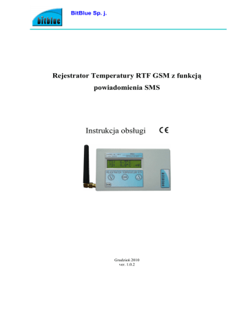 BitBlue Sp. j. Rejestrator Temperatury RTF GSM z funkcją powiadomienia SMS Instrukcja obsługi Grudzień 2010 ver. 1.0.2 Rejestrator Temperatury RTF GSM Wersja 1.0.2 BitBlue Sp. j. 43-267 Suszec ul. św. Jana 33 http://www.bitblue.pl [email protected] Firma BitBlue podjęła wszelkie działania aby informacje, które zawiera niniejsza informacja aby były kompletne i dokładne, jednak ani producent ani dostawca urządzenia nie przyjmują odpowiedzialności za błędy i pominięcia. Producent i dostawca urządzenie nie przyjmują Ŝadnej odpowiedzialności za szkody wynikłe z nieprawidłowego działania lub uszkodzeń urządzenia lub jego oprogramowania. Producent zastrzega sobie prawo zmiany specyfikacji urządzenia i oprogramowania opisanego w instrukcji w dowolnym czasie. Copyright © 2009-2010 BitBlue sp.j. Wszelkie prawa zastrzeŜone Produkt POLSKI -2- Rejestrator Temperatury RTF GSM Wersja 1.0.2 SPIS TREŚCI 1. Opis ogólny ......................................................................................................................................................... 4 1.1. WyposaŜenie .............................................................................................................................................. 4 2. Instalacja.............................................................................................................................................................. 4 2.1. Instalacja karty SIM ................................................................................................................................... 4 2.2. Instalacja anteny GSM ............................................................................................................................... 5 2.3. Współpraca z kartami SIM......................................................................................................................... 5 2.4. Warunki bezpieczeństwa............................................................................................................................ 5 2.5. Lokalizacja anteny GSM............................................................................................................................ 5 3. Opis wyprowadzeń urządzenia ............................................................................................................................ 6 3.1. Zasilanie..................................................................................................................................................... 6 3.2. Gniazdo karty SIM..................................................................................................................................... 6 3.3. Gniazdo anteny GSM................................................................................................................................. 6 4. Obsługa urządzenia.............................................................................................................................................. 7 4.1. Zasada działania......................................................................................................................................... 7 4.2. Odczyt aktualnej daty i czasu..................................................................................................................... 7 4.3. Przeglądanie archiwum .............................................................................................................................. 8 4.4. Znaczenie symboli graficznych.................................................................................................................. 8 4.5. Wiadomości SMS ...................................................................................................................................... 8 4.6. Wyłącznie urządzenia ................................................................................................................................ 9 5. Konfiguracja urządzenia.................................................................................................................................... 10 6. Dane techniczne................................................................................................................................................. 11 7. Informacje o bezpieczeństwie............................................................................................................................ 13 7.1. Wymagania ogólne. ................................................................................................................................. 13 -3- Rejestrator Temperatury RTF GSM Wersja 1.0.2 1. Opis ogólny RTF jest urządzeniem słuŜącym do ciągłego pomiaru temperatury w zakresie –40 do 100°C z rozdzielczością 0,1°C. Pomiar dokonywany jest w jednym lub dwóch punktach (dwa czujniki). RTF posiada zegar czasu rzeczywistego RTC. Rejestracja temperatury odbywa się o pełnych godzinach z nastawnym interwałem czasowym co 1, 2, 3, 4, 5, 6 godzin. Pamięć wewnętrzna pozwala na zapamiętanie 200 temperatur z kaŜdego czujnika wraz z datą oraz godziną dokonania pomiaru. Dzięki wyposaŜeniu rejestratora w moduł GSM moŜliwa jest zdalna kontrola chwilowych temperatur za pomocą komunikatów SMS. Chcąc skorzystać z tej funkcji naleŜy wybrać numer telefoniczny rejestratora (karty SIM włoŜonej do slotu od dołu RTF), po pierwszym sygnale dzwonienia pojawi się sygnał zajętości i po ok. 30s rejestrator wyśle SMSa na numer tel. komórkowego z którego próbowano się dodzwonić. Dodatkowo, w sytuacji przekroczenia alarmowej temperatury, zaniku napięcia zasilania RTF wysyła na zapamiętany numer tel. informację o aktualnych temperaturach oraz o braku zasilania. Urządzenie jest wyposaŜone w moduł bateryjny, który pozwala na pracę do 48 godzin bez zasilania sieciowego. 1.1. WyposaŜenie 2. - Instrukcja obsługi (wersja elektroniczna) - Stabilizowany zasilacz 12V - Rejestrator RTF z mod