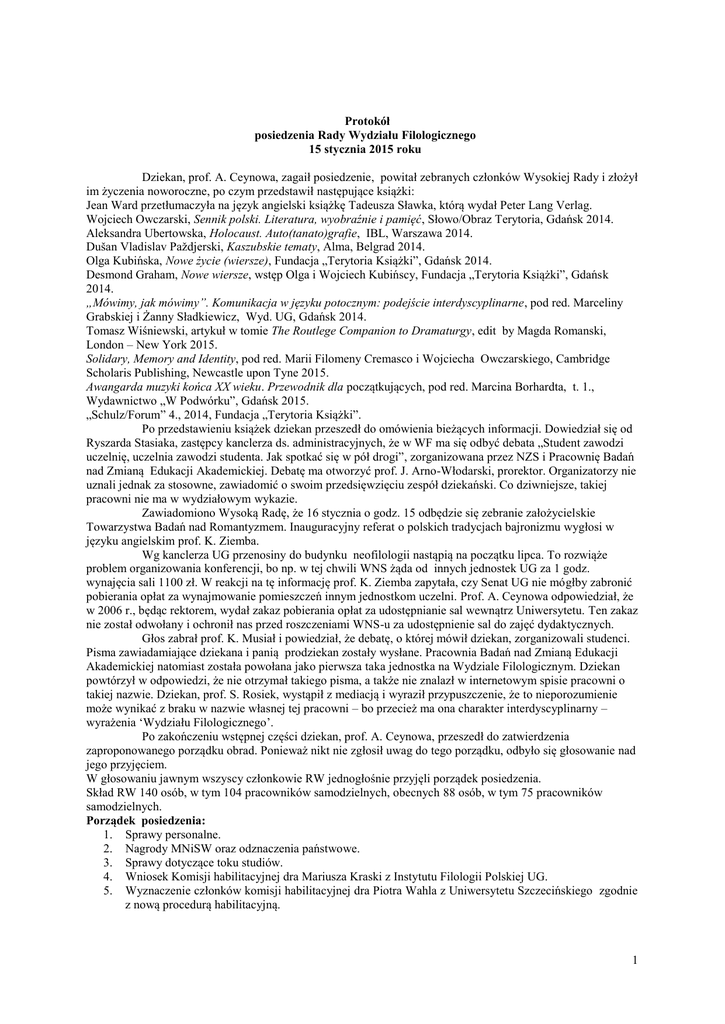 Protokół posiedzenia Rady Wydziału Filologicznego 15 stycznia 2015 roku Dziekan, prof. A. Ceynowa, zagaił posiedzenie, powitał zebranych członków Wysokiej Rady i złożył im życzenia noworoczne, po czym przedstawił następujące książki: Jean Ward przetłumaczyła na język angielski książkę Tadeusza Sławka, którą wydał Peter Lang Verlag. Wojciech Owczarski, Sennik polski. Literatura, wyobraźnie i pamięć, Słowo/Obraz Terytoria, Gdańsk 2014. Aleksandra Ubertowska, Holocaust. Auto(tanato)grafie, IBL, Warszawa 2014. Dušan Vladislav Paždjerski, Kaszubskie tematy, Alma, Belgrad 2014. Olga Kubińska, Nowe życie (wiersze), Fundacja „Terytoria Książki”, Gdańsk 2014. Desmond Graham, Nowe wiersze, wstęp Olga i Wojciech Kubińscy, Fundacja „Terytoria Książki”, Gdańsk 2014. „Mówimy, jak mówimy”. Komunikacja w języku potocznym: podejście interdyscyplinarne, pod red. Marceliny Grabskiej i Żanny Sładkiewicz, Wyd. UG, Gdańsk 2014. Tomasz Wiśniewski, artykuł w tomie The Routlege Companion to Dramaturgy, edit by Magda Romanski, London – New York 2015. Solidary, Memory and Identity, pod red. Marii Filomeny Cremasco i Wojciecha Owczarskiego, Cambridge Scholaris Publishing, Newcastle upon Tyne 2015. Awangarda muzyki końca XX wieku. Przewodnik dla początkujących, pod red. Marcina Borhardta, t. 1., Wydawnictwo „W Podwórku”, Gdańsk 2015. „Schulz/Forum” 4., 2014, Fundacja „Terytoria Książki”. Po przedstawieniu książek dziekan przeszedł do omówienia bieżących informacji. Dowiedział się od Ryszarda Stasiaka, zastępcy kanclerza ds. administracyjnych, że w WF ma się odbyć debata „Student zawodzi uczelnię, uczelnia zawodzi studenta. Jak spotkać się w pół drogi”, zorganizowana przez NZS i Pracownię Badań nad Zmianą Edukacji Akademickiej. Debatę ma otworzyć prof. J. Arno-Włodarski, prorektor. Organizatorzy nie uznali jednak za stosowne, zawiadomić o swoim przedsięwzięciu zespół dziekański. Co dziwniejsze, takiej pracowni nie ma w wydziałowym wykazie. Zawiadomiono Wysoką Radę, że 16 stycznia o godz. 15 odbędzie się zebranie założycielskie Towarzystwa Badań nad Romantyzmem. Inauguracyjny referat o polskich tradycjach bajronizmu wygłosi w języku angielskim prof. K. Ziemba. Wg kanclerza UG przenosiny do budynku neofilologii nastąpią na początku lipca. To rozwiąże problem organizowania konferencji, bo np. w tej chwili WNS żąda od innych jednostek UG za 1 godz. wynajęcia sali 1100 zł. W reakcji na tę informację prof. K. Ziemba zapytała, czy Senat UG nie mógłby zabronić pobierania opłat za wynajmowanie pomieszczeń innym jednostkom uczelni. Prof. A. Ceynowa odpowiedział, że w 2006 r., będąc rektorem, wydał zakaz pobierania opłat za udostępnianie sal wewnątrz Uniwersytetu. Ten zakaz nie został odwołany i ochronił nas przed roszczeniami WNS-u za udostępnienie sal do zajęć dydaktycznych. Głos zabrał prof. K. Musiał i powiedział, że debatę, o której mówił dziekan, zorganizowali studenci. Pisma zawiadamiające dziekana i panią prodziekan zostały wysłane. Pracownia Badań nad Zmianą Edukacji Akademickiej natomiast została powołana jako pierwsza taka jednostka na Wydziale Filologicznym. Dziekan powtórzył w odpowiedzi, że nie otrzymał takiego pisma, a także nie znalazł w internetowym spisie pracowni o takiej nazwie. Dziekan, prof. S. Rosiek, wystąpił z mediacją i wyraził przypuszczenie, że to nieporozumienie może wynikać z braku w nazwie własnej tej pracowni – bo przecież ma ona charakter interdyscyplinarny – wyrażenia ‘Wydziału Filologicznego’. Po zakończeniu wstępnej części dziekan, prof. A. Ceynowa, przeszedł do zatwierdzenia zaproponowanego porządku obrad. Ponieważ nikt nie zgłosił uwag do tego porządku, odbyło się głosowanie nad jego przyjęciem. W głosowaniu jawnym wszyscy członkowie RW jednogłośnie przyjęli porządek posiedzenia. Skład RW 140 osób, w tym 104 pracowników samodzielnych, obecnych 88 osób, w tym 75 pracowników samodzielnych. Porządek posiedzenia: 1. Sprawy personalne. 2. Nagrody MNiSW oraz odznaczenia państwowe. 3. Sprawy dotyczące toku studiów. 4. Wniosek Komisji habilitacyjnej dra Mariusza Kraski z Instytutu Filologii Polskiej UG. 5. Wyznaczenie członków komisji habilitacyjnej dra Piotra Wahla z Uniwersytetu Szczecińskiego zgodnie z nową procedurą habilitacyjną. 1 Powołanie zespołu do przygotowania projektów uchwał w toku postępowania o nadanie tytułu naukowego profesora dr hab. Wojciechowi Owczarskiemu, prof. UG, z Instytutu Filologii Polskiej. 7. Sprawozdawczość naukowa. 8. Sprawy doktorskie. 9. Sprawy filologicznych studiów doktoranckich ― zmiana regulaminu podziału środków na badania dla młodych naukowców. 10. Pracownie i zespoły badawcze. 11. Zatwierdzenie protokołu posiedzenia Rady Wydziału z 4 grudnia 2014 r. 12. Sprawy bieżące i wolne wnioski. Ad 1. Sprawy personalne. Skład RW 140 osób, w tym 104 pracowników samodzielnych, obecnych 88 osób, w tym 75 pracowników samodzielnych. 1. 1. Zatrudnienie: a. prof. dr hab. Jan Ciechowicz – w związku z uzyskaniem uprawnień emerytalnych zatrudnienie na stanowisku profesora zwyczajnego w Instytucie Filologii Polskiej na umowę o pracę od 02.02.2015 r. do ukończenia 70. roku życia. W głosowaniu tajnym wszyscy członkowie RW: 78 – za, 1 – przeciw, 1 się wstrzymał. RW wyraziła zgodę na zatrudnienie. b. Prof. UG, dr hab. Hieronim Chojnacki – w związku z uzyskaniem uprawnień emerytalnych zatrudnienie na stanowisku profesora nadzwyczajnego UG w Instytucie Skandynawistyki i Lingwistyki Stosowanej na umowę o pracę od 02.02.2015 r. do ukończenia 70. roku życia. W głosowaniu tajnym wszyscy członkowie RW: 79 – za, nikt nie był przeciwny, 1 się wstrzymał. RW wyraziła zgodę na zatrudnienie. c. Dr hab. Hanna Dymel-Trzebiatowska – zatrudnienie na stanowisku profesora nadzwyczajnego UG w Instytucie Skandy