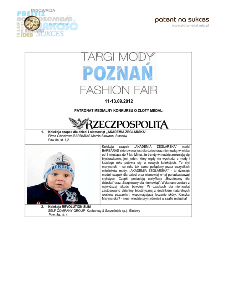 11-13.09.2012 PATRONAT MEDIALNY KONKURSU O ZŁOTY MEDAL: 1. Kolekcja czapek dla dzieci i niemowląt „AKADEMIA śEGLARSKA” Firma OdzieŜowa BARBARAS Marcin Skowron, Staszów Paw.8a, st. 1,2 Kolekcja czapek „AKADEMIA śEGLARSKA” marki BARBARAS skierowana jest dla dzieci oraz niemowląt w wieku od 1 miesiąca do 7 lat. Mimo, Ŝe trendy w modzie zmieniają się błyskawicznie, jest jeden, który nigdy nie wychodzi z mody i kaŜdego roku pojawia się w nowych kolekcjach. To styl marynarski – co roku tak samo poŜądany przez wszystkich miłośników mody. „AKADEMIA śEGLARSKA”' - to dziesięć modeli czapek dla dzieci oraz niemowląt w tej ponadczasowej stylistyce. Czapki posiadają certyfikaty „Bezpieczny dla dziecka” oraz „Bezpieczny dla niemowląt”. Wykonane zostały z najwyŜszej jakości bawełny. W czapkach dla niemowląt zastosowano dzianinę biostatyczną z dodatkiem naturalnych wosków pszczelich, wspomagającą leczenie skóry. Klasyka Marynarska? - niech wiedzie prym równieŜ w szafie malucha! 2. Kolekcja REVOLUTION SLIM SELF COMPANY GROUP Kucharscy & Szcześniak sp.j., Bielawy Paw. 8a, st. 4 Self Company Group od 1994 r. profesjonalnie zajmuje się projektowaniem i produkcją strojów kąpielowych. Firma pozostaje w stałej współpracy z najlepszymi biurami projektowymi z Włoch i Francji, przygotowującymi tkaniny zgodnie z najnowszymi trendami mody w rozmaitej gamie kolorystycznej. W tym roku firma wprowadza na rynek nowy produkt pod nazwą Revolution Slim. To innowacyjny, wygodny i skuteczny produkt, który zrewolucjonizuje pojęcie odchudzania. Wyniki badań klinicznych, dotyczących bezpieczeństwa i skuteczności działania Revolution Slim, wykazały nadzwyczajną skuteczność w redukcji cellulitu i eliminowaniu tkanki tłuszczowej. Dzięki zastosowaniu mikrokapsułek produkt jest bogaty w naturalne składniki aktywne, takie jak kofeina, retinol, kwasy tłuszczowe, aloes oraz witamina E, dzięki czemu kształtuje sylwetkę i zmniejsza uszkodzenia spowodowane przez cellulit. Wykonany jest z nowej generacji włókna połączonego z naturalnym kauczukiem. Tkanina cechuje się wyjątkową oddychalnością, wchłania pot i pozwala na naturalne parowanie i swobodę ruchu, nie uciska, posiada właściwości zachowania kształtu, nawet po wielu zastosowaniach. Tkanina ta jest gładka i przyjemna w dotyku oraz wytrzymała na działanie aktywnego chloru. Testy wykazują, Ŝe jest ona odporna na ścieranie o najwyŜszej wartości 5 oraz ochronę przed promieniowaniem UV (UPF 50 +) oraz utrzymuje swoje właściwości aŜ do 100 prań. Testy wykonane przez Bio Basic Europe – Milan wykazały następujące wyniki: zmniejszenie obwodu ud i bioder, redukcja efektu skórki pomarańczowej, podniesiona jędrność skóry, poprawa mikrokrąŜenia. Kolekcja składa się z róŜnych elementów zróŜnicowanych pod względem formy, co pozwala skomponować ubiór tak, aby odpowiadał określonym potrzebom uŜytkowniczek np.: zestawy sportowe, modele okazjonalne, całodzienne; odpowiedni skład materiału sprawia, Ŝe wykonana z niego odzieŜ nadaje się równieŜ do spania. Dzięki Revolution Slim moŜna poczuć się pięknie oraz nabrać pewności siebie bez względu na styl Ŝycia. 3. Komplet damski VIVIEN PPHU JUST STYLE Barbara Słomkowska Just, Łódź Zgłaszający: PPH KASIA, Pabianice Paw. 7a, st. 16 Najnowsza kolekcja marki Just Style ma nowoczesny i unikalny charakter, zgodny z najnowszymi trendami mody światowej. W nadchodzącym sezonie stawiamy na oryginalne wzornictwo, bogatą kolorystykę i róŜnorodność tkanin, których dopełnieniem są ekskluzywne dodatki. Dokładając wszelkich starań, stworzyliśmy linię, która powinna trafić w gusta najbardziej wymagających kobiet. 4. Koszulka nocna damska MEVA FASHION sp. z o.o., Biłgoraj Paw. 8, st. 18 Koszulka Nocna, z kolekcji „ Visti” o wyrafinowanym fasonie, eleganckiej linii. Koszulka uszyta jest z unikatowej dzianiny pochodzenia naturalnego ”Vistex”, której zaletami są: antyseptyczność, higroskopijność, delikatny, jedwabisty „chwyt”. Model przeznaczony jest dla energicznych, ceniących wygodę i elegancję kobiet. Delikatności i wytworności dodaje koszulce połączenie tradycyjnej czerni z bogatą, kontrastową, pobudzającą zmysły koronką o motywie roślinnym. 5. I-SKLEP I-Systems sp. z o.o., Gliwice Paw.8A, st. 51 I-SKLEP to sprawdzone rozwiązanie sklepu internetowego. Oprogramowanie dedykowane dla osób chcących zacząć własny biznes w sieci, liczących na fachową opiekę i doradztwo. Posiadamy kilkaset zrealizowanych projektów w Polsce i zagranicą. Nasz sukces to wykreowanie liderów branŜy mody takich jak np. DeeZee oraz współpraca z gigantami jak SCA. Stale się rozwijamy i szukamy nowych innowacyjnych rozwiązań na zwiększenie sprzedaŜy naszych klientów. 6. Obuwie damskie PS 186-5 ScaיViola, Józefów Zgłaszający : ScaיViola, Józefów Paw. 7, st. 26 Sandał damski na koturnie art PS 186-5 pochodzący z kolekcji wiosna-lato 2013. Buty zaprojektowane z myślą o kobietach kochających bawić się modą, podąŜających za nowymi trendami i swoim stylem, trendy te kreujących. Model wykonany z naturalnej skóry koziej. Zastosowano bardzo modne i nowatorskie rozwiązanie metalowych elementów ozdobnych oraz wielomodułowy koturn. Metal w modzie to prawdziwy hit najnowszych trendów. Wykorzystano równieŜ motyw drewnianego wykończenia elementu koturnu, promowany przez wielu znanych projektantów. Komfort uŜytkowania zapewnia podpodeszwa i podeszwa typu „soft”.