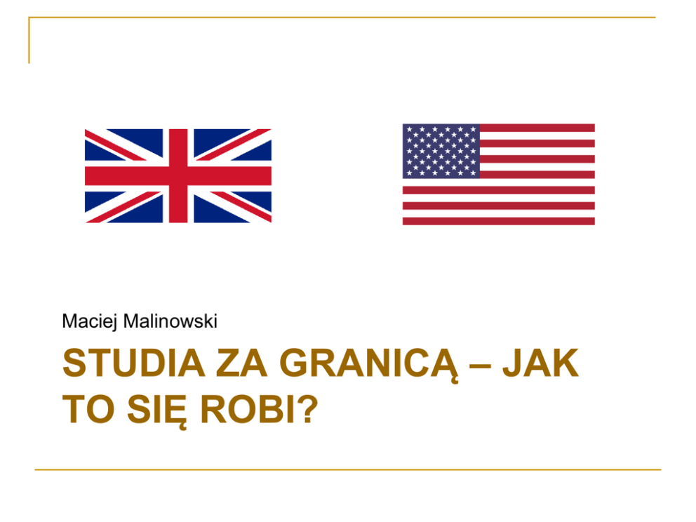 Maciej Malinowski STUDIA ZA GRANICĄ – JAK TO SIĘ ROBI? Co czym powiem Główne różnice PL – UK – USA Kwalifikacja Pieniądze UK USA UK USA Linki Maciej Malinowski [email protected] Standardowa struktura studiów 3 lata - Licencjat 1 rok Magister Doktorat Magister po drodze do doktoratu Maciej Malinowski [email protected] 2 lata – rozwój ogólny ukierunkowany 2 lata – Bachelor Magister – po drodze do doktoratu Co ludzie mówią… Poziom niekoniecznie wyższy, ale nastawienie na własne badania Lepsze warunki studiów, większe wsparcie kadry akademickiej Lepsze możliwości późniejszego rozwoju (staże, praktyki) USA > UK > PL Maciej Malinowski [email protected] Oxford University Studenci ze 130 różnych krajów Tutoriale Emma Jelenie Ponad 400 klubów i stowarzyszeń Maciej Malinowski [email protected] Co czym powiem Główne różnice PL – UK – USA Kwalifikacja Pieniądze UK USA UK USA Linki Maciej Malinowski [email protected] Aplikacja UK Jeden centralny system aplikacji - UCAS Maciej Malinowski [email protected] Potrzebne dokumenty Personal statement: pieśń pochwalna o samym sobie na 4000 słów Zainteresowania, źródła inspiracji Umiejętności i osiągnięcia (np. olimpiady) Doświadczenie zawodowe Plany na przyszłość Może być podstawą rozmowy kwalifikacyjnej Maciej Malinowski [email protected] Potrzebne dokumenty Referencje – pieśń pochwalna naszego nauczyciela o nas O szkole Jak wypadamy na tle klasy Nasze szanse rozwoju okiem eksperta W Polsce ciężko znaleźć nauczyciela, który napisze to całkiem sam (plus?) Maciej Malinowski [email protected] Wybieramy uniwersytet Raczej nie należy ufać rankingom? Univeristy of Oxford Najlepsze miejsca do studiowania matematyki/informatyki/fizyki Univeristy of Cambridge Imperial College London Maciej Malinowski [email protected] Kiedy? Wypada się zabrać na początku 3 klasy Deadline: 15 Października (Ox/Cam),15 Stycznia ogólnie A teraz pozostaje czekać… Maciej Malinowski [email protected] Interview Oxford i Cambridge po pierwszym odrzuceniu zapraszają na rozmowy kwalifikacyjne Pytania do personal statement Zadanka Maciej Malinowski [email protected] Co umie większość kandydatów Polska matura Indukcja matematyczna Wektory Macierze i przestrzenie liniowe Rachunek różniczkowy i całkowy Równania różniczkowe Liczby zespolone Maciej Malinowski [email protected] Co umie większość kandydatów Polska matura Indukcja matematyczna Wektory Macierze i przestrzenie liniowe Rachunek różniczkowy i całkowy Równania różniczkowe Ale przede wszystkim Liczby zespolone należy się umieć tych rzeczy szybko nauczyć :) Maciej Malinowski [email protected] Dodatkowe egzaminy w Polsce Oxford Cambridge matematyka Znośne egzaminy przed rozmową kwalifikacyjną STEP: hardkor! Po rozmowie kwalifikacyjnej Oraz ewentualne egzaminy językowe (np. CAE grade A, CPE grade B, TOEFL score 100, IELTS score 7.0) Maciej Malinowski [email protected] Uwaga Egzaminy brytyjskie mogą mieć ZUPEŁNIE inny charakter od polskich Maciej Malinowski [email protected] Oferta Jeśli wypadniemy pomyślnie, dostaniemy ofertę Przykładowo: achieve 85% in all higher level subjects on Polish Matura, including mathematics and physics on higher level Jeśli spełnimy ofertę, na pewno zostaniemy przyjęci Maciej Malinowski [email protected] Co czym powiem Główne różnice PL – UK – USA Kwalifikacja Pieniądze UK USA UK USA Linki Maciej Malinowski [email protected] Aplikacja USA Dużo trudniejsza Bezpośrednio z uniwersytetem Trzeba zacząć na początku 2. liceum Aplikujemy na uniwersytet, a nie na konkretny kierunek Maciej Malinowski [email protected] Dokumenty i kryteria przyjmowania Personal statement i referencje od 2 nauczycieli Eseje na zadane tematy (sprawdzają kreatywne myślenie i umiejętność pisania) Egzaminy SATI, SATII Oceny z liceum (również z pierwszej klasy!) Sytuacja finansowa Rozmowa kwalifikacyjna w Polsce Osiągnięcia (olimpiady, projekty badawcze) Maciej Malinowski [email protected] Egzaminy SAT SAT I: • Matematyka • Czytanie ze zrozumieniem • Pisanie Na dobre uczelnie trzeba nauczyć się pisać i czytać po angielsku lepiej niż amerykanie! SAT II: 2 (3) przedmioty do wyboru • Matematyka • Fizyka • Chemia • Biologia • Języki •… Można pisać wielokrotnie, ale trzeba płacić Maciej Malinowski [email protected] Co czym powiem Główne różnice PL – UK – USA Kwalifikacja Pieniądze UK USA UK USA Linki Maciej Malinowski [email protected] Ile to kosztuje? Dla uniwersytetu po ostatnich cięciach – od 3500 do 10 000 funtów rocznie (zależy od kierunku i dochodu rodziny) Maciej Malinowski [email protected] Na mieszkanie – około 3500 funtów rocznie Na utrzymanie – około 3500 funtów rocznie Pożyczka Opłata za uniwersytet jest z reguły w całości pokrywana przez pożyczkę Zobowiązujemy się zapłacić za studia w ratach gdy je skończymy i znajdziemy dobrą pracę (>21 000 funtów rocznie) Oprocentowana jak inflacja Maciej Malinowski [email protected] Pomoc finansowa Około 3500 funtów z pomocy finansowej dla polskich studentów (zależy od uniwersytetu, dochodu)… Jeśli rodzice zarabiają <50 000 funtów, prawie na pewno dostaniemy jakieś wsparcie Zostaje około 3500 funtów do zapłacenia z własnej kieszeni Maciej Malinowski [email protected] Co czym powiem Główne różnice PL – UK – USA Kwalifikacja Pieniądze UK USA UK USA Linki Maciej Malinowski [email protected] Ile to kosztuje Studia w USA to duży wydatek, rzędu 50000 $ rocznie Jednak większość uczelni oferuje tzw. Financial Aid Package Trzeba się oddzielnie dowiadywać na każdej uczelni Maciej Malinowski [email protected] Pomoc finansowa – Harvard University Pracujemy na kampusie (około 10 godzin w tygodniu) w ciągu roku Sami dokładamy 1500$ z pracy wakacyjnej Rodzice dają 10% swoich przychodów jeśli zarabiają >60000$ Maciej Malinowski [email protected] Pomoc finansowa – Harva
