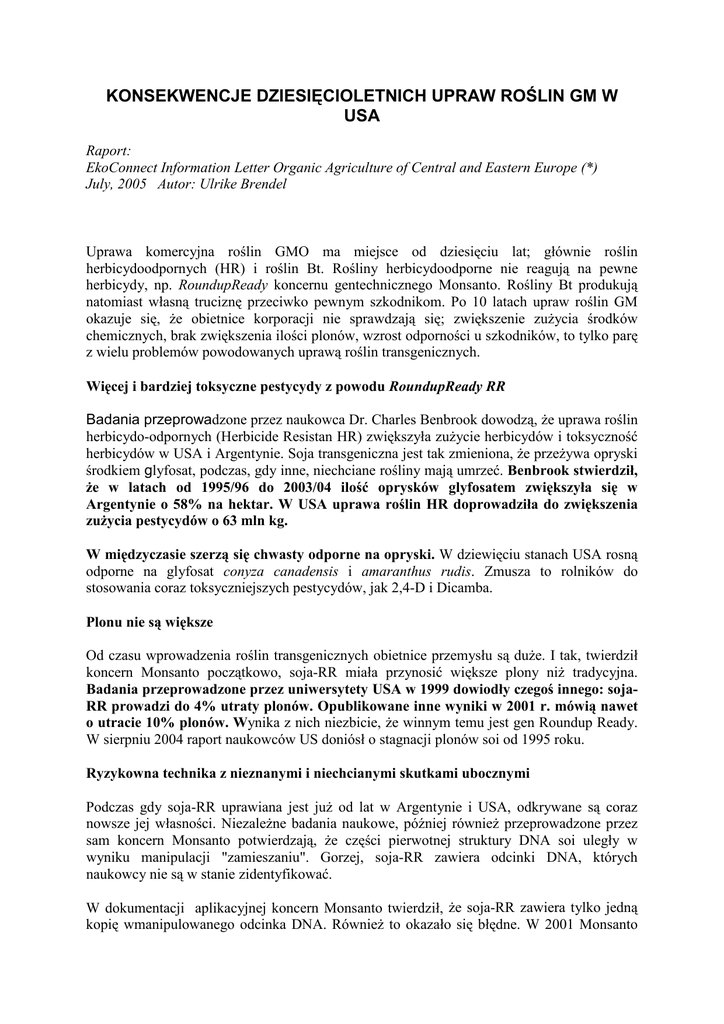 KONSEKWENCJE DZIESIĘCIOLETNICH UPRAW ROŚLIN GM W USA