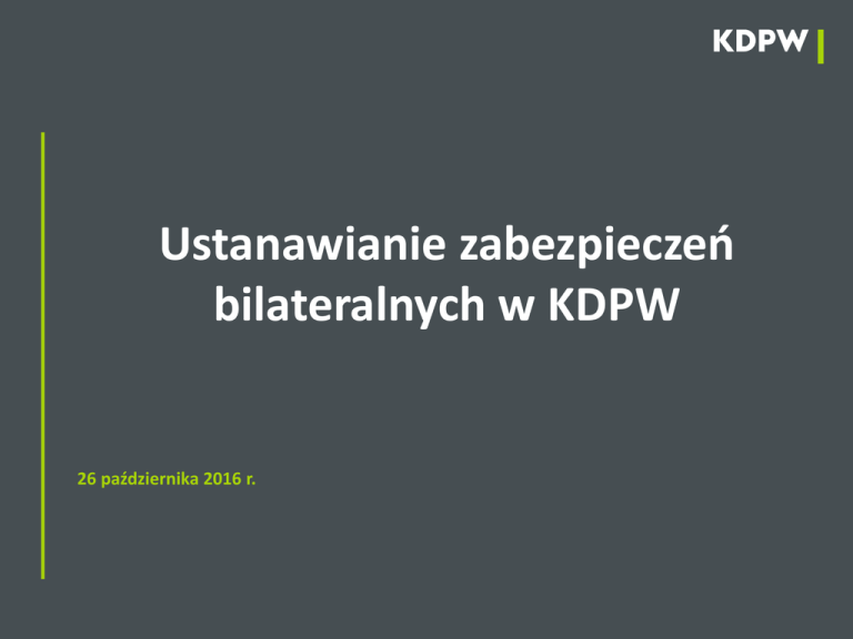 Ustanawianie zabezpieczeń bilateralnych w KDPW 26 października 2016 r. Zagadnienia Założenia ogólne dot. ustanawiania zabezpieczeń w papierach wartościowych Ustanawianie blokady oraz zwolnienie blokady Przejęcie zabezpieczenia 2 Założenia bazowe Usługa dedykowana dla Uczestników KDPW – zakres usług określony w regulacjach KDPW KDPW nie prowadzi rejestru transakcji, w stosunku do których jest wymagane zabezpieczenie Strony bilateralnie ustalają wysokość wymaganego zabezpieczenia i rodzaj aktywów (kod papieru wartościowego) Zabezpieczenie jest realizowane w formie blokady papierów wartościowych na koncie dawcy Wyróżnienia aktywów stanowiących zabezpieczenie - odrębny, dedykowany do tego produktu status aktywów Pożytki z papierów wartościowych będących przedmiotem zabezpieczenia (odsetki, środki z tytułu wykupu) realizowane na rzecz uczestnika posiadającego na koncie dane papiery 3 Cel usługi Umożliwienie uczestnikom KDPW składania na specjalnie wyróżnionym koncie ewidencyjnym zabezpieczeń w papierach wartościowych na rzecz innych uczestników KDPW Nadzór KDPW w zakresie utrzymywania blokady oraz realizacji transferów związanych z przejęciem zabezpieczenia Eliminacja konieczności podpisywania dodatkowych umów z KDPW, związanych z obsługą blokad 4 Ustanowienie blokady Instrukcje rozrachunku od dawcy i biorcy zabezpieczenia – dedykowane oznaczenie kodowe Zestawienie instrukcji – uzgodnienie warunków blokady Zaksięgowanie blokady – zmiana statusu aktywów na koncie dawcy zabezpieczenia Informacja do stron rozrachunku – status instrukcji Rejestr zabezpieczeń prowadzony przez KDPW – odnotowanie blokady dawcy na rzecz biorcy zabezpieczenia Dawca zabezpieczenia otrzymuje wyciąg z konta Biorca zabezpieczenia otrzymuje raport analityczny z rejestru zabezpieczeń 5 Ustanowienie blokady - schemat 6 Zwolnienie blokady Instrukcja rozrachunku od dawcy zabezpieczenia Instrukcja rozrachunku od biorcy zabezpieczenia – potwierdzenie możliwości odblokowania papierów wartościowych Zestawienie instrukcji - uzgodnienie warunków odblokowania Weryfikacja przez KDPW możliwości zwolnienia blokady – stan w rejestrze zabezpieczeń Zaksięgowanie odblokowania – zmiana statusu aktywów na koncie dawcy zabezpieczenia Informacja do stron rozrachunku – status instrukcji Rejestr zabezpieczeń prowadzony przez KDPW – odnotowanie zwolnienia blokady Dawca zabezpieczenia otrzymuje wyciąg z konta Biorca zabezpieczenia otrzymuje raport analityczny z rejestru zabezpieczeń 7 Zwolnienie blokady - schemat 8 Przejęcie zabezpieczenia Instrukcja rozrachunku od biorcy zabezpieczenia – przejęcie zabezpieczenia Instrukcja rozrachunku od dawcy zabezpieczenia - ??? (zagadnienie do dyskusji) Zestawienie instrukcji - ??? (zagadnienie do dyskusji) Weryfikacja przez KDPW możliwości przejęcia zabezpieczenia – stan w rejestrze zabezpieczeń Zaksięgowanie dyspozycji – przeniesienie papierów wartościowych z konta dawcy zabezpieczenia na konto biorcy zabezpieczenia Informacja do stron rozrachunku – status instrukcji Rejestr zabezpieczeń prowadzony przez KDPW – odnotowanie transferu Dawca i biorca zabezpieczenia otrzymuje wyciąg z konta Biorca zabezpieczenia otrzymuje raport analityczny z rejestru zabezpieczeń 9 Przejęcie zabezpieczenia - schemat 10 Opłaty za usługę Propozycja: Opłata procentowa (miesięczna) – od wartości papierów wartościowych i czasu trwania blokady Opłata stała (miesięczna) – naliczana za każdy miesiąc, w którym uczestnik korzysta z usługi Opłata stała (miesięczna) – uzależniona od liczby uczestników, na rzecz których jest ustanawiana blokada 11 Dziękuję za uwagę www.kdpw.pl
