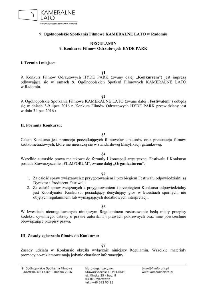 9. Ogólnopolskie Spotkania Filmowe KAMERALNE LATO w Radomiu REGULAMIN 9. Konkursu Filmów Odrzutowych HYDE PARK I. Termin i miejsce: §1 9. Konkurs Filmów Odrzutowych HYDE PARK (zwany dalej „Konkursem”) jest imprezą odbywającą się w ramach 9. Ogólnopolskich Spotkań Filmowych KAMERALNE LATO w Radomiu. §2 9. Ogólnopolskie Spotkania Filmowe KAMERALNE LATO (zwane dalej „Festiwalem”) odbędą się w dniach 3-9 lipca 2016 r. Konkurs Filmów Odrzutowych HYDE PARK przewidziany jest w dniu 3 lipca 2016 r. II. Formuła Konkursu: §3 Celem Konkursu jest promocja początkujących filmowców amatorów oraz prezentacja filmów krótkometrażowych, które nie mieszczą się w standardowej klasyfikacji gatunkowej. §4 Wszelkie autorskie prawa majątkowe do formuły i koncepcji artystycznej Festiwalu i Konkursu posiada Stowarzyszenie „FILMFORUM”, zwane dalej „Organizatorem”. §5 1. Za całość spraw związanych z przygotowaniem i przebiegiem Festiwalu odpowiedzialni są Dyrektor i Producent Festiwalu. 2. Za całość spraw związanych z przygotowaniem i przebiegiem Konkursu odpowiedzialny jest Koordynator Konkursu, posiadający decydujący głos w kwestiach spornych, nie objętych regulaminem lub wymagających dodatkowych interpretacji. §6 W kwestiach nieuregulowanych niniejszym Regulaminem zastosowanie będą miały przepisy kodeksu cywilnego, ustawy o prawie autorskim i prawach pokrewnych oraz inne powszechnie obowiązujące przepisy prawa. III. Zasady zgłaszania filmów do Konkursu: §7 Zasady udziału w Konkursie określa wyłącznie niniejszy Regulamin. Wszelkie materiały promocyjno-reklamowe mają jedynie charakter informacyjny. §8 Konkurs przeznaczony jest dla filmowców amatorów. W konkursie mogą brać udział filmy zrealizowane na terytorium Polski oraz zrealizowane przez polskich filmowców poza granicami kraju. §9 Filmy do udziału w Konkursie mogą zgłaszać osoby fizyczne lub prawne (zwane dalej „Zgłaszającym”), które w dniu przystąpienia do Konkursu posiadają pełną zdolność do czynności prawnych oraz prawo do dysponowania zgłaszanym filmem. W Konkursie mogą wziąć udział również zespoły osób, dokonujące zgłoszenia jako jeden Zgłaszający (zbiorowy). W takim przypadku osoby te traktowane będą jako współtwórcy filmów zgłoszonych do udziału w Konkursie. §10 W imieniu osób niepełnoletnich filmy mogą zgłaszać wyłącznie rodzice lub prawni opiekunowie. W przypadku osób niepełnoletnich do formularza zgłoszeniowego należy dołączyć zgodę rodzica lub opiekuna prawnego na udział w Konkursie. §11 Każdy Zgłaszający może nadesłać dowolną liczbę prac konkursowych. §12 Zgłoszenie filmu do udziału w Konkursie oznacza bezwarunkową zgodę na postanowienia niniejszego Regulaminu. Prace konkursowe niekompletne lub nieodpowiadające wymogom przewidzianym w niniejszym regulaminie oraz przesłane po terminie nie będą brane pod uwagę. §13 1. Zgłoszenie filmu jest bezpłatne. 2. W Konkursie mogą wziąć udział filmy reprezentujące wszelkie formy i gatunki filmowe. 3. Tematyka filmów jest dowolna. §14 Do udziału w Konkursie nie będą dopuszczone filmy: 1. wyprodukowane przed 1 stycznia 2014 r.; 2. wykonane na odpłatne zlecenie; 3. o czasie trwania powyżej 15 minut 4. biorące udział w poprzednich edycjach Festiwalu; 5. zrealizowane przy udziale członków Komisji Kwalifikacyjnej lub Organizatora. §15 Każdy film powinien posiadać czołówkę i napisy końcowe (tytuł, nazwiska twórców). §16 1. Warunkiem formalnym zgłoszenia filmu do udziału w Festiwalu jest szczegółowe wypełnienie przez Zgłaszającego FORMULARZA ZGŁOSZENIA FILMU (dostępnego na stronie internetowej: www.kameralnelato.pl). 2. Wypełniony FORMULARZ ZGŁOSZENIA FILMU, wraz z czytelnym podpisem Zgłaszającego, należy przesłać w nieprzekraczalnym terminie do dnia 16 maja 2016 r. na adres Biura Festiwalu: Stowarzyszenie "FILMFORUM" ul. Mińska 25 - bud. 8, 03-808 Warszawa (Soho Factory) z dopiskiem „HYDE PARK 2016” Decyduje data stempla pocztowego. 3. Zgłaszający powinien także potwierdzić swoje zgłoszenie, wysyłając do Organizatora wypełniony FORMULARZ ZGŁOSZENIA FILMU w formie elektronicznej (format: WORD/PDF), do dnia 16 maja 2016 r. na adres: [email protected]. W temacie maila należy wpisać: "HYDE PARK 2016". 4. Zgłaszający, wraz z elektroniczną wersją FORMULARZA ZGŁOSZENIA FILMU, powinien także na adres: [email protected] wysłać kadr ilustrujący zgłoszony film (preferowany rozmiar: 1920x1080 px, rozdzielczość: 300 dpi), a także zdjęcie reżysera (minimalny rozmiar: 1500x1000 px, rozdzielczość: 300 dpi). Tym samym Zgłaszający wyraża zgodę na publikację tych materiałów w katalogu festiwalowym oraz na stronie internetowej Festiwalu. §17 1. Filmy do udziału w Festiwalu można zgłosić w następujący sposób: a) publikując film on-line w serwisie internetowym VIMEO (dostęp do filmu powinien być zabezpieczony hasłem) lub w innym serwisie internetowym prezentującym materiały filmowe oraz umieszczając stosowny link do filmu (wraz z hasłem) w odpowiednim polu w FORMULARZU ZGŁOSZENIA FILMU; b) przesyłając Organizatorowi drogą elektroniczną film w postaci pliku wideo przygotowany w standardzie i formacie zgodnym z zapisami §26, punkt 2 niniejszego regulaminu; c) przesyłając Organizatorowi, wraz z FORMULARZEM ZGŁOSZENIA FILMU, kopię preselekcyjną w formacie DVD lub Blu-Ray. 2. Decyzja odnośnie wyboru formy zgłoszenia filmu do udziału w Konkursie, w zakresie zgodnym z punktem 1 niniejszego paragrafu, należy do Zgłaszającego. 3. Link do filmu udostępnionego w wersji on-line musi być dostępny do czasu ogłoszenia przez Organizatora listy filmów zakwalifikowanych do udziału w Festiwalu. 4. Kopia preselekcyjna przesłana w formie pliku wideo powinna być nagrana w jakości emisyjnej. 5. Kopia preselekcyjna przesłana w formacie DVD lub Blu-Ray powinna być nagrana w jako