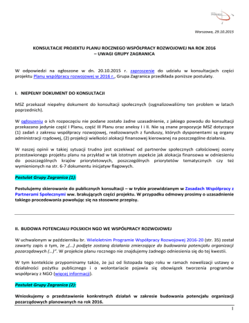 Warszawa, 29.10.2015 KONSULTACJE PROJEKTU PLANU ROCZNEGO WSPÓŁPRACY ROZWOJOWEJ NA ROK 2016 – UWAGI GRUPY ZAGRANICA W odpowiedzi na ogłoszone w dn. 20.10.2015 r. zaproszenie do udziału w konsultacjach części projektu Planu współpracy rozwojowej w 2016 r., Grupa Zagranica przedkłada poniższe postulaty. I. NIEPEŁNY DOKUMENT DO KONSULTACJI MSZ przekazał niepełny dokument do konsultacji społecznych (sygnalizowaliśmy ten problem w latach poprzednich). W ogłoszeniu o ich rozpoczęciu nie podane zostało żadne uzasadnienie, z jakiego powodu do konsultacji przekazano jedynie część I Planu, część III Planu oraz aneksy I i II. Nie są znane propozycje MSZ dotyczące (1) zadań z zakresu współpracy rozwojowej, realizowanych z funduszy, których dysponentami są organy administracji rządowej, (2) projekcji wielkości alokacji finansowej kierowanej na poszczególne działania. W naszej opinii w takiej sytuacji trudno jest oczekiwać od partnerów społecznych całościowej oceny przestawionego projektu planu na przykład w tak istotnym aspekcie jak alokacja finansowa w odniesieniu do poszczególnych krajów priorytetowych, poszczególnych priorytetów tematycznych czy też wymienionych na str. 6-7 dokumentu inicjatyw flagowych. Postulat Grupy Zagranica (1): Postulujemy skierowanie do publicznych konsultacji – w trybie przewidzianym w Zasadach Współpracy z Partnerami Społecznymi ww. brakujących części projektu. W przypadku odmowy prosimy o uzasadnienie takiego procedowania powołując się na stosowne przepisy. II. BUDOWA POTENCJAŁU POLSKICH NGO WE WSPÓŁPRACY ROZWOJOWEJ W uchwalonym w październiku br. Wieloletnim Programie Współpracy Rozwojowej 2016-20 (str. 35) został zawarty zapis o tym, że „(…) podjęte zostaną działania zmierzające do budowania potencjału organizacji pozarządowych (…)”. W projekcie planu rocznego nie znajdujemy żadnego odniesienia się do tej kwestii. W tym kontekście przypominamy także, że już od listopada tego roku w ramach nowelizacji ustawy o działalności pożytku publicznego i o wolontariacie pojawia się obowiązek tworzenia programów współpracy z NGO (więcej informacji). Postulat Grupy Zagranica (2): Wnioskujemy o przedstawienie konkretnych działań w zakresie budowania potencjału organizacji pozarządowych planowanych na rok 2016. 1 III. POLITYKA STYPENDIALNA W PLANIE ROCZNYM WSPÓŁPRACY ROZWOJOWEJ (STR. 6) Wg projektu planu: "(...) polityka stypendialna jest ważnym instrumentem wspierania rozwoju krajów partnerskich. Stypendia służą zarówno wzmocnieniu kadr danego kraju, jak i nawiązaniu kontaktów, które w przyszłości przyniosą wymierne i obopólne korzyści. Stypendyści, wzbogaceni o nową wiedzę i doświadczenia posiadają potencjał do inicjowania i wspierania długofalowych zmian w swoich krajach (...)" Grupa Zagranica stoi nieodmiennie na stanowisku, że zaliczanie środków przeznaczonych na pomoc stypendialną dla studentów z krajów rozwijających do oficjalnej pomocy rozwojowej jest zasadne tylko wtedy, kiedy istnieje udokumentowane programowe podejście do specyfiki potrzeb kraju pochodzenia studenta. Potrzebne są konkretne założenia, umożliwiające dostosowanie kierunku studiów, na które uczęszcza cudzoziemiec, do strategii rozwoju oraz priorytetowych dziedzin wsparcia dla kraju jego pochodzenia. Bez tego trudno udowodnić, że studia, na które uczęszczała dana osoba, w jakimkolwiek stopniu przyczynią się do rozwoju kraju jej pochodzenia. Postulat Grupy Zagranica (3): Wytyczne DAC OECD dopuszczają wliczanie kosztów studentów jedynie pod warunkiem udokumentowania programowego podejścia do specyfiki potrzeb kraju pochodzenia studenta. Wnioskujemy zatem o udostępnienie - na przykład w formie aneksu do Planu - dokumentu zawierającego opis takiego programowego podejścia. IV. KONKURSY GRANTOWE W RAMACH PP 2016 (STR. 20-22) - PROJEKTY MODUŁOWE W projekcie Planu odwołanie do kwestii projektów modułowych znajduje się w dwóch miejscach: „(…) W ramach konkursu „Polska pomoc rozwojowa 2016” będą dofinansowane m.in. projekty modułowe tj. projekty składające się z dwóch niezależnych i realizowanych sekwencyjnie modułów w latach 2016-2017 (…)” (str. 7) „(…) Przewiduje się możliwość zgłaszania projektów o okresie wdrażania dłuższym niż jeden rok, składających się z dwóch modułów realizowanych sekwencyjnie na podstawie odrębnych umów: pierwszy do realizacji w 2016 r. i finansowany w ramach limitów środków, a drugi finansowany warunkowo w 2017 r. (…)” (str. 21) W opinii Grupy Zagranica projekty modułowe są o tyle istotne, że stanowią protezę finansowania wieloletniego. GZ w ostatnim roku spotykała się kilkukrotnie z podsekretarzem stanu ds. współpracy rozwojowej oraz z kierownictwem DWR, aby wskazać na brak jakichkolwiek skoordynowanych działań administracji rządowej na rzecz zwiększania potencjału NGO w tym obszarze tematycznym. Jednym z kluczowych wyzwań jest właśnie brak finansowania wieloletniego, a warto przypomnieć, że przejście od formuły jednostkowych projektów do wieloletnich programów było jedną z rekomendacji przeglądu polskiego systemu pomocy rozwojowej przeprowadzonego przez DAC OECD w 2010 r. (!) 2 W tym kontekście GZ w bieżącym roku postulowała - jako rozwiązanie na krótki okres - rozszerzenie zakresu modułowości we wszystkich konkursach PP, proponując (do momentu wprowadzenia odpowiednich regulacji umożliwiających finansowanie wieloletnie) wprowadzenie modułowości wydłużonej do 3 lat w kolejnej edycji konkursów PP w roku 2016. Warto dodać, że w trakcie spotkania przedstawicieli GZ z kierownictwem DWR MSZ w dn. 21 maja 2015 padła ze strony MSZ deklaracja gotowości do rozmów w tej sprawie. W komentowanym zapisie MSZ konserwatywnie proponuje - tak jak w latach poprzednich - modułowość 2letnią. Co więcej, przy zachowaniu formuły z lat poprzednich mamy de 