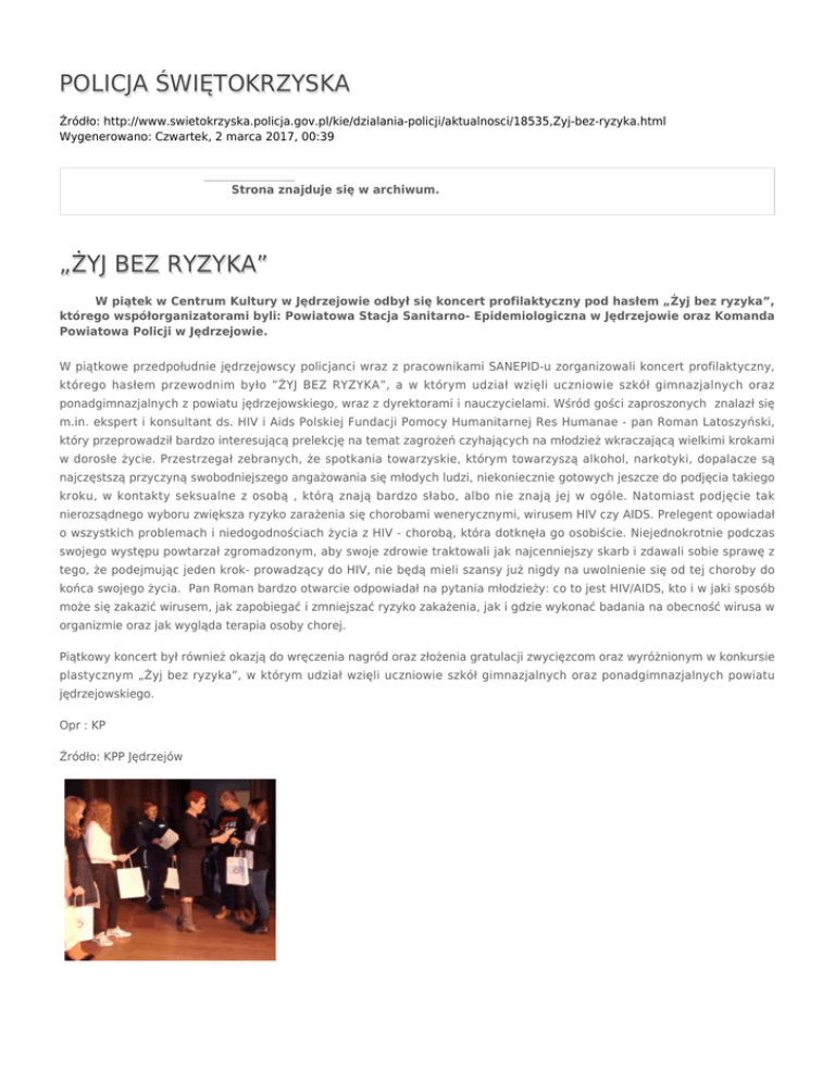 POLICJA ŚWIĘTOKRZYSKA Źródło: http://www.swietokrzyska.policja.gov.pl/kie/dzialania-policji/aktualnosci/18535,Zyj-bez-ryzyka.html Wygenerowano: Czwartek, 2 marca 2017, 00:39 Strona znajduje się w archiwum. „ŻYJ BEZ RYZYKA” W piątek w Centrum Kultury w Jędrzejowie odbył się koncert profilaktyczny pod hasłem „Żyj bez ryzyka”, którego współorganizatorami byli: Powiatowa Stacja Sanitarno- Epidemiologiczna w Jędrzejowie oraz Komanda Powiatowa Policji w Jędrzejowie. W piątkowe przedpołudnie jędrzejowscy policjanci wraz z pracownikami SANEPID-u zorganizowali koncert profilaktyczny, którego hasłem przewodnim było ”ŻYJ BEZ RYZYKA”, a w którym udział wzięli uczniowie szkół gimnazjalnych oraz ponadgimnazjalnych z powiatu jędrzejowskiego, wraz z dyrektorami i nauczycielami. Wśród gości zaproszonych znalazł się m.in. ekspert i konsultant ds. HIV i Aids Polskiej Fundacji Pomocy Humanitarnej Res Humanae - pan Roman Latoszyński, który przeprowadził bardzo interesującą prelekcję na temat zagrożeń czyhających na młodzież wkraczającą wielkimi krokami w dorosłe życie. Przestrzegał zebranych, że spotkania towarzyskie, którym towarzyszą alkohol, narkotyki, dopalacze są najczęstszą przyczyną swobodniejszego angażowania się młodych ludzi, niekoniecznie gotowych jeszcze do podjęcia takiego kroku, w kontakty seksualne z osobą , którą znają bardzo słabo, albo nie znają jej w ogóle. Natomiast podjęcie tak nierozsądnego wyboru zwiększa ryzyko zarażenia się chorobami wenerycznymi, wirusem HIV czy AIDS. Prelegent opowiadał o wszystkich problemach i niedogodnościach życia z HIV - chorobą, która dotknęła go osobiście. Niejednokrotnie podczas swojego występu powtarzał zgromadzonym, aby swoje zdrowie traktowali jak najcenniejszy skarb i zdawali sobie sprawę z tego, że podejmując jeden krok- prowadzący do HIV, nie będą mieli szansy już nigdy na uwolnienie się od tej choroby do końca swojego życia. Pan Roman bardzo otwarcie odpowiadał na pytania młodzieży: co to jest HIV/AIDS, kto i w jaki sposób może się zakazić wirusem, jak zapobiegać i zmniejszać ryzyko zakażenia, jak i gdzie wykonać badania na obecność wirusa w organizmie oraz jak wygląda terapia osoby chorej. Piątkowy koncert był również okazją do wręczenia nagród oraz złożenia gratulacji zwycięzcom oraz wyróżnionym w konkursie plastycznym „Żyj bez ryzyka”, w którym udział wzięli uczniowie szkół gimnazjalnych oraz ponadgimnazjalnych powiatu jędrzejowskiego. Opr : KP Źródło: KPP Jędrzejów Ocena: 0/5 (0) Tweetnij