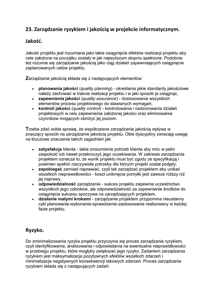 23. Zarządzanie ryzykiem i jakością w projekcie informatycznym