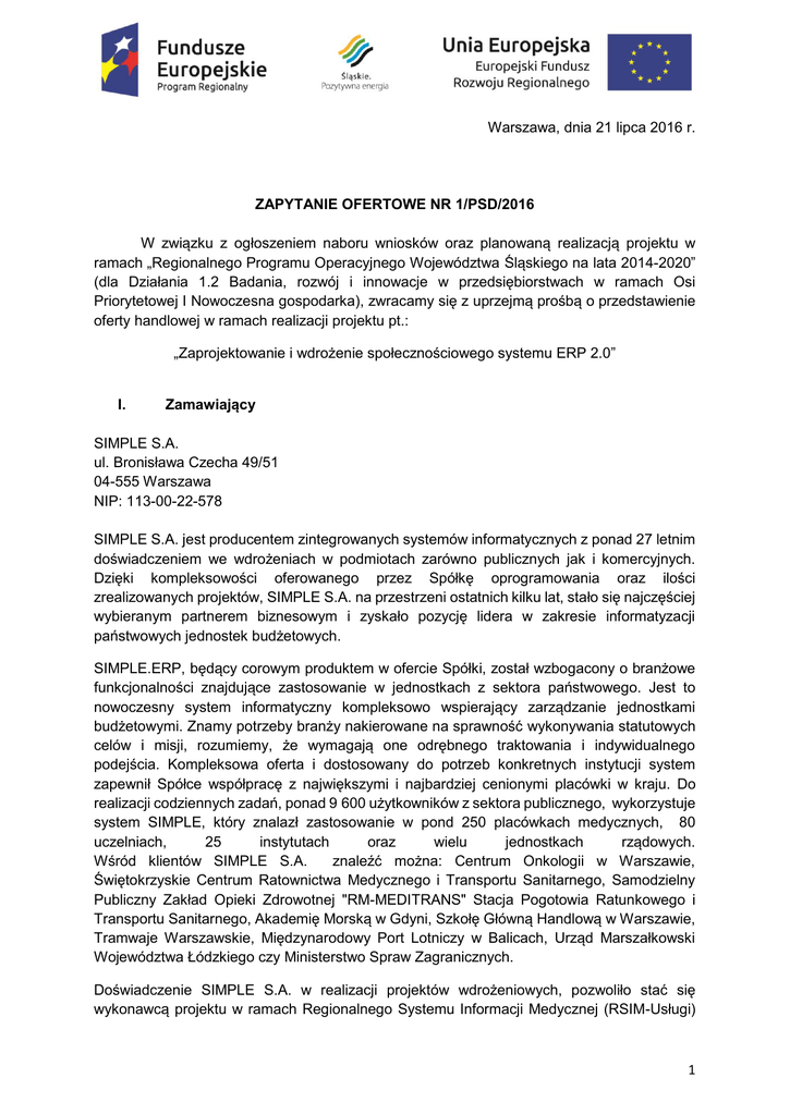 Warszawa, dnia 21 lipca 2016 r. ZAPYTANIE OFERTOWE NR 1/PSD/2016 W związku z ogłoszeniem naboru wniosków oraz planowaną realizacją projektu w ramach „Regionalnego Programu Operacyjnego Województwa Śląskiego na lata 2014-2020” (dla Działania 1.2 Badania, rozwój i innowacje w przedsiębiorstwach w ramach Osi Priorytetowej I Nowoczesna gospodarka), zwracamy się z uprzejmą prośbą o przedstawienie oferty handlowej w ramach realizacji projektu pt.: „Zaprojektowanie i wdrożenie społecznościowego systemu ERP 2.0” I. Zamawiający SIMPLE S.A. ul. Bronisława Czecha 49/51 04-555 Warszawa NIP: 113-00-22-578 SIMPLE S.A. jest producentem zintegrowanych systemów informatycznych z ponad 27 letnim doświadczeniem we wdrożeniach w podmiotach zarówno publicznych jak i komercyjnych. Dzięki kompleksowości oferowanego przez Spółkę oprogramowania oraz ilości zrealizowanych projektów, SIMPLE S.A. na przestrzeni ostatnich kilku lat, stało się najczęściej wybieranym partnerem biznesowym i zyskało pozycję lidera w zakresie informatyzacji państwowych jednostek budżetowych. SIMPLE.ERP, będący corowym produktem w ofercie Spółki, został wzbogacony o branżowe funkcjonalności znajdujące zastosowanie w jednostkach z sektora państwowego. Jest to nowoczesny system informatyczny kompleksowo wspierający zarządzanie jednostkami budżetowymi. Znamy potrzeby branży nakierowane na sprawność wykonywania statutowych celów i misji, rozumiemy, że wymagają one odrębnego traktowania i indywidualnego podejścia. Kompleksowa oferta i dostosowany do potrzeb konkretnych instytucji system zapewnił Spółce współpracę z największymi i najbardziej cenionymi placówki w kraju. Do realizacji codziennych zadań, ponad 9 600 użytkowników z sektora publicznego, wykorzystuje system SIMPLE, który znalazł zastosowanie w pond 250 placówkach medycznych, 80 uczelniach, 25 instytutach oraz wielu jednostkach rządowych. Wśród klientów SIMPLE S.A. znaleźć można: Centrum Onkologii w Warszawie, Świętokrzyskie Centrum Ratownictwa Medycznego i Transportu Sanitarnego, Samodzielny Publiczny Zakład Opieki Zdrowotnej "RM-MEDITRANS" Stacja Pogotowia Ratunkowego i Transportu Sanitarnego, Akademię Morską w Gdyni, Szkołę Główną Handlową w Warszawie, Tramwaje Warszawskie, Międzynarodowy Port Lotniczy w Balicach, Urząd Marszałkowski Województwa Łódzkiego czy Ministerstwo Spraw Zagranicznych. Doświadczenie SIMPLE S.A. w realizacji projektów wdrożeniowych, pozwoliło stać się wykonawcą projektu w ramach Regionalnego Systemu Informacji Medycznej (RSIM-Usługi) 1 wdrażania Regionalnej Platformy Danych. Inwestycje o zasięgu regionalnym dostępne są tylko dla wybranych przedstawicieli branży IT. SIMPLE S.A. realizuje również projekty indywidualne, pod zdefiniowane potrzeby klienta. Oprócz podpisanej w konsorcjum umowy na świadczenie usługi wsparcia analitycznego i projektowego w zakresie realizacji przedsięwzięć informatycznych w Zakładzie Ubezpieczeń Społecznych, spółce udało się z sukcesem zrealizować projekt dla Ministerstwa Spraw Zagranicznych, którego przedmiotem było stworzenie systemu Polskie Dossiers. Na sukces SIMPLE S.A. pracuje zespół ponad 200 wykwalifikowanych ekspertów, posiadających wiedzę na temat nowoczesnych technologii oraz specyfiki branż, dla których tworzymy aplikacje biznesowe. II. Przedmiot zamówienia Wykonanie prac badawczo-rozwojowych w wymiarze 500 osobodni dotyczących wdrażania lean manufacruting w procesie produkcyjnym w zakresie: 1. 2. Opracowania algorytmów optymalizujących i prognozujących w oparciu o teorię technologii grup i „lean manufacturing”: opracowanie systemów klasyfikacyjnych części, procesów, oprzyrządowania, urządzeń produkcyjnych i ich dostosowanie podobieństwa dla potrzeb tworzenia algorytmów prognostycznych, opracowanie algorytmów prognozujących, w oparciu o dane przewidywalne zmiany wartości zmiennych opisujących procesy produkcyjne (czasy, wydajność, ilości braków ,przestoje itp.) oraz ich elementy składowe: produkowane wyroby, używane maszyny, oprzyrządowanie, procesy, obliczanie i aktualizowanie ,w oparciu o zbierane w dane, standardów OEE, metody obliczania kosztów jednostkowych i ekonomicznej wielkości partii, opracowanie algorytmów optymalizujących harmonogramowanie w oparciu o metody Pietrova Analizy wpływu procesów lean manufacturing i grywalizacji na wynik finansowy poszczególnych obszarów. Osobodni 500 (8 godzin roboczych) Kod CPV: 73100000-3 Opis: Usługi badawcze i eksperymentalno-rozwojowe 2 III. Składanie ofert częściowych Nie jest dopuszczane. IV. Możliwość podwykonawstwa Zamawiający nie podwykonawcom. V. dopuszcza możliwość zlecenia części lub całości zamówienia Przygotowanie oferty Oferta powinna: Posiadać datę sporządzenia i datę ważności (30 dni), Zawierać adres siedziby oferenta lub adres korespondencyjny, Zawierać NIP oferenta, Określać cenę netto zamówienia, Zawierać potwierdzenie spełnienia warunków udziału w postępowaniu ofertowym w postaci oświadczenia Oferenta wraz z udokumentowaniem spełnienia warunków, Zawierać podpis i pieczęć oferenta Oferta powinna być sporządzona na Załączniku nr 1. VI. Warunki udziału w postępowaniu ofertowym Minimalny wymagany zakres wiedzy, umiejętności i doświadczenia pracowników Wykonawcy. Poziom lidera projektu: wiedza o procesach produkcyjnych, wiedza o istniejących metodach ich optymalizacji, wiedza o potrzebach MŚP, wiedza o istniejących metodach klasyfikacji i kodyfikacji podobieństwa elementów procesów produkcyjnych, wiedza o modułowości i operacyjności istniejącego oprogramowania ERP, minimum 10 letnie doświadczenie we wdrażaniu praktycznym teorii technologii grup i lean manufacturing. Poziom konsultantów: wiedza z inżynierii produkcji na poziomie studiów inżynierskich lub magisterskich, 3 letnie doświadczenie praktyczne we wdrażaniu lea
