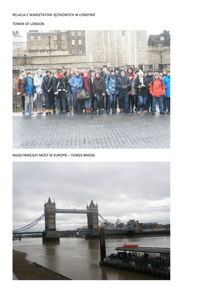 RELACJA Z WARSZTATÓW JĘZYKOWYCH W LONDYNIE TOWER OF LONDON NAJSŁYNNIEJSZY MOST W EUROPIE – TOWER BRIDGE WIDOK NA PARLAMENT Z LONDON EYE TOWER OF LONON – THE CROWN JEWELS MUSEUM THE BRITISH MUSEUM ST. PAUL’S CATHEDRAL WIDOK Z MILLENIUM BRIDGE NA NAJWYŻSZY BUDYNEK W EUROPIE THE GLOBE THEATRE – TU WYSTAWIANE SĄ SZTUKI W. SZEKSPIRA PICCADILLY CIRCUS CHINA TOWN TRAFALGAR SQUARE LONDON EYE I WIDOKI Z LONDON EYE WESTMINSTER ABBEY BIG BEN ZIMA W LONDYNIE – STYCZEŃ 2013 PRZED BUCKINGHAM PALACE THE BRITISH MUSEUM W ŚRODKU ROYAL ALBERT HALL – NAJSŁYNNIEJSZA OPERA W LONDYNIE THE NATURAL HISTORY MUSEUM FIRURY WOSKOWE W MADAME TUSSAUDS MUSEUM REJS STATKIEM PO TAMIZIE DO GREENICH TOWER BRIDGE GREENICH – POŁUDNIK 0 I WIDOK NA LONDYN