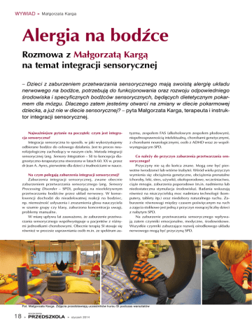 Wywiad » Małgorzata Karga Alergia na bodźce Rozmowa z Małgorzatą Kargą na temat integracji sensorycznej – Dzieci z zaburzeniem przetwarzania sensorycznego mają swoistą alergię układu nerwowego na bodźce, potrzebują do funkcjonowania oraz rozwoju odpowiedniego środowiska i specyficznych bodźców sensorycznych, będących dietetycznym pokarmem dla mózgu. Dlaczego zatem jesteśmy otwarci na zmiany w diecie pokarmowej dziecka, a już nie w diecie sensorycznej? – pyta Małgorzata Karga, terapeuta i instruktor integracji sensorycznej. Najważniejsze pytanie na początek: czym jest integracja sensoryczna? Integracja sensoryczna to sposób, w jaki wykorzystujemy odbierane bodźce do celowego działania. Jest to proces neurofizjologiczny zachodzący w naszym ciele. Metoda integracji sensorycznej (ang. Sensory Integration – SI) to koncepcja diagnostyczno-terapeutyczna stworzona w latach 60. XX w. przez dr Jean A. Ayres, pierwotnie dla dzieci z trudnościami w nauce. Na czym polegają zaburzenia integracji sensorycznej? Zaburzenia integracji sensorycznej, zwane obecnie zaburzeniem przetwarzania sensorycznego (ang. Sensory Processing Disorder – SPD), polegają na nieefektywnym przetwarzaniu bodźców przez układ nerwowy. W konsekwencji dochodzi do nieadekwatnej reakcji na bodziec, np. niemożność usłyszenia i zrozumienia głosu nauczyciela w szumie grupy czy klasy, zaburzona koncentracja uwagi, problemy manualne. W miarę upływu lat zauważono, że zaburzenie przetwarzania sensorycznego współwystępuje u pacjentów z różnymi jednostkami chorobowymi. Obecnie terapię SI stosuje się również w procesie usprawniania osób m.in. ze spektrum au- tyzmu, zespołem FAS (alkoholowym zespołem płodowym), niepełnosprawnością intelektualną, chorobami genetycznymi, z chorobami neurologicznymi, osób z ADHD wraz ze współwystępującym SPD. Co należy do przyczyn zaburzenia przetwarzania sensorycznego? Przyczyny nie są do końca znane. Mogą one być pierwotne (wrodzone) lub wtórne (nabyte). Wśród wielu przyczyn wymienia się: obciążenia genetyczne, obciążenia prenatalne (choroby, leki, stres, używki), okołoporodowe, wcześniactwo, ciąże mnogie, zaburzenia poporodowe (m.in. nadmierna lub niedostateczna stymulacja środowiska). Badania wskazują również na niszczycielską moc nadmiaru technologii (komputery, tablety itp.) oraz niedobory naturalnego ruchu. Zaburzenie równowagi między czasem poświęcanym na ruch a zajęcia stolikowe jest jedną z przyczyn rosnącej liczby dzieci z nabytym SPD. Na zaburzenie przetwarzania sensorycznego wpływają zatem czynniki emocjonalne, medyczne, środowiskowe. Wszystkie czynniki zaburzające rozwój ośrodkowego układu nerwowego mogą być przyczyną SPD. Fot. Małgorzata Karga. Zdjęcia przedstawiają uczestników kursu SI podczas warsztatów 18 » » styczeń 2014 Małgorzata Karga Zaburzenia nie dotyczą tylko najmłodszych dzieci, są niezależne od wieku. Nie da się też z nich „wyrosnąć” – bez terapii zaburzenie nie minie. Z wiekiem zmieniają się zwykle zachowania. Znacząca poprawa funkcjonowania osoby z SPD może nastąpić tylko w wyniku terapii. Jakie mogą być efekty SPD w okresie szkolnym i w dorosłym życiu? Zależą one od typu SPD i liczby zmysłów objętych tym deficytem. Możemy mieć problemy z nadwrażliwością na bodźce, podreaktywnością na bodźce (ignorowanie istotnych bodźców), być „uzależnionymi” od bodźców, np. mieć ciągłą potrzebę ruchu. Te tzw. zaburzenia modulacji sensorycznej są najczęstszą przyczyną nadpobudliwości i/lub deficytów uwagi i często są mylone z ADHD. Inna kategoria SPD uniemożliwia zróżnicowanie bodźca i określenie jego cech, np. dziecko nie czuje, co trzyma w ręce, za mocno trzyma długopis, nie widzi różnicy między literką „b” a „d”. Konsekwencją tych deficytów są zaburzenia schematu ciała, planowania ruchu, postawy ciała, małej motoryki, mowy, percepcji wzrokowej i słuchowej, koordynacji wzrokowo-słuchowo-ruchowej. Wśród tej grupy znajduje się wiele dzieci z niezgrabnością ruchową i osób błędnie zdiagnozowanych jako dyslektycy. Warto pamiętać, iż SPD rzutuje również na sferę emocjonalną (niskie poczucie wartości, brak poczucia bezpieczeństwa emocjonalnego) i społeczną (dzieci z SPD zwykle nie mają przyjaciół, są wyśmiewane, nierozumiane, uznawane za złośliwe, nieznośne, dziwaczne). SPD warunkuje również życie całej rodziny (rodzice są obwiniani o złe wychowanie, życie rodzeństwa dostosowane jest do brata/ siostry z SPD), a ponadto wpływa na życie osobiste i zawodowe w wieku dorosłym (np. izolacja społeczna, trudności w bliskich relacjach, problemy psychiczne, natręctwa). Które z typów SPD są najczęstsze? Amerykańskie badania (Miller, Koomar, Benson, Schoen, Brett-Green, Reale; opublikowane w 2006 r.) wykazują, że aż 27 proc. badanych dzieci z SPD ma tzw. uogólnione SPD, będące kombinacją wszystkich podtypów zaburzeń. To powoduje, że diagnoza tych dzieci jest złożonym procesem, a terapia powinna być intensywna. Na drugim miejscu są dzieci z zaburzeniem modulacji (22 proc.), stanowiącym główny powód trudności z nadpobudliwością i koncentracją uwagi. « Wywiad Jak wygląda diagnoza SI? Kiedy należy ją przeprowadzić? Obserwację procesów SI powinno się przeprowadzić, kiedy występują niepokojące objawy, niezależnie od wieku (od niemowlęctwa do starości). W aspekcie dzieci w wieku szkolnym każdy problem z koncentracją uwagi i trudnościami w nauce powinien być powodem do kontrolnego badania SI. Procesy SI są dla mózgu jak fundament dla domu. Tak jak niestabilne lub nieprawidłowe fundamenty powodują wady konstrukcji domu, tak nieefektywne przetwarzanie sensoryczne zaburza funkcjonowanie mózgu. Obserwacja procesów SI, czyli tzw. diagnoza SI, składa się z wywiadu z rodzicami/opiekunami przeprowadzanego bez obecności dziecka oraz