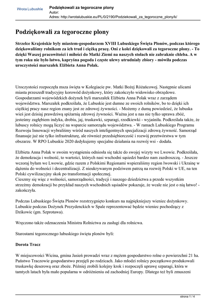 Podziękowali za tegoroczne plony Autor: Adres: http://wrotalubuskie.eu/PL/0/2190/Podziekowali_za_tegoroczne_plony/k/ Podziękowali za tegoroczne plony Strzelce Krajeńskie były miastem-gospodarzem XVIII Lubuskiego Święta Plonów, podczas którego dziękowaliśmy rolnikom za ich trud i ciężką pracę. Oni z kolei dziękowali za tegoroczne plony. - To dzięki Waszej pracowitości i miłości do Matki Ziemi na naszych stołach nie zabraknie chleba. A w tym roku nie było łatwo, kapryśna pogoda i częste ulewy utrudniały zbiory - mówiła podczas uroczystości marszałek Elżbieta Anna Polak. Uroczystości rozpoczęła msza święta w Kolegiacie pw. Matki Bożej Różańcowej. Następnie ulicami miasta przeszedł tradycyjny korowód dożynkowy, który zakończyło widowisko obrzędowe. Gospodarzami wojewódzkich dożynek byli marszałek Elżbieta Anna Polak wraz z zarządem województwa. Marszałek podkreślała, że Lubuskie jest dumne ze swoich rolników, bo to dzięki ich ciężkiej pracy nasz region znany jest ze zdrowej żywności. - Możemy z dumą powiedzieć, że lubuska wieś jest dzisiaj prawdziwą spiżarnią zdrowej żywności. Ważna jest u nas nie tylko uprawa zbóż, jesteśmy zagłębiem indyka, drobiu, jaj, truskawki, szparagi, rzodkiewki - wyjaśniła. Podkreślała także, że lubuscy rolnicy mogą liczyć na wsparcie samorządu województwa. - W ramach Lubuskiego Programu Rozwoju Innowacji wybraliśmy wśród naszych inteligentnych specjalizacji zdrową żywność. Samorząd finansuje już nie tylko infrastrukturę, ale również przedsiębiorczość i rozwój przetwórstwa w tym obszarze. W RPO Lubuskie 2020 dedykujemy specjalne działania na rozwój wsi - dodała. Elżbieta Anna Polak w swoim wystąpieniu odniosła się także do swojej wizyty we Lwowie. Podkreślała, że demokracja i wolność, to wartości, których nasi wschodni sąsiedzi bardzo nam zazdroszczą. - Jeszcze wczoraj byłam we Lwowie, gdzie razem z Polskimi Regionami wspieraliśmy region lwowski i Ukrainę w dążeniu do wolności i decentralizacji. Z nieukrywanym podziwem patrzą na rozwój Polski w UE, na ten Polski cywilizacyjny skok po transformacji społecznej. Cieszmy się więc z wolności, samorządności, tradycji i naszego dziedzictwa a przede wszystkim strzeżmy demokracji bo przykład naszych wschodnich sąsiadów pokazuje, że wcale nie jest o nią łatwo! zakończyła. Podczas Lubuskiego Święta Plonów rozstrzygnięto konkurs na najpiękniejszy wieniec dożynkowy. Lubuskie podczas Dożynek Prezydenckich w Spale reprezentować będzie wieniec pochodzący z Dzikowic (gm. Szprotawa). Wręczono także odznaczenia Ministra Rolnictwa za zasługi dla rolnicwa. Starostami tegorocznego lubuskiego święta plonów byli: Dorota Tracz W miejscowości Wicina, gmina Jasień prowadzi wraz z mężem gospodarstwo rolne o powierzchni 21 ha. Państwo Traczowie gospodarstwo przejęli po rodzicach. Jako młodzi rolnicy początkowo produkowali truskawkę deserową oraz zboże. Później zrobili kolejny krok i rozpoczęli uprawę szparagi, która w tamtych latach była mało popularna w odróżnieniu od zachodniej Europy. Dlatego też byli zmuszeni strona 1 / 4 Podziękowali za tegoroczne plony Autor: Adres: http://wrotalubuskie.eu/PL/0/2190/Podziekowali_za_tegoroczne_plony/k/ szukać odbiorców przy zachodniej granicy. Obecnie gospodarze posiadają 4 ha szparagi i 6ha truskawki, resztę ziemi obsiewają zbożem. Pani Dorota jest delegatką Lubuskiej Izby Rolniczej. Prowadząc gospodarstwo rolne wychowała trójkę dzieci. W najbliższej przyszłości chciałaby również zająć się agroturystyką i produkcją żywności ekologicznej. oraz Remigiusz Smolec Posiada własne gospodarstwo rolne, o powierzchni 20 ha, w Lipich Górach. Przejął je po rodzicach w roku 2011. Ma wykształcenie wyższe rolnicze. Jest absolwentem Uniwersytetu Przyrodniczego w Poznaniu. Obecnie gospodaruje na areale o powierzchni 130 ha, na którym uprawia rzepak, pszenicę, łubin oraz ziemniaka przemysłowego. Dodatkowo od roku 2013 pracuje w firmie AGROLEX zaopatrującej rolników w środki chemiczne do produkcji roślin. Z tego też względu na co dzień służy rolnikom doradztwem z zakresu nawożenia, uprawy i ochrony roślin. Jest aktywnym członkiem Strzelecko-Drezdeneckiej Rady Powiatowej Lubuskiej Izby Rolniczej IV i V kadencji, gdzie reprezentuje rolników gminy Strzelce Krajeńskie. Dożynkowe świętowanie z gwiazdami Podczas tegorocznego święta plonów to także wiele atrakcji. Można było posmakować potraw regionalnych i obejrzeć wystawę zabytkowej kolekcji ciągników. Na scenie plenerowej zaprezentowano widowisko obrzędowe, wystąpił Lubuski Zespół Pieśni i Tańca im. L. Figasa, Zespół Tańca Ludowego Krajna oraz lubuskie grupy śpiewacze. Gwiazdą wieczoru był Michał Szpak! Gospodarzem dożynek - Strzelce Krajeńskie Ziemia strzelecko - krajeńska położona jest w północno-wschodniej części województwa lubuskiego, w powiecie strzelecko-drezdeneckim i stanowi jeden z ciekawszych obszarów krajoznawczych tej części kraju. Dzięki swemu położeniu na pograniczu wysoczyzny pomorskiej i pradoliny Noteci, region posiada niezwykle urozmaiconą rzeźbę terenu. Dużo tutaj wzgórz i pagórków, z rozpościerającymi się na ich zboczach polami uprawnymi i lasami. Pośród tego bogactwa natury mienią błękitem wód liczne jeziora i strumienie. Naturalnym bogactwem regionu są olbrzymie kompleksy leśne, w tym duże fragmenty puszcz Drawskiej i Gorzowskiej, a w nich chronione tereny - Gorzowskiego Parku Krajobrazowego i Drawieńskiego Parku Narodowego. Miasto Strzelce Krajeńskie położone jest nad dwoma jeziorami Dolnym i Górnym. Obszar gminy zajmuje powierzchnię 318 km kw., a zamieszkuje go blisko 18 tys. osób. Najważniejszymi szlakami komunikacyjnymi są droga krajowa 22 i wojewódzka nr 156. Miasto stanowi centrum administracyjne, kulturalne i sądownicze, posiada wszystkie ważniejs
