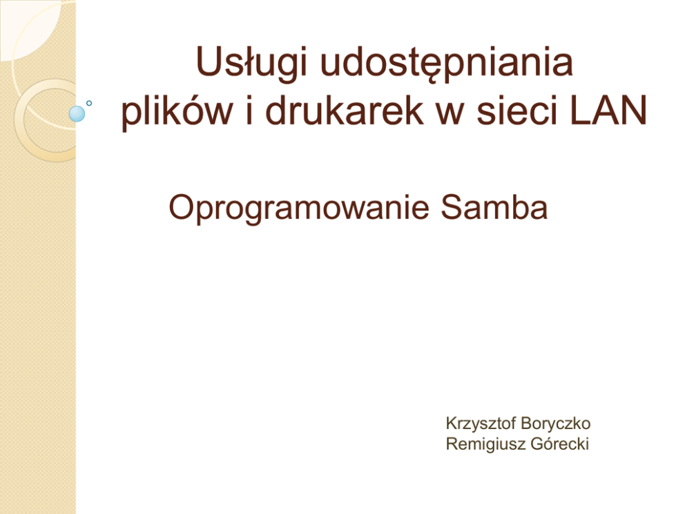 Usługi udostępniania plików i drukarek w sieci LAN Oprogramowanie Samba Krzysztof Boryczko Remigiusz Górecki Cechy Samby Samba jest serwerem plików i drukarek, który zawiera implementację protokołu SMB (Server Message Block). Samba realizuje cztery podstawowe rodzaje usług: 1. Udostępnianie plików i drukarek, 2. Uwierzytelnianie i Autoryzacja (w systemie Linux istnieją moduły PAM współpracujące s Sambą), 3. Rozwiązywanie nazw w sieci lokalnej, 4. Rozgłaszanie i lokalizacja usług (browsing). Strona domowa projektu, to: www.samba.org Historia Samby Pierwsza implementacja to prosty programik, który umożliwiał dostęp z komputera PC z systemem PATCHWORKS firmy Digital Equipment Corporation dla DOS do plików znajdujących się na komputerze Sun (serwer dla systemu SunOS, który obsługiwał pakiety przesyłane przez klienta PATCHWORKS). Była to implementacja protokołów NetBIOS nad TCP/IP oraz SMB (RFC1001, RFC1002). Pierwsza nazwa, SMB Server, była jednak zastrzeżona. Stąd jej twórca Adrew Tridgell znalazł słowo Samba, jako najprostsze zawierające litery s, m oraz b. Historia wersji 1991 r. – początki pracy nad oprogramowaniem, 1992 r. – wersja 1.0: a Unix file server for Dos Pathworks, 1993 r. – wersja 1.5 pod nazwą Samba współpracuje z Windows LAN Manager, 1999 r. – wersja 2.0; implementacja protokołów uwierzytelniania w Domenie NT (testy pokazują iż jest prawie 2 krotnie szybsza od Windows NT4, 2003 r. – wersja 3.0 umożliwia podłączanie klienta Samby do Microsoft Active Directory. 2006 r. – pierwsze wersje Samby 4 mającej pracować jako kontroler domeny AD – wciąż nie ma wersji produkcyjnej. 2009 r. – wersja 3.4 zawiera kod źródłowy Samby v3 i v4 Źródła popularności Samby Jest darmowa. Stanowi pakiet z otwartym dostępem do kodu źródłowego. Jest dostępna dla wielu platform: od UNIX, Linux po niszowe BeOS, OpenVMS. Może zatem integrować komputery PC z niemal każdym środowiskiem. Protokół SMB/CIFS leży u podstaw sieci Microsoft Windows, stąd Samba może zostać niskonakładowym i wysoko wydajnym substytutem serwera Windows. Posiada olbrzymią liczbę funkcji. Przykładowo aliasy NetBIOS czy serwery wirtualne. Pozwala na wykorzystywanie i integrację z innymi standardami (NIS, LDAP). Instalacja Samby – RH Możliwe pobranie gotowych pakietów instalacyjnych dla konkretnego systemu operacyjnego. Instalacja indywidualna. W systemach z rodziny Red Hat wykorzystujemy system zarządzania pakietami oprogramowania rpm. Instalacja prosta, ale niższa wydajność oraz brak możliwości wykorzystania opcji konfiguracyjnych. Możliwa jest instalacja z plików źródłowych dostępnych na stronie projektu – duże możliwości konfiguracyjne, jak również praca w trybie merged czyli zarówno w stabilnej wersji 3 jak i testowej wersji 4. Instalacja z kodu źródłowego Kod źródłowy w skompresowanych archiwach, np. samba-3.5.1.tar.gz Kolejne kroki: [root@dns1 ~]# tar -xzf samba-3.5.1.tar.gz [root@dns1 ~]# cd samba-3.5.1/source3 [root@dns1 source3]# ./autogen.sh ./ [root@dns1 source3]# ./configure ./ [root@dns1 source3]# ./make [root@dns1 source3]# ./make install Skrypt autogen.sh korzysta z programu narzędziowego Autoconf. W przypadku jego braku: [root@dns1 ~]# yum install autoconf Protokół SMB Protokół SMB Server Message Block stworzony został przez IBM w celu dostępu do systemu DOS z wykorzystaniem protokołu NetBIOS. Aktualnie umożliwia udostępnianie plików i drukarek z wykorzystaniem różnych protokołów niższych warstw. SMB pracuje w warstwie aplikacji modelu ISO-OSI. Protokół SMB z może wykorzystywać z niższych warstw następujące protokoły: ◦ NetBIOS, który posiada implementacje na wilelu protokołach niższych wastw, ◦ TCP (port 445) – co pozwala na integrację z nazwami FQDN . Jest to jeden z najbardziej zmieniających się i rozszerzanych protokołów w historii. Historia zmian protokołu SMB 1987 r. – Microsoft łączy go z LAN Manager, 1992 r. – Microsoft dodaje elementy by współpracował w środowisku Windows for Workgroups, 1996 r. – dodana jest obsługa protokołu NTLM dla Windows NT 4.0 i zmieniona nazwa na Common Internet File System (CIFS), 2000 r. – Microsoft wprowadza Direct hosting of SMB over TCP/IP, co uniezależnia go od protokołu NetBIOS i umożliwia standaryzację nazw w oparciu o DNS, 2007 r. – Microsoft wprowadza wersję 2.0 SMB, która przede wszystkim go upraszcza – usuwając nieużywane komendy (z ponad 100 zostaje 19) oraz wprowadza wiele innych zmian. Samba w modelu ISOISO-OSI Aplikacji SMB Prezentacji Sesji Aplikacji NetBIOS Transportowa Sieci IPX NetBIOS NetBEUI DECnet NetBIOS TCP & UDP TCP & UDP IP IP Łącza 802.2 802.3 802.5 802.2 802.3 802.5 Ethernet V2 Ethernet V2 Ethernet Fizyczna Fizyczna Fizyczna Fizyczna Fizyczna Fizyczna Protokół NetBIOS Protokół NetBIOS (Network Basic Input/Output System) stworzony przez IBM na potrzeby systemu DOS i prostej sieci LAN – protokół SNA był zbyt skomplikowany. Protokół NetBIOS pracuje w warstwie sesji modelu OSI. Do komunikacji może wykorzystywać takie protokoły jak: ◦ IPX/SPX – implementacja opracowana przez Microsoft. Daje dostęp do serwerów SMB dzięki protokołowi IPX/SPX firmy Novell. ◦ NetBEUI – wykorzystywany jedynie w środowiskach lokalnych. Nie posiada warstwy sieciowej, co uniemożliwia routing. ◦ DECnet – opracowany przez firmę Digital Equipment Corporation dla komunikacji komputerów klasy PC z serverami VAX. ◦ TCP/IP – NetBIOS over TCP/IP, często określany jako NetBT lub NBT. Stanowi implementację usług sesji w sieci TCP oraz datagramów NetBIOS w sieci UDP. Protokół NetBT Protokół NetBIOS over TCP/IP zdefiniowany jest przez RFC 1001 i RFC 1002. Protokół NetBT obsługuje co najmniej trzy rodzaje usług: 1. Usługi nazw – mechanizmy pozwalające na odszukiwanie komputerów według nazw (port 137 protokołu UDP). 2. Usługi sesji – mechanizmy po