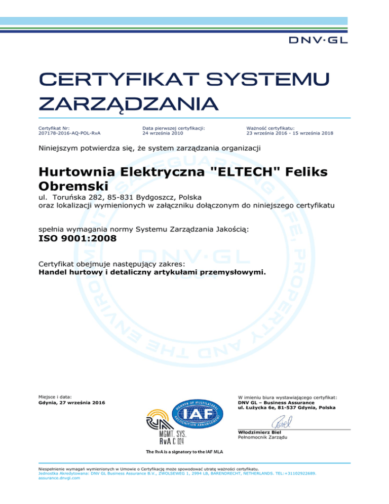 Certyfikat Nr: 207178-2016-AQ-POL-RvA Data pierwszej certyfikacji: 24 września 2010 Ważność certyfikatu: 23 września 2016 - 15 września 2018 Niniejszym potwierdza się, że system zarządzania organizacji Hurtownia Elektryczna "ELTECH" Feliks Obremski ul. Toruńska 282, 85-831 Bydgoszcz, Polska oraz lokalizacji wymienionych w załączniku dołączonym do niniejszego certyfikatu spełnia wymagania normy Systemu Zarządzania Jakością: ISO 9001:2008 Certyfikat obejmuje następujący zakres: Handel hurtowy i detaliczny artykułami przemysłowymi. Miejsce i data: Gdynia, 27 września 2016 W imieniu biura wystawiającego certyfikat: DNV GL – Business Assurance ul. Łużycka 6e, 81-537 Gdynia, Polska Włodzimierz Biel Pełnomocnik Zarządu Niespełnienie wymagań wymienionych w Umowie o Certyfikację może spowodować utratę ważności certyfikatu. Jednostka Akredytowana: DNV GL Business Assurance B.V., ZWOLSEWEG 1, 2994 LB, BARENDRECHT, NETHERLANDS. TEL:+31102922689. assurance.dnvgl.com Certyfikat Nr: 207178-2016-AQ-POL-RvA Miejsce i data: Gdynia, 27 września 2016 Załącznik do Certyfikatu Hurtownia Elektryczna "ELTECH" Feliks Obremski Następujące lokalizacje są objęte certyfikacją: Nazwa lokalizacji Hurtownia Elektryczna "ELTECH" Feliks Obremski Oddział Bydgoszcz Oddział Kołobrzeg Oddział Żnin Adres lokalizacji ul. Toruńska 282, 85-831 Bydgoszcz, Polska ul. Grunwaldzka 109, 85-241 Bydgoszcz, Polska ul. Szarych Szeregów 4, 78-100 Kołobrzeg, Polska ul. Mickiewicza 14, 88-400 Żnin, Polska Zakres certyfikacji Handel hurtowy i detaliczny przemysłowymi. Handel hurtowy i detaliczny przemysłowymi Handel hurtowy i detaliczny przemysłowymi Handel hurtowy i detaliczny przemysłowymi Niespełnienie wymagań wymienionych w Umowie o Certyfikację może spowodować utratę ważności certyfikatu. Jednostka Akredytowana: DNV GL Business Assurance B.V., ZWOLSEWEG 1, 2994 LB, BARENDRECHT, NETHERLANDS. TEL:+31102922689. assurance.dnvgl.com artykułami artykułami artykułami artykułami Strona 2 z 2