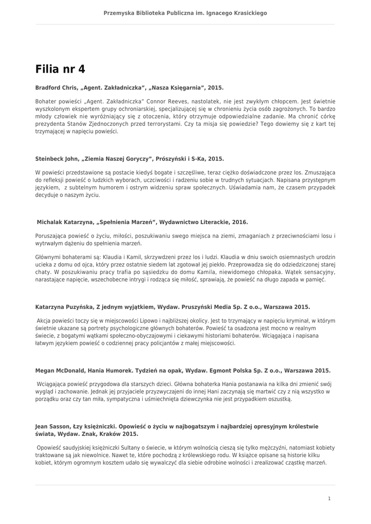 Przemyska Biblioteka Publiczna im. Ignacego Krasickiego Filia nr 4 Bradford Chris, „Agent. Zakładniczka”, „Nasza Księgarnia”, 2015. Bohater powieści „Agent. Zakładniczka” Connor Reeves, nastolatek, nie jest zwykłym chłopcem. Jest świetnie wyszkolonym ekspertem grupy ochroniarskiej, specjalizującej się w chronieniu życia osób zagrożonych. To bardzo młody człowiek nie wyróżniający się z otoczenia, który otrzymuje odpowiedzialne zadanie. Ma chronić córkę prezydenta Stanów Zjednoczonych przed terrorystami. Czy ta misja się powiedzie? Tego dowiemy się z kart tej trzymającej w napięciu powieści. Steinbeck John, „Ziemia Naszej Goryczy”, Prószyński i S-Ka, 2015. W powieści przedstawione są postacie kiedyś bogate i szczęśliwe, teraz ciężko doświadczone przez los. Zmuszająca do refleksji powieść o ludzkich wyborach, uczciwości i radzeniu sobie w trudnych sytuacjach. Napisana przystępnym językiem, z subtelnym humorem i ostrym widzeniu spraw społecznych. Uświadamia nam, że czasem przypadek decyduje o naszym życiu. Michalak Katarzyna, „Spełnienia Marzeń”, Wydawnictwo Literackie, 2016. Poruszająca powieść o życiu, miłości, poszukiwaniu swego miejsca na ziemi, zmaganiach z przeciwnościami losu i wytrwałym dążeniu do spełnienia marzeń. Głównymi bohaterami są: Klaudia i Kamil, skrzywdzeni przez los i ludzi. Klaudia w dniu swoich osiemnastych urodzin ucieka z domu od ojca, który przez ostatnie siedem lat zgotował jej piekło. Przeprowadza się do odziedziczonej starej chaty. W poszukiwaniu pracy trafia po sąsiedzku do domu Kamila, niewidomego chłopaka. Wątek sensacyjny, narastające napięcie, wszechobecne intrygi i rodząca się miłość, sprawiają, że powieść na długo zapada w pamięć. Katarzyna Puzyńska, Z jednym wyjątkiem, Wydaw. Pruszyński Media Sp. Z o.o., Warszawa 2015. Akcja powieści toczy się w miejscowości Lipowo i najbliższej okolicy. Jest to trzymający w napięciu kryminał, w którym świetnie ukazane są portrety psychologiczne głównych bohaterów. Powieść ta osadzona jest mocno w realnym świecie, z bogatymi wątkami społeczno-obyczajowymi i ciekawymi historiami bohaterów. Wciągająca i napisana łatwym językiem powieść o codziennej pracy policjantów z małej miejscowości. Megan McDonald, Hania Humorek. Tydzień na opak, Wydaw. Egmont Polska Sp. Z o.o., Warszawa 2015. Wciągająca powieść przygodowa dla starszych dzieci. Główna bohaterka Hania postanawia na kilka dni zmienić swój wygląd i zachowanie. Jednak jej przyjaciele przyzwyczajeni do innej Hani zaczynają się martwić czy z nią wszystko w porządku oraz czy tan miła, sympatyczna i uśmiechnięta dziewczynka nie jest przypadkiem oszustką. Jean Sasson, Łzy księżniczki. Opowieść o życiu w najbogatszym i najbardziej opresyjnym królestwie świata, Wydaw. Znak, Kraków 2015. Opowieść saudyjskiej księżniczki Sultany o świecie, w którym wolnością cieszą się tylko mężczyźni, natomiast kobiety traktowane są jak niewolnice. Nawet te, które pochodzą z królewskiego rodu. W książce opisane są historie kilku kobiet, którym ogromnym kosztem udało się wywalczyć dla siebie odrobine wolności i zrealizować cząstkę marzeń. 1 Przemyska Biblioteka Publiczna im. Ignacego Krasickiego Pokazane jest życie kobiet w Arabii Saudyjskiej w XXI wieku, w czasach Internetu i postępu na całym świecie. Andrzej Maleszka, „Magiczne drzewo. Świat Ogromnych”, Wydawnictwo Znak emotikon, Kraków 2015. Kolejny tom z cyklu „Magiczne drzewo” przenosi głównych bohaterów do Świata Ogromnych. Są oni jedynymi małymi istotami w świecie, gdzie wszystko jest ogromne. Po wielu perypetiach chcą powrócić na Ziemię, jednak okazuje się, że warunkiem powrotu jest odnalezienie i ułożenie tajemniczych puzzli. Peter Kerr, „Incydent w Dirleton”, Wydawnictwo Dolnośląskie, Wrocław 2015. Komedia kryminalna. Pełna intryg, zabawnych sytuacji i zaskakujących zwrotów akcji. Pensjonariuszka oddziału geriatrycznego zapisuje swój majątek kotu. Wkrótce zostaje zamordowana i ginie jej pupil. Dochodzenie w tej sprawie prowadzi detektyw Bob Burns, zaś tropy wiodą aż na Majorkę… Katarzyna Michalak, „Nie oddam dzieci”, Wydawnictwu Literackie, Kraków 2015. Powieść trzymająca w napięciu od początku do końca. Wzbudza skrajne emocje, pokazuje, że przy pomocy przyjaciół i życzliwych ludzi można podnieść się i z dna rozpaczy stanąć na nogi. Bardzo ciekawa, napisana przystępnym językiem. Trudno się od niej oderwać. Tanya Valko – SAGA ARABSKA – „Arabska żona” , „Arabka córka”, „Arabska krew” i „Arabska księżniczka”. Jeśli interesuje kogoś kultura arabska, to książki Tanyi Valko są bardzo dobrą lektura o tej tematyce. Autorka opisuje zwyczaje, kulturę i warunki życia w Libii. Dorota – Polka poznaje Ahmeda Salimi – Araba, który mieszkając w Polsce nie pochwala zachowania mężczyzn wobec kobiet w swoim ojczystym kraju. Wkrótce pobierają się. Język Tanyi Valko nie jest zbyt wyszukany, a słowniczek na końcu książki pomaga w lepszym zrozumieniu treści. 2