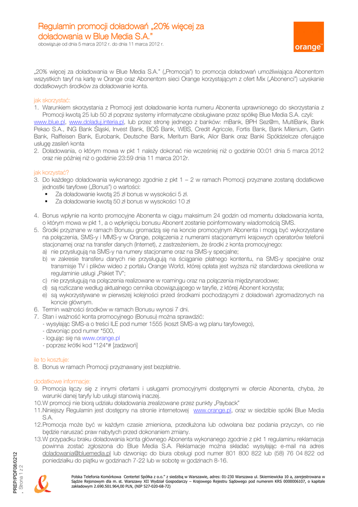 Regulamin promocji doładowań „20% więcej za doładowania w Blue Media S.A.” S.A.” obowiązuje od dnia 5 marca 2012 r. do dnia 11 marca 2012 r. „20% więcej za doładowania w Blue Media S.A.” („Promocja”) to promocja doładowań umożliwiająca Abonentom wszystkich taryf na kartę w Orange oraz Abonentom sieci Orange korzystającym z ofert Mix („Abonenci”) uzyskanie dodatkowych środków za doładowanie konta. jak skorzystać: 1. Warunkiem skorzystania z Promocji jest doładowanie konta numeru Abonenta uprawnionego do skorzystania z Promocji kwotą 25 lub 50 zł poprzez systemy informatyczne obsługiwane przez spółkę Blue Media S.A. czyli: www.blue.pl, www.doladuj.interia.pl, lub przez stronę jednego z banków: mBank, BPH Sez@m, MultiBank, Bank Pekao S.A., ING Bank Śląski, Invest Bank, BOŚ Bank, WBS, Credit Agricole, Fortis Bank, Bank Milenium, Getin Bank, Raiffeisen Bank, Eurobank, Deutsche Bank, Meritum Bank, Alior Bank oraz Banki Spółdzielcze oferujące usługę zasileń konta 2. Doładowania, o którym mowa w pkt 1 należy dokonać nie wcześniej niż o godzinie 00:01 dnia 5 marca 2012 oraz nie później niż o godzinie 23:59 dnia 11 marca 2012r. jak korzystać? 3. Do każdego doładowania wykonanego zgodnie z pkt 1 – 2 w ramach Promocji przyznane zostaną dodatkowe jednostki taryfowe („Bonus”) o wartości: Za doładowanie kwotą 25 zł bonus w wysokości 5 zł. Za doładowanie kwotą 50 zł bonus w wysokości 10 zł 4. Bonus wpłynie na konto promocyjne Abonenta w ciągu maksimum 24 godzin od momentu doładowania konta, o którym mowa w pkt 1, a o wpłynięciu bonusu Abonent zostanie poinformowany wiadomością SMS. 5. Środki przyznane w ramach Bonusu gromadzą się na koncie promocyjnym Abonenta i mogą być wykorzystane na połączenia, SMS-y i MMS-y w Orange, połączenia z numerami stacjonarnymi krajowych operatorów telefonii stacjonarnej oraz na transfer danych (Internet), z zastrzeżeniem, że środki z konta promocyjnego: a) nie przysługują na SMS-y na numery stacjonarne oraz na SMS-y specjalne; b) w zakresie transferu danych nie przysługują na ściąganie płatnego kontentu, na SMS-y specjalne oraz transmisje TV i plików wideo z portalu Orange World, której opłata jest wyższa niż standardowa określona w regulaminie usługi „Pakiet TV”; c) nie przysługują na połączenia realizowane w roamingu oraz na połączenia międzynarodowe; d) są rozliczane według aktualnego cennika obowiązującego w taryfie, z której Abonent korzysta; e) są wykorzystywane w pierwszej kolejności przed środkami pochodzącymi z doładowań zgromadzonych na koncie głównym. 6. Termin ważności środków w ramach Bonusu wynosi 7 dni. 7. Stan i ważność konta promocyjnego (Bonusu) można sprawdzić: - wysyłając SMS-a o treści ILE pod numer 1555 (koszt SMS-a wg planu taryfowego), - dzwoniąc pod numer *500, - logując się na www.orange.pl - poprzez krótki kod *124*# [zadzwoń] PREP/PDF08/0212 , Strona 1 z 2 ile to kosztuje: 8. Bonus w ramach Promocji przyznawany jest bezpłatnie. dodatkowe informacje: 9. Promocja łączy się z innymi ofertami i usługami promocyjnymi dostępnymi w ofercie Abonenta, chyba, że warunki danej taryfy lub usługi stanowią inaczej. 10. W promocji nie biorą udziału doładowania zrealizowane przez punkty „Payback” 11. Niniejszy Regulamin jest dostępny na stronie internetowej www.orange.pl, oraz w siedzibie spółki Blue Media S.A. 12. Promocja może być w każdym czasie zmieniona, przedłużona lub odwołana bez podania przyczyn, co nie będzie naruszać praw nabytych przed dokonaniem zmiany. 13. W przypadku braku doładowania konta głównego Abonenta wykonanego zgodnie z pkt 1 regulaminu reklamacja powinna zostać zgłoszona do Blue Media S.A. Reklamacje można składać wysyłając e-mail na adres [email protected] lub dzwoniąc do biura obsługi pod numer 801 800 822 lub (58) 76 04 822 od poniedziałku do piątku w godzinach 7-22 lub w sobotę w godzinach 8-16. Polska Telefonia Komórkowa Centertel Spółka z o.o.” z siedzibą w Warszawie, adres: 01-230 Warszawa ul. Skierniewicka 10 a, zarejestrowana w Sądzie Rejonowym dla m. st. Warszawy XII Wydział Gospodarczy – Krajowego Rejestru Sądowego pod numerem KRS 0000006107, o kapitale zakładowym 2.690.501.964,00 PLN, (NIP 527-020-68-72) PREP/PDF08/0212 , Strona 2 z 2 14. W pozostałym zakresie stosuje się obowiązujący Abonenta regulamin świadczenia usług telekomunikacyjnych przez Polską Telefonię Komórkową - Centertel sp. z o.o., oraz cennik usług. 15. Przez Sieć Orange należy rozumieć sieć telekomunikacyjną, której operatorem jest Polska Telefonia Komórkowa Centertel sp. z o.o. z siedzibą w Warszawie, adres: ul. Skierniewicka 10a, 01-230 Warszawa, zarejestrowana w rejestrze przedsiębiorców prowadzonym przez Sąd Rejonowy dla m.st. Warszawy, XII Wydział Gospodarczy Krajowego Rejestru Sądowego pod numerem KRS 0000006107, o kapitale zakładowym 2.690.501.964,00 PLN, nr NIP 527-020-68-72. 16. Przez spółkę Blue Media S.A. świadczącą usługę doładowania drogą elektroniczną poprzez systemy informatyczne, należy rozumieć spółkę akcyjną z siedzibą w Sopocie przy ul. Haffnera 6, zarejestrowaną w Sądzie Rejonowym Gdańsk-Północ w Gdańsku VIII Wydział Rejestrowy Krajowego Rejestru Sądowego pod nr KRS 0000320590; NIP 585-13-51-185. REGON 191781561 Polska Telefonia Komórkowa Centertel Spółka z o.o.” z siedzibą w Warszawie, adres: 01-230 Warszawa ul. Skierniewicka 10 a, zarejestrowana w Sądzie Rejonowym dla m. st. Warszawy XII Wydział Gospodarczy – Krajowego Rejestru Sądowego pod numerem KRS 0000006107, o kapitale zakładowym 2.690.501.964,00 PLN, (NIP 527-020-68-72)