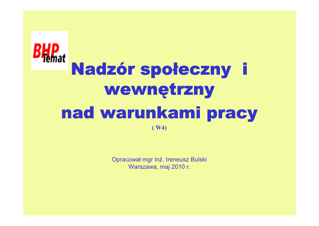 Nadzór społeczny i wewnętrzny nad warunkami pracy ( W4) Opracował mgr inż. Ireneusz Bulski Warszawa, maj 2010 r. Kodeks pracy; Nadzór nad prawem pracy i BHP • Art. 18(5)§ 1. Społeczną kontrolę przestrzegania prawa pracy, w tym przepisów i zasad bezpieczeństwa i higieny pracy, sprawuje społeczna inspekcja pracy. • § 2. Organizację, zadania i uprawnienia społecznej inspekcji pracy oraz zasady jej współdziałania z Państwową Inspekcją Pracy i innymi państwowymi organami nadzoru i kontroli określają odrębne przepisy. Nadzór społeczny i wewnętrzny nad warunkami BHP w firmie Społeczna Inspekcja Pracy Zakładowa organizacja Związku Zawodowego PRACODAWCA - zarząd, - kierownicy organizują pracę i sprawują bezpośredni nadzór, Służba BHP Komisja BHP, konsultacje z załogą lub pracownikami Ustawa o społecznej inspekcji pracy z dnia 24 czerwca 1983 r . ( Dz. U. Nr 35, poz. 163 z pózn. zm.) Art. 1. Społeczna inspekcja pracy jest służbą społeczną pełnioną przez pracowników, mającą na celu zapewnienie przez zakład pracy bezpiecznych i higienicznych warunków pracy oraz ochronę uprawnień pracowniczych, określonych w przepisach prawa pracy. Ustawa o społecznej inspekcji pracy Art. 2. Społeczna inspekcja pracy reprezentuje interesy wszystkich pracowników w zakładach pracy i jest kierowana przez zakładowe organizacje związkowe. Art. 6. 1. Społecznych inspektorów pracy wybierają i odwołują pracownicy zakładu pracy. 2. Społecznych inspektorów pracy wybiera się na okres 4 lat. Art. 13. 1. Zakład pracy nie może wypowiedzieć ani rozwiązać umowy o pracę z pracownikiem pełniącym funkcję społecznego inspektora pracy w czasie trwania mandatu oraz w okresie roku po jego wygaśnięciu…….., Ustawa o społecznej inspekcji pracy Art. 4. Społeczni inspektorzy pracy mają prawo: 1) kontrolować stan budynków, maszyn, urządzeń technicznych i sanitarnych oraz procesy technologiczne z punktu widzenia BHP, 2) kontrolować przestrzeganie przepisów prawa pracy i BHP, w tym postanowień układów zbiorowych i regulaminów pracy, uprawnień pracowników związanych z rodzicielstwem, młodocianych i osób niepełnosprawnych, urlopów i czasu pracy, świadczeń z tytułu wypadków przy pracy i chorób zawodowych, 3) brać udział w ustalaniu okoliczności i przyczyn wypadków przy pracy, zgodnie z przepisami prawa pracy, Ustawa o społecznej inspekcji pracy cd. Art.4. Społeczni inspektorzy pracy mają prawo: 4) brać udział w analizowaniu przyczyn powstawania wypadków przy pracy, zachorowań na choroby zawodowe i inne schorzenia wywołane warunkami środowiska pracy oraz kontrolować stosowanie przez zakłady pracy właściwych środków zapobiegawczych, 5) uczestniczyć w przeprowadzaniu społecznych przeglądów warunków pracy, 6) opiniować projekty planów poprawy warunków BHP i planów rehabilitacji zawodowej oraz kontrolować realizację tych planów, 7 ) podejmować działania na rzecz aktywnego udziału pracowników zakładów pracy w kształtowaniu właściwych warunków BHP oraz oddziaływać na przestrzeganie przez pracowników przepisów i zasad BHP. Ustawa o społecznej inspekcji pracy . • Art. 8. 1. Społeczny inspektor pracy ma prawo wstępu w każdym czasie do pomieszczeń i urządzeń zakładu pracy dla wykonywania zadań określonych w art. 4. • 2. Społeczny inspektor pracy ma prawo żądać od kierownika zakładu pracy oraz oddziału (wydziału) i od pracowników informacji oraz okazania dokumentów w sprawach wchodzących w zakres jego działania. Ustawa o społecznej inspekcji pracy Art. 9. 1. W razie stwierdzenia, że nie są przestrzegane przepisy, społeczny inspektor pracy informuje o tym kierownika zakładu pracy oraz oddziału (wydziału), czyniąc jednocześnie stosowny zapis w księgach zaleceń i uwag SIP. 2. Kierownik zakładu pracy oraz oddziału (wydziału) podejmuje decyzję w sprawie usunięcia stwierdzonych nieprawidłowości i informuje o tym społecznego inspektora pracy. Ustawa o społecznej inspekcji pracy Art. 11. 1. Na podstawie ustaleń zakładowy SIP wydaje pracodawcy, w formie pisemnej, zalecenie usunięcia w określonym terminie stwierdzonych uchybień. 2. W razie bezpośredniego zagrożenia mogącego spowodować wypadek przy pracy, zakładowy SIP występuje do pracodawcy o natychmiastowe usunięcie tego zagrożenia, a w wypadku niepodjęcia odpowiednich działań wydaje, w formie pisemnej, zalecenie wstrzymania pracy danego urządzenia technicznego lub określonych robót, zawiadamiając o tym równocześnie zakładowe organizacje związkowe. 3. Pracodawca może wnieść sprzeciw od zalecenia zakładowego SIP do właściwego inspektora pracy PIP. Sprzeciw od zalecenia, o którym mowa w ust. 1, wnosi się w terminie 7 dni od dnia doręczenia zalecenia, a od zalecenia, o którym mowa w ust. 2 - niezwłocznie. Ustawa o społecznej inspekcji pracy . Art.11.4. W razie wniesienia sprzeciwu od zalecenia SIP, inspektor pracy PIP wydaje decyzję lub podejmuje inne środki prawne przewidziane w przepisach o Państwowej Inspekcji Pracy. Art. 20. Zakładowy społeczny inspektor pracy ma prawo uczestniczyć w kontrolach przeprowadzanych w zakładzie przez inspektora pracy PIP oraz w podsumowaniu kontroli. Ustawa o społecznej inspekcji pracy . Odpowiedzialność za naruszenie przepisów o SIP. Art. 22. 1. Kto działając w imieniu zakładu pracy narusza przepisy niniejszej ustawy, a w szczególności uniemożliwia działalność społecznego inspektora pracy, podlega karze grzywny . 2. Tej samej karze podlega, kto nie wykonuje zalecenia zakładowego społecznego inspektora pracy. 3. Orzekanie następuje na podstawie wniosku pochodzącego od inspektora PIP w trybie określonym w dziale VII Kodeksu postępowania w sprawach o wykroczenia. NADZÓR ZWIĄZKÓW ZAWODOWYCH NAD STANEM BHP Ustawa z dnia 23 maja 1991 r. o związkach zawodowych (Dz. U. z 2001 r. nr 79, poz. 854). Art. 23. Związki zawodowe sp