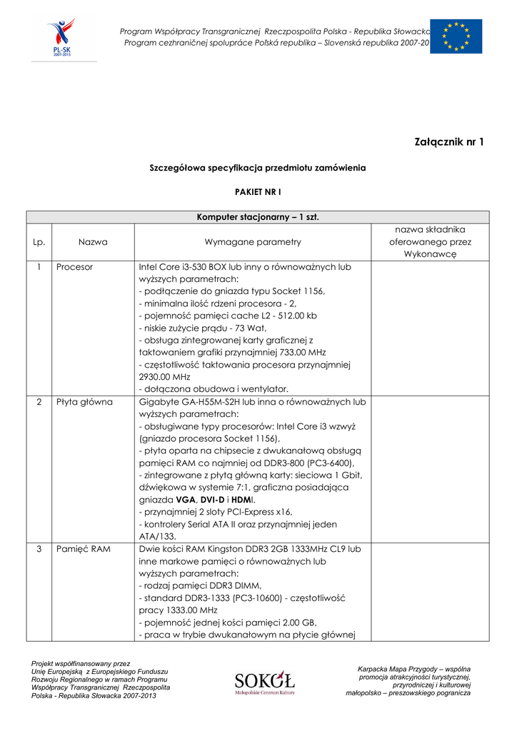 Program Współpracy Transgranicznej Rzeczpospolita Polska - Republika Słowacka 2007-2013 Program cezhraničnej spolupráce Poľská republika – Slovenská republika 2007-2013 Załącznik nr 1 Szczegółowa specyfikacja przedmiotu zamówienia PAKIET NR I Komputer stacjonarny – 1 szt. Lp. Nazwa 1 Procesor 2 Płyta główna 3 Pamięć RAM nazwa składnika oferowanego przez Wykonawcę Wymagane parametry Intel Core i3-530 BOX lub inny o równowaŜnych lub wyŜszych parametrach: - podłączenie do gniazda typu Socket 1156, - minimalna ilość rdzeni procesora - 2, - pojemność pamięci cache L2 - 512.00 kb - niskie zuŜycie prądu - 73 Wat, - obsługa zintegrowanej karty graficznej z taktowaniem grafiki przynajmniej 733.00 MHz - częstotliwość taktowania procesora przynajmniej 2930.00 MHz - dołączona obudowa i wentylator. Gigabyte GA-H55M-S2H lub inna o równowaŜnych lub wyŜszych parametrach: - obsługiwane typy procesorów: Intel Core i3 wzwyŜ (gniazdo procesora Socket 1156), - płyta oparta na chipsecie z dwukanałową obsługą pamięci RAM co najmniej od DDR3-800 (PC3-6400), - zintegrowane z płytą główną karty: sieciowa 1 Gbit, dźwiękowa w systemie 7:1, graficzna posiadająca gniazda VGA, DVI-D i HDMI. - przynajmniej 2 sloty PCI-Express x16, - kontrolery Serial ATA II oraz przynajmniej jeden ATA/133. Dwie kości RAM Kingston DDR3 2GB 1333MHz CL9 lub inne markowe pamięci o równowaŜnych lub wyŜszych parametrach: - rodzaj pamięci DDR3 DIMM, - standard DDR3-1333 (PC3-10600) - częstotliwość pracy 1333.00 MHz - pojemność jednej kości pamięci 2.00 GB, - praca w trybie dwukanałowym na płycie głównej Projekt współfinansowany przez Unię Europejską z Europejskiego Funduszu Rozwoju Regionalnego w ramach Programu Współpracy Transgranicznej Rzeczpospolita Polska - Republika Słowacka 2007-2013 Karpacka Mapa Przygody – wspólna promocja atrakcyjności turystycznej, przyrodniczej i kulturowej małopolsko – preszowskiego pogranicza Program Współpracy Transgranicznej Rzeczpospolita Polska - Republika Słowacka 2007-2013 Program cezhraničnej spolupráce Poľská republika – Slovenská republika 2007-2013 4 Dysk twardy 5 Napęd optyczny 6 Obudowa 7 Klawiatura komputerowa – 2x2GB, - gwarancja 60 miesięcy. Dysk twardy Samsung SpinPoint F3 500 GB lub inny o równowaŜnych lub wyŜszych parametrach: - format szerokości dysku 3.5 cala, - pojemność przynajmniej 500.00 GB, - interface Serial ATA II (300 MB/s), - prędkość obrotowa talerza 7200.00 obr./min. - pamięć cache przynajmniej 16 MB, - zastosowana technologia NCQ. Napęd optyczny Pioneer DVR-S18L (Serial ATA) BOX wraz z oprogramowaniem lub inny o równowaŜnych lub wyŜszych parametrach: - zapis DVD+/-R - 22.00 razy, - zapis DVD+/-RW - 12.00 razy, - zapis DVD+/-R DL - 12.00 razy, - zapis CD-R - 40.00 razy, - zapis CD-RW - 32.00 razy, - czas dostępu dla płyty CD - 110.00 ms. - czas dostępu dla płyty DVD - 110.00 ms. - interfejs Serial ATA, - cicha i stabilna praca, - kolor przedniego panelu pasujący do koloru obudowy Obudowa z zasilaczem Chieftec BD-02B-B - 355W lub inna o równowaŜnych lub wyŜszych parametrach: - typ obudowy Midi Tower z obsługą płyt głównych w standardzie micro-ATX - 2 kieszenie zewnętrzne 5.25 cala, - 2 kieszenie zewnętrzne 3.5 cala, - 2 kieszenie wewnętrzne 3.5 cala, - moc zasilacza 350 W PSII, - elementy kontrolne na przednim panelu: Power LED i HDD LED, Reset - złącza na przednim panelu: audio, 2x USB, - moŜliwość opcjonalnego zamontowania do 3 wentylatorów 92mm, - moŜliwość wpięcia 4 slotów kart rozszerzeń standardowego typu, - moŜliwość zabezpieczenia kłódką przed nieautoryzowanym otwarciem obudowy, - obudowa musi charakteryzować się solidnością i starannością wykonania, elementy metalowe wykonane z grubej blachy. Typ klawiatury - QWERTY, numer seryjny, podkładka pod nadgarstki, przewodowa, długość przewodu Projekt współfinansowany przez Unię Europejską z Europejskiego Funduszu Rozwoju Regionalnego w ramach Programu Współpracy Transgranicznej Rzeczpospolita Polska - Republika Słowacka 2007-2013 Karpacka Mapa Przygody – wspólna promocja atrakcyjności turystycznej, przyrodniczej i kulturowej małopolsko – preszowskiego pogranicza Program Współpracy Transgranicznej Rzeczpospolita Polska - Republika Słowacka 2007-2013 Program cezhraničnej spolupráce Poľská republika – Slovenská republika 2007-2013 2 szt. 8 9 Mysz komputerowa – 2 szt. System operacyjny minimum 180cm, wtyczka USB W sekcji klawiszy sterujących pomiędzy wierszem z klawiszami Delete-End-Page Down a klawiszami strzałkowymi wola przestrzeń, (nie mogą się tam znajdować inne klawisze dodatkowe) Mysz przewodowa, optyczna o rozdzielczości minimum 800 DPI, minimum 3 przyciski: przycisk w rolce przewijanej w pionie, numer seryjny System operacyjny Microsoft Windows 7 Home Premium PL OEM 64Bit Monitor komputerowy – 2 szt. Lp. 10 Nazwa Monitor dla grafika nazwa składnika oferowanego przez Wykonawcę Wymagane parametry Eizo FlexScan S1932SE-GY z podstawką EZ-UP, równowaŜny lub o wyŜszych parametrach technicznych z wymaganiami określonymi poniŜej: - przekątna minimalna 19”, matryca TFT antyodblaskowa, max. rozmiar piksela 0,294 mm; rozdzielczość domyślna 1280x1024; (matryca S-PVA z overdrive); ilość kolorów - 16,77 miliona - kontrast dynamiczny - 2500:1; max. kąt widoczności 178/178; jasność - 250cd/m2; - częstotliwość odświeŜania (pionowo) sygnał analogowy: 50–75 Hz (bez przeplotu); sygnał cyfrowy: 59–61 Hz (bez przeplotu); (VGA TEXT: 69–71 Hz) - taktowanie piksela (maksymalnie) sygnał analogowy: 135 MHz; sygnał cyfrowy: 108 MHz - Złącza: DVI-D (hdcp); D-SUB mini; gniazdo stereo audio mini-jack; USB zgodny ze standardem USB 2.0; USB porty Upstream ×1 - głośniki stereofoniczne o mocy 0,5W kaŜdy z tyłu monitora - regulacja połoŜenia (pochylenie/obrót w poziomie/PIVOT/wysokość) z podstawą (np. EZ-UP): 25° 