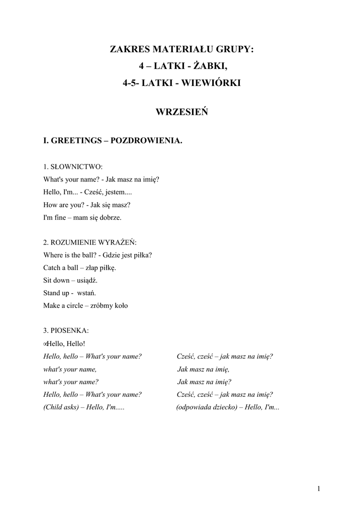 ZAKRES MATERIAŁU GRUPY: 4 – LATKI - ŻABKI, 4-5- LATKI - WIEWIÓRKI WRZESIEŃ I. GREETINGS – POZDROWIENIA. 1. SŁOWNICTWO: What's your name? - Jak masz na imię? Hello, I'm... - Cześć, jestem.... How are you? - Jak się masz? I'm fine – mam się dobrze. 2. ROZUMIENIE WYRAŻEŃ: Where is the ball? - Gdzie jest piłka? Catch a ball – złap piłkę. Sit down – usiądź. Stand up - wstań. Make a circle – zróbmy koło 3. PIOSENKA: •Hello, Hello! Hello, hello – What's your name? Cześć, cześć – jak masz na imię? what's your name, Jak masz na imię, what's your name? Jak masz na imię? Hello, hello – What's your name? Cześć, cześć – jak masz na imię? (Child asks) – Hello, I'm..... (odpowiada dziecko) – Hello, I'm... 1 II. FAMILY – RODZINA. 1. SŁOWNICTWO: mummy – mama daddy – tata sister – siostra brother – brat grandma – babcia grandpa – dziadek 2. ROZUMIENIE WYRAŻEŃ: Who's this? - kto to jest? This is my... - to jest mój / moja... This is my family – to jest moja rodzina III. VEHICLES – POJAZDY. 1. SŁOWNICTWO: car - auto bike - rower bus – autobus train - pociąg plane - samolot ship – statek 2. ROZUMIENIE WYRAŻEŃ: go to... - idź do... point to... - wskaż... be a...- bądź...(np. Autem) – dzieci naśladują ruch i dźwięk danego pojazdu. Stop/ go … - stój/ idź 2 IV. AUTUMN – JESIEŃ. •SŁOWNICTWO: autumn - jesień forest - las leaves - liście tree - drzewo chestnut – kasztan red - czerwowny yellow - żółty blue – niebieski green - zielony orange - pomarańczowy brown - brown black – czarny numbers 1 – 10 •ROZUMIENIE WYRAŻEŃ: Let's count! - policz How many? - ile? What colour is it? - co to za kolor? Go to … - idź do... Point to.. - wskaż... V. FOREST ANIMALS. •SŁOWNICTWO: squirrel – wiewiórka fox – lis owl – sowa 3 hedgehog – jeż wolf – wilk bear – niedźwiedź doe – sarna •ROZUMIENIE WYRAŻEŃ: What's this? - co to jest? Be a … - bądź... In the forest – W lesie What animal is it? - co to za zwierzę? PAŹDZIERNIK I. FRUIT – OWOCE. •SŁOWNICTWO: apple – jabłko peach – brzoskwinia pear – gruszka plum – śliwka cherry – wiśnia banana – banan orange – pomarańcza lemon – cytryna •ROZUMIENIE WYRAŻEŃ: I like …( apple) – lubię (jabłka) I don't like...( pear) - nie lubię (gruszki) Do you like apple? - lubisz jabłko? Tropical fruit – owoc tropikalny 4 II. VEGETABLES – WARZYWA. •SŁOWNICTWO: cucumber – ogórek carrot – marchewka potato – ziemniak tomato – pomidor •ROZUMIENIE WYRAŻEŃ: I like …( cucumber) – lubię (ogórki) I don't like...( tomato) - nie lubię (pomidora) Do you like carrot? - lubisz marchewkę? III. EMOTIONS – EMOCJE. •SŁOWNICTWO: happy – szczęśliwy sad - smutny angry - zły scared – przestraszony surprised. - zaskoczony I'm ...(happy, angry itp.,) - budowanie zdań. •ROZUMIENIE WYRAŻEŃ: How are you? - jak się czujesz? What emotion is it? - co to za emocja? •PIOSENKA: 5 •1.If you're happy. If you're happy, happy, happy 1.Jeśli jesteś szczęśliwy, clap your hands (clap,clap). x2 klaszcz w dłonie. ( klaszczemy 2 razy) x2 If you're happy, happy, happy Jeśli jesteś szczęśliwy, clap your hands, clap your hands. klaszcz w dłonie, klaszcz w dłonie. If you're happy, happy, happy Jeśli jesteś szczęśliwy, clap your hands (clap,clap). x2 klaszcz w dłonie. ( klaszczemy 2 razy) 2. If you're angry, angry, angry 2. Jeśli jesteś zły, stamp your feet (stamp, stamp). x2 tup nogami. (tupiemy 2 razy) If you're angry, angry, angry Jeśli jesteś zły, stamp your feet, stamp your feet. tup nogami, tup nogami. If you're angry, angry, angry Jeśli jesteś zły, stamp your feet (stamp, stamp). x2 tup nogami. (tupiemy 2 razy) 3.If you're scared, scared, scared 3. Jeśli jesteś wystraszony, say oh, no! (oh no!). x2 mów: O, nie! (o, nie!) x2 If you're scared, scared, scared Jeśli jesteś wystraszony, say oh, no!, say oh, no! mów: O, nie!, mów: O, nie! If you're scared, scared, scared Jeśli jesteś wystraszony, say oh, no! (oh no!). x2 mów: O, nie! (o, nie!) IV. PARTS OF THE BODY. •SŁOWNICTWO: head - głowa nose – nos mouth – usta eyes – oczy ears – uszy hands - ręce 6 feet – nogi shoulders - ramiona knees – kolana toes – palce u nóg •ROZUMIENIE WYRAŻEŃ: Touch your... (nose) – dotknij... (nos) shake your hands – potrząśnij rękami stamp your feet – tup nogami nod your head – potrząsaj głową •PIOSENKA: •Head, shoulders, knees and toes Head, shoulders, knees and toes, knees and toes.x2 Eyes, and ears and mouth and nose. Head, shoulders, knees and toes, knees and toes. •Głowa, ramiona, kolana i palce, kolana i palce. x2 Oczy, uszy, usta i nos. Głowa, ramiona, kolana i palce, kolana i palce. 7