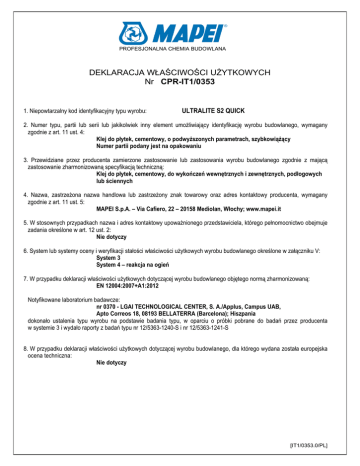 PROFESJONALNA CHEMIA BUDOWLANA DEKLARACJA WŁAŚCIWOŚCI UŻYTKOWYCH Nr CPR-IT1/0353 1. Niepowtarzalny kod identyfikacyjny typu wyrobu: ULTRALITE S2 QUICK 2. Numer typu, partii lub serii lub jakikolwiek inny element umożliwiający identyfikację wyrobu budowlanego, wymagany zgodnie z art. 11 ust. 4: Klej do płytek, cementowy, o podwyższonych parametrach, szybkowiążący Numer partii podany jest na opakowaniu 3. Przewidziane przez producenta zamierzone zastosowanie lub zastosowania wyrobu budowlanego zgodnie z mającą zastosowanie zharmonizowaną specyfikacją techniczną: Klej do płytek, cementowy, do wykończeń wewnętrznych i zewnętrznych, podłogowych lub ściennych 4. Nazwa, zastrzeżona nazwa handlowa lub zastrzeżony znak towarowy oraz adres kontaktowy producenta, wymagany zgodnie z art. 11 ust. 5: MAPEI S.p.A. – Via Cafiero, 22 – 20158 Mediolan, Włochy; www.mapei.it 5. W stosownych przypadkach nazwa i adres kontaktowy upoważnionego przedstawiciela, którego pełnomocnictwo obejmuje zadania określone w art. 12 ust. 2: Nie dotyczy 6. System lub systemy oceny i weryfikacji stałości właściwości użytkowych wyrobu budowlanego określone w załączniku V: System 3 System 4 – reakcja na ogień 7. W przypadku deklaracji właściwości użytkowych dotyczącej wyrobu budowlanego objętego normą zharmonizowaną: EN 12004:2007+A1:2012 Notyfikowane laboratorium badawcze: nr 0370 - LGAI TECHNOLOGICAL CENTER, S. A./Applus, Campus UAB, Apto Correos 18, 08193 BELLATERRA (Barcelona); Hiszpania dokonało ustalenia typu wyrobu na podstawie badania typu, w oparciu o próbki pobrane do badań przez producenta w systemie 3 i wydało raporty z badań typu nr 12/5363-1240-S i nr 12/5363-1241-S 8. W przypadku deklaracji właściwości użytkowych dotyczącej wyrobu budowlanego, dla którego wydana została europejska ocena techniczna: Nie dotyczy [IT1/0353.0/PL] PROFESJONALNA CHEMIA BUDOWLANA 9. Deklarowane właściwości użytkowe: Zasadnicze charakterystyki Klasa reakcji na ogień Wytrzymałość złącza, jako: Przyczepność początkowa Przyczepność wczesna Trwałość: Przyczepność po starzeniu termicznym Przyczepność po zanurzeniu w wodzie Przyczepność po cyklach zamrażania i rozmrażania Uwalnianie / zawartość substancji niebezpiecznych Właściwości użytkowe Zharmonizowana specyfikacja techniczna E ≥ 1,0 N/mm2 ≥ 0,5 N/mm2 EN 12004:2007 N/mm2 ≥ 1,0 ≥ 1,0 N/mm2 ≥ 1,0 N/mm2 + A1:2012 Patrz karta charakterystyki 10. Właściwości użytkowe wyrobu określone w pkt. 1 i 2 są zgodne z właściwościami użytkowymi deklarowanymi w pkt. 9. Niniejsza deklaracja właściwości użytkowych wydana zostaje na wyłączną odpowiedzialność producenta określonego w pkt. 4. W imieniu producenta podpisał: Paolo Murelli Zarządzający Systemami Jakości Grupy Mapei Mediolan, 01.07.2013r. ……………………………………. podpis [IT1/0353.0/PL]