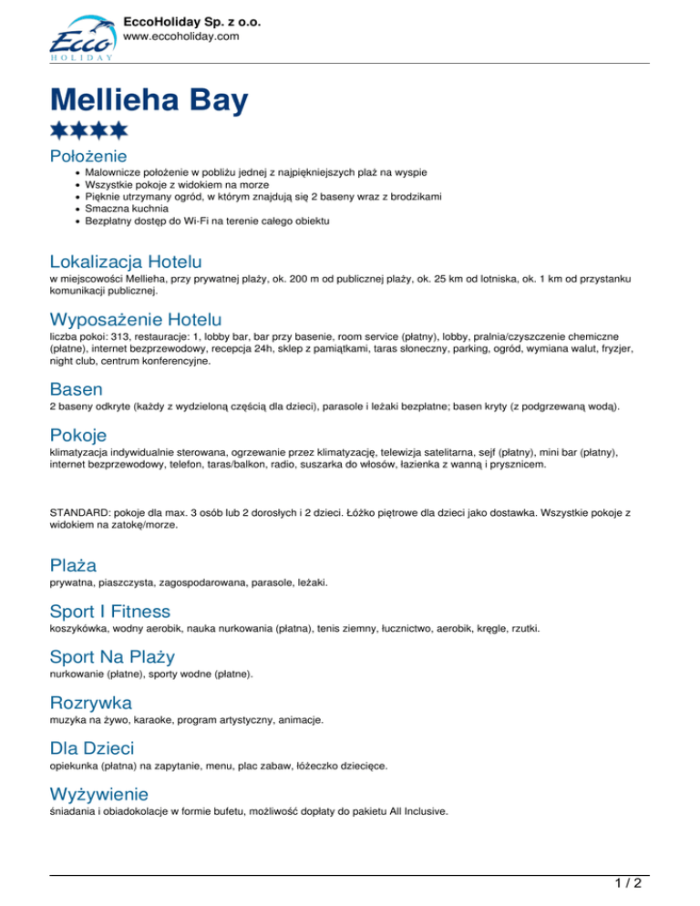 EccoHoliday Sp. z o.o. www.eccoholiday.com Mellieha Bay Położenie Malownicze położenie w pobliżu jednej z najpiękniejszych plaż na wyspie Wszystkie pokoje z widokiem na morze Pięknie utrzymany ogród, w którym znajdują się 2 baseny wraz z brodzikami Smaczna kuchnia Bezpłatny dostęp do Wi-Fi na terenie całego obiektu Lokalizacja Hotelu w miejscowości Mellieha, przy prywatnej plaży, ok. 200 m od publicznej plaży, ok. 25 km od lotniska, ok. 1 km od przystanku komunikacji publicznej. Wyposażenie Hotelu liczba pokoi: 313, restauracje: 1, lobby bar, bar przy basenie, room service (płatny), lobby, pralnia/czyszczenie chemiczne (płatne), internet bezprzewodowy, recepcja 24h, sklep z pamiątkami, taras słoneczny, parking, ogród, wymiana walut, fryzjer, night club, centrum konferencyjne. Basen 2 baseny odkryte (każdy z wydzieloną częścią dla dzieci), parasole i leżaki bezpłatne; basen kryty (z podgrzewaną wodą). Pokoje klimatyzacja indywidualnie sterowana, ogrzewanie przez klimatyzację, telewizja satelitarna, sejf (płatny), mini bar (płatny), internet bezprzewodowy, telefon, taras/balkon, radio, suszarka do włosów, łazienka z wanną i prysznicem. STANDARD: pokoje dla max. 3 osób lub 2 dorosłych i 2 dzieci. Łóżko piętrowe dla dzieci jako dostawka. Wszystkie pokoje z widokiem na zatokę/morze. Plaża prywatna, piaszczysta, zagospodarowana, parasole, leżaki. Sport I Fitness koszykówka, wodny aerobik, nauka nurkowania (płatna), tenis ziemny, łucznictwo, aerobik, kręgle, rzutki. Sport Na Plaży nurkowanie (płatne), sporty wodne (płatne). Rozrywka muzyka na żywo, karaoke, program artystyczny, animacje. Dla Dzieci opiekunka (płatna) na zapytanie, menu, plac zabaw, łóżeczko dziecięce. Wyżywienie śniadania i obiadokolacje w formie bufetu, możliwość dopłaty do pakietu All Inclusive. 1/2 EccoHoliday Sp. z o.o. www.eccoholiday.com Cena nie zawiera obowiązkowej dopłaty do kolacji wigilijnej (24/12) 100zł/os. (dzieci 50zł/os.) oraz sylwestrowej 140zł/os. (dzieci 70zł/os.). All Inclusive Zawiera śniadanie, lunch i obiadokolację w formie bufetu w głównej restauracji; lokalne alkohole oraz napoje bezalkoholowe w wybranych barach o wyznaczonych porach. Informacje Dodatkowe Popeye Village Fun Park (www.popeyemalta.com) - ok. 3 km od hotelu. Oferta: Wylot 01.01.1970 Powrót 01.01.1970 godz. godz. Zakwaterowanie -() Dni dni Cena os. dorosła 2/2 Powered by TCPDF (www.tcpdf.org)