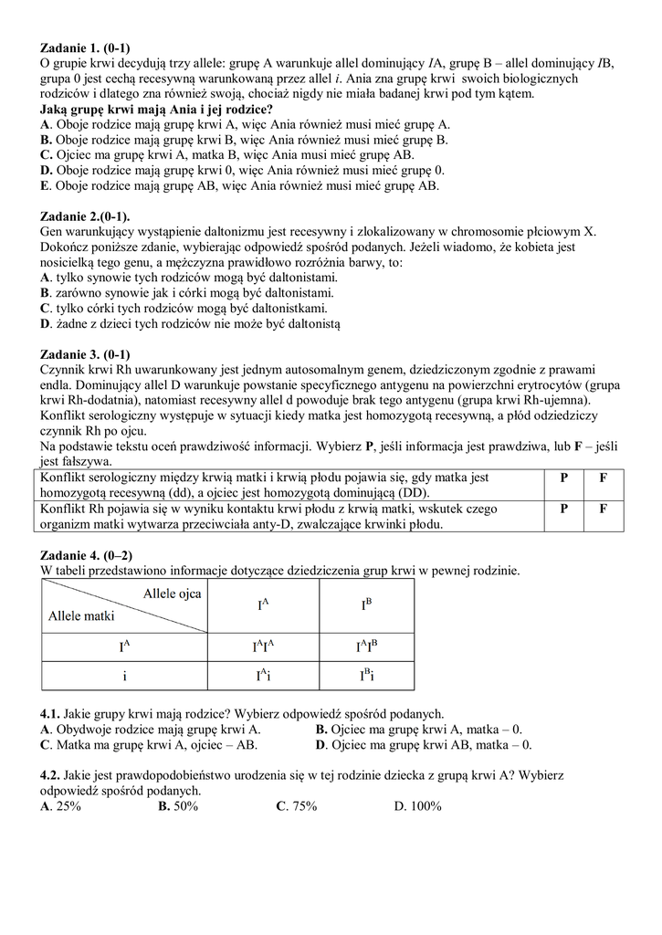 Zadanie 1. (0-1) O grupie krwi decydują trzy allele: grupę A