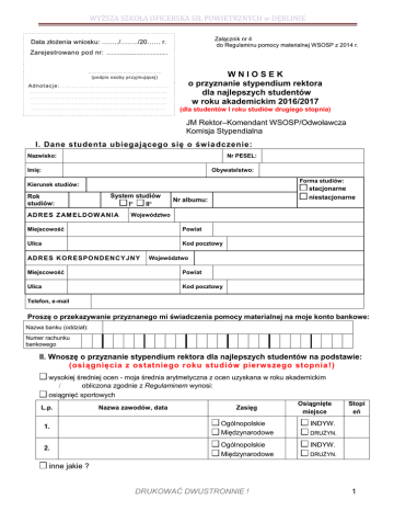 WYŻSZA SZKOŁA OFICERSKA SIŁ POWIETRZNYCH w DĘBLINIE Załącznik nr 4 do Regulaminu pomocy materialnej WSOSP z 2014 r. Data złożenia wniosku: ….…./….…./20…… r. Zarejestrowano pod nr: ..................................... .................................................. (podpis osoby przyjmującej) Adnotacje:………………………………………………. …………………………………………………………… …………………………………………………………… …………………………………………………………… …..……………………………………………………... WNIOSEK o przyznanie stypendium rektora dla najlepszych studentów w roku akademickim 2016/2017 (dla studentów I roku studiów drugiego stopnia) JM Rektor–Komendant WSOSP/Odwoławcza Komisja Stypendialna I. Dane studenta ubiegającego się o św ia dczenie: Nazwisko: Nr PESEL: Imię: Obywatelstwo: Forma studiów: Kierunek studiów: Rok studiów: System studiów Iº IIº AD R E S Z AM E LDO W ANI A stacjonarne niestacjonarne Nr albumu: Województwo Miejscowość Powiat Ulica Kod pocztowy AD R E S K O R E S PO ND EN CY JNY Województwo Miejscowość Powiat Ulica Kod pocztowy Telefon, e-mail Proszę o przekazywanie przyznanego mi świadczenia pomocy materialnej na moje konto bankowe: Nazwa banku (oddział): Numer rachunku bankowego II. Wnoszę o przyznanie stypendium rektora dla najlepszych studentów na podstawie: (osiągnięcia z ostatniego roku studiów pierwszego stopnia !) wysokiej średniej ocen - moja średnia arytmetyczna z ocen uzyskana w roku akademickim / obliczona zgodnie z Regulaminem wynosi: osiągnięć sportowych L.p. 1. 2. Nazwa zawodów, data Zasięg Osiągnięte miejsce Ogólnopolskie Międzynarodowe INDYW. Ogólnopolskie Międzynarodowe INDYW. Stopi eń DRUŻYN. DRUŻYN. inne jakie ? DRUKOWAĆ DWUSTRONNIE ! 1 WYŻSZA SZKOŁA OFICERSKA SIŁ POWIETRZNYCH w DĘBLINIE III. Oświadczenia ubiegającego się o świadczenia pomocy materialnej. Uprzedzony/a o odpowiedzialności karnej za przestępstwo określone w art. 233 § 1 Kodeksu karnego1 i art. 286 Kodeksu karnego2 oraz odpowiedzialności cywilnej i dyscyplinarnej z art. 211 ust. 1 ustawy z dnia 27 lipca 2005 r. - Prawo o szkolnictwie wyższym3 oświadczam, że: - przedłożone przeze mnie zaświadczenia (oświadczenia), dyplomy są zgodne z prawdą, podane przeze mnie we wniosku dane są zgodne ze stanem faktycznym, - - zapoznałem/am się z treścią art. 184 ust. 4 i 5 ustawy z dnia 27 lipca 2005 r. - Prawo o szkolnictwie 4 wyższym i oświadczam, że do dnia złożenia wniosku o pomoc materialną, nie ukończyłem/am innego kierunku studiów, a w przypadku ukończenia w trakcie roku innego kierunku studiów zobowiązuję się niezwłocznie powiadomić o tym na piśmie dziekanat ukończyłem/am już inny kierunek studiów. dodatkowo studiuję (podać nazwę uczelni oraz rok, poziom i kierunek studiów): ..................................... - odbywałem/am już studia (podać nazwę uczelni oraz lata, poziom i kierunek studiów) - posiadam już tytuł zawodowy magistra lub równorzędny - nie składałem/am wniosku, nie pobieram i nie będę w tym roku akademickim pobierać stypendium rektora i stypendium ministra na innej uczelni lub/i innym kierunku studiów, a w przypadku pobierania wymienionych świadczeń na innym kierunku lub innej uczelni zobowiązuję się niezwłocznie powiadomić o tym na piśmie właściwy dziekanat, - zgodnie z ustawą z dnia 29.08.1997 r. o ochronie danych osobowych wyrażam zgodę na przetwarzanie przez Wyższą Szkołę Oficerską Sił Powietrznych danych osobowych zawartych we wniosku, zapoznałem/am się z zasadami przyznawania pomocy materialnej określonymi w Regulaminie ustalania wysokości, przyznawania i wypłacania świadczeń pomocy materialnej dla studentów WSOSP, w tym okolicznościami, które wykluczają uprawnienia do tej pomocy, 5 znana jest mi treść art. 184 ust. 8 i 9 ustawy z dnia 27 lipca 2005 r. - Prawo o szkolnictwie wyższym zobowiązuję się do zwrotu nienależnie pobranych świadczeń i wyrażam zgodę na potrącenie świadczeń nienależnie pobranych z otrzymywanych stypendiów, STUDIA ZOSTAŁY UKOŃCZONE? - NIE (Poziom: Iº IIº JM) TAK NIE; odbywałem/am już studia II stopnia lub jednolite magisterskie po ukończeniu studiów I stopnia TAK NIE – przez ile lat? Dęblin, dn...................... 20........ r. TAK (w roku: ) ................................................................................................... (czytelny podpis studenta) Do w nio s ku doł ą cz a m n a st ę puj ą ce do ku ment y: 1 2 1. 6. 2. 7. 3. 8. 4. 9. 5. 10. Art. 233 § 1 kk: „Kto, składając zeznanie mające służyć za dowód w postępowaniu sądowym lub w innym postępowaniu prowadzonym na podstawie ustawy, zeznaje nieprawdę lub zataja prawdę, podlega karze pozbawienia wolności do lat 3”. Art. 286 kk: „Kto, w celu osiągnięcia korzyści majątkowej, doprowadza inną osobę do niekorzystnego rozporządzenia własnym lub cudzym mieniem za pomocą wprowadzenia jej w błąd albo wyzyskania błędu lub niezdolności do należytego pojmowania przedsiębranego działania, podlega karze pozbawienia wolności od 6 miesięcy do lat 8”. 3 art. 211 ust. 1 ustawy: "Za naruszenie przepisów obowiązujących w uczelni oraz za czyny uchybiające godności studenta student ponosi odpowiedzialność dyscyplinarną przed komisją dyscyplinarną albo przed sądem koleżeńskim samorządu studenckiego." 4 Art. 184 ust. 4 i 5 ustawy: "4. Student studiujący równocześnie na kilku kierunkach studiów może otrzymywać stypendium socjalne, stypendium specjalne dla osób niepełnosprawnych, zapomogę, stypendium rektora dla najlepszych studentów i stypendium ministra za wybitne osiągnięcia tylko na jednym, wskazanym przez studenta kierunku studiów. 5. Studentowi, który po ukończeniu jednego kierunku studiów kontynuuje 