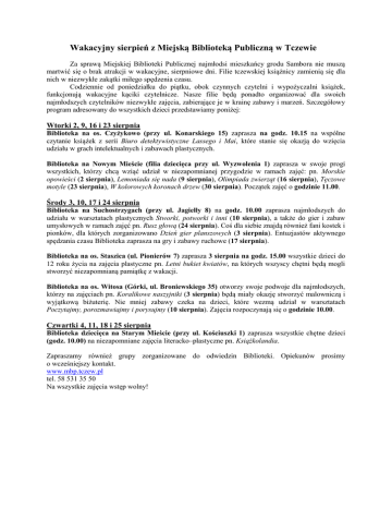 Wakacyjny sierpień z Miejską Biblioteką Publiczną w Tczewie Za sprawą Miejskiej Biblioteki Publicznej najmłodsi mieszkańcy grodu Sambora nie muszą martwić się o brak atrakcji w wakacyjne, sierpniowe dni. Filie tczewskiej książnicy zamienią się dla nich w niezwykłe zakątki miłego spędzenia czasu. Codziennie od poniedziałku do piątku, obok czynnych czytelni i wypożyczalni książek, funkcjonują wakacyjne kąciki czytelnicze. Nasze filie będą ponadto organizować dla swoich najmłodszych czytelników niezwykłe zajęcia, zabierające je w krainę zabawy i marzeń. Szczegółowy program adresowany do wszystkich dzieci przedstawiamy poniżej: Wtorki 2, 9, 16 i 23 sierpnia Biblioteka na os. Czyżykowo (przy ul. Konarskiego 15) zaprasza na godz. 10.15 na wspólne czytanie książek z serii Biuro detektywistyczne Lassego i Mai, które stanie się okazją do wzięcia udziału w grach intelektualnych i zabawach plastycznych. Biblioteka na Nowym Mieście (filia dziecięca przy ul. Wyzwolenia 1) zaprasza w swoje progi wszystkich, którzy chcą wziąć udział w niezapomnianej przygodzie w ramach zajęć: pn. Morskie opowieści (2 sierpnia), Lemoniada się nada (9 sierpnia), Olimpiada zwierząt (16 sierpnia), Tęczowe motyle (23 sierpnia), W kolorowych koronach drzew (30 sierpnia). Początek zajęć o godzinie 11.00. Środy 3, 10, 17 i 24 sierpnia Biblioteka na Suchostrzygach (przy ul. Jagiełły 8) na godz. 10.00 zaprasza najmłodszych do udziału w warsztatach plastycznych Stworki, potworki i inni (10 sierpnia), a także do gier i zabaw umysłowych w ramach zajęć pn. Rusz głową (24 sierpnia). Coś dla siebie znajdą również fani kostek i pionków, dla których zorganizowano Dzień gier planszowych (3 sierpnia). Entuzjastów aktywnego spędzania czasu Biblioteka zaprasza na gry i zabawy ruchowe (17 sierpnia). Biblioteka na os. Staszica (ul. Pionierów 7) zaprasza 3 sierpnia na godz. 15.00 wszystkie dzieci do 12 roku życia na zajęcia plastyczne pn. Letni bukiet kwiatów, na których wszyscy chętni będą mogli stworzyć niezapomnianą pamiątkę z wakacji. Biblioteka na os. Witosa (Górki, ul. Broniewskiego 35) otworzy swoje podwoje dla najmłodszych, którzy na zajęciach pn. Koralikowe naszyjniki (3 sierpnia) będą miały okazję stworzyć malowniczą i wyjątkową biżuterię. Nie mniej zabawy czeka na dzieci, które wezmą udział w warsztatach Poczytajmy, porozmawiajmy i porysujmy (10 sierpnia). Zajęcia rozpoczynają się o godzinie 10.00. Czwartki 4, 11, 18 i 25 sierpnia Biblioteka dziecięca na Starym Mieście (przy ul. Kościuszki 1) zaprasza wszystkie chętne dzieci (godz. 10.00) na niezapomniane zajęcia literacko–plastyczne pn. Książkolandia. Zapraszamy również grupy zorganizowane do odwiedzin Biblioteki. Opiekunów prosimy o wcześniejszy kontakt. www.mbp.tczew.pl tel. 58 531 35 50 Na wszystkie zajęcia wstęp wolny!