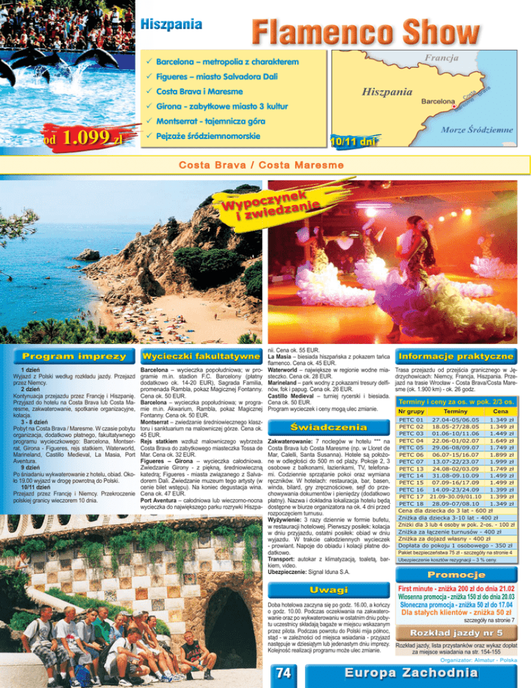 Flamenco Show Francja Barcelona – metropolia z charakterem Figueres – miasto Salvadora Dali Costa Brava i Maresme Hiszpania Girona - zabytkowe miasto 3 kultur a Barcelona av sta Br Co e sm re a M Montserrat - tajemnicza góra od 1.099 zł Morze Śródziemne Pejzaże śródziemnomorskie 10/11 dni Costa Brava / Costa Maresme k czyne ie o p y W dzan i zwie Program imprezy Wycieczki fakultatywne 1 dzień Wyjazd z Polski według rozkładu jazdy. Przejazd przez Niemcy. 2 dzień Kontynuacja przejazdu przez Francję i Hiszpanię. Przyjazd do hotelu na Costa Brava lub Costa Maresme, zakwaterowanie, spotkanie organizacyjne, kolacja. 3 - 8 dzień Pobyt na Costa Brava / Maresme. W czasie pobytu organizacja, dodatkowo płatnego, fakultatywnego programu wycieczkowego: Barcelona, Montserrat, Girona - Figueres, rejs statkiem, Waterworld, Marineland, Castillo Medieval, La Masia, Port Aventura. 9 dzień Po śniadaniu wykwaterowanie z hotelu, obiad. Około 19.00 wyjazd w drogę powrotną do Polski. 10/11 dzień Przejazd przez Francję i Niemcy. Przekroczenie polskiej granicy wieczorem 10 dnia. Barcelona – wycieczka popołudniowa; w programie m.in. stadion F.C. Barcelony (płatny dodatkowo ok. 14-20 EUR), Sagrada Familia, promenada Rambla, pokaz Magicznej Fontanny. Cena ok. 50 EUR. Barcelona – wycieczka popołudniowa; w programie m.in. Akwarium, Rambla, pokaz Magicznej Fontanny. Cena ok. 50 EUR. Montserrat – zwiedzanie średniowiecznego klasztoru i sanktuarium na malowniczej górze. Cena ok. 45 EUR. Rejs statkiem wzdłuż malowniczego wybrzeża Costa Brava do zabytkowego miasteczka Tossa de Mar. Cena ok. 32 EUR. Figueres – Girona – wycieczka całodniowa. Zwiedzanie Girony - z piękną, średniowieczną katedrą; Figueres - miasta związanego z Salvadorem Dali. Zwiedzanie muzeum tego artysty (w cenie bilet wstępu). Na koniec degustacja wina. Cena ok. 47 EUR. Port Aventura – całodniowa lub wieczorno-nocna wycieczka do największego parku rozrywki Hiszpa- nii. Cena ok. 55 EUR. La Masia – biesiada hiszpańska z pokazem tańca flamenco. Cena ok. 45 EUR. Waterworld – największe w regionie wodne miasteczko. Cena ok. 28 EUR. Marineland – park wodny z pokazami tresury delfinów, fok i papug. Cena ok. 26 EUR. Castillo Medieval – turniej rycerski i biesiada. Cena ok. 50 EUR. Program wycieczek i ceny mogą ulec zmianie. Świadczenia Zakwaterowanie: 7 noclegów w hotelu *** na Costa Brava lub Costa Maresme (np. w Lloret de Mar, Calelli, Santa Susanna). Hotele są położone w odległości do 500 m od plaży. Pokoje 2, 3 osobowe z balkonami, łazienkami, TV, telefonami. Codziennie sprzątanie pokoi oraz wymiana ręczników. W hotelach: restauracja, bar, basen, winda, bilard, gry zręcznościowe, sejf do przechowywania dokumentów i pieniędzy (dodatkowo płatny). Nazwa i dokładna lokalizacja hotelu będą dostępne w biurze organizatora na ok. 4 dni przed rozpoczęciem turnusu. Wyżywienie: 3 razy dziennie w formie bufetu, w restauracji hotelowej. Pierwszy posiłek: kolacja w dniu przyjazdu, ostatni posiłek: obiad w dniu wyjazdu. W trakcie całodziennych wycieczek - prowiant. Napoje do obiadu i kolacji płatne dodatkowo. Transport: autokar z klimatyzacją, toaletą, barkiem, video. Ubezpieczenie: Signal Iduna S.A. Informacje praktyczne Trasa przejazdu od przejścia granicznego w Jędrzychowicach: Niemcy, Francja, Hiszpania. Przejazd na trasie Wrocław - Costa Brava/Costa Maresme (ok. 1.900 km) - ok. 26 godz. Terminy i ceny za os. w pok. 2/3 os. Nr grupy PETC PETC PETC PETC PETC PETC PETC PETC PETC PETC PETC PETC PETC 01 02 03 04 05 06 07 13 14 15 16 17 18 Terminy 27.04-05/06.05 18.05-27/28.05 01.06-10/11.06 22.06-01/02.07 29.06-08/09.07 06.07-15/16.07 13.07-22/23.07 24.08-02/03.09 31.08-09.10.09 07.09-16/17.09 14.09-23/24.09 21.09-30.09/01.10 28.09-07/08.10 Cena 1.349 1.349 1.449 1.649 1.749 1.899 1.999 1.749 1.499 1.499 1.399 1.399 1.349 zł zł zł zł zł zł zł zł zł zł zł zł zł Cena dla dziecka do 3 lat - 600 zł Zniżka dla dziecka 3-10 lat - 400 zł Zniżki dla 3 lub 4 osoby w pok. 2-os. - 100 zł Zniżka za łączenie turnusów - 400 zł Zniżka za dojazd własny - 400 zł Dopłata do pokoju 1 osobowego - 350 zł Pakiet bezpieczeństwa 75 zł - szczegóły na stronie 4 Ubezpieczenie kosztów rezygnacji – 3 % ceny. Promocje First minute - zniżka 200 zł do dnia 21.02 Wiosenna promocja - zniżka 150 zł do dnia 20.03 Doba hotelowa zaczyna się po godz. 16.00, a kończy Słoneczna promocja - zniżka 50 zł do 17.04 o godz. 10.00. Podczas oczekiwania na zakwateroDla stałych klientów - zniżka 50 zł Uwagi wanie oraz po wykwaterowaniu w ostatnim dniu pobyszczegóły na stronie 7 tu uczestnicy składają bagaże w miejscu wskazanym przez pilota. Podczas powrotu do Polski mija północ, Rozkład jazdy nr 5 stąd - w zależności od miejsca wsiadania - przyjazd następuje w dziesiątym lub jedenastym dniu imprezy. Rozkład jazdy, lista przystanków oraz wykaz dopłat Kolejność realizacji programu może ulec zmianie. za miejsce wsiadania na str. 154-155 Organizator: Almatur - Polska 74 Europa Zachodnia
