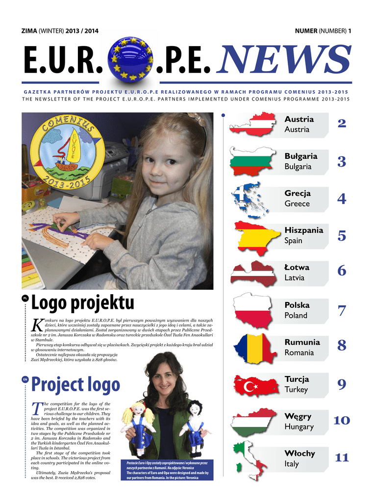 ZIMA (WINTER) 2013 / 2014 NUMER (NUMBER) 1 G A Z E T K A P A R T N E R Ó W P R O J E K T U E . U . R . O . P. E R E A L I Z O W A N E G O W R A M A C H P R O G R A M U C O M E N I U S 2 0 1 3 - 2 0 1 5 T H E N E W S L E T T E R O F T H E P R O J E C T E . U . R . O . P. E . P A R T N E R S I M P L E M E N T E D U N D E R C O M E N I U S P R O G R A M M E 2 0 1 3 - 2 0 1 5 PL Logo projektu K onkurs na logo projektu E.U.R.O.P.E. był pierwszym poważnym wyzwaniem dla naszych dzieci, które wcześniej zostały zapoznane przez nauczycielki z jego ideą i celami, a także zaplanowanymi działaniami. Został zorganizowany w dwóch etapach przez Publiczne Przedszkole nr 2 im. Janusza Korczaka w Radomsku oraz tureckie przedszkole Özel Tuzla Fen Anaokullari w Stambule. Pierwszy etap konkursu odbywał się w placówkach. Zwycięski projekt z każdego kraju brał udział w głosowaniu internetowym. Ostatecznie najlepsza okazała się propozycja Zuzi Mędrzeckiej, która uzyskała 2.828 głosów. EN Project logo T he competition for the logo of the project E.U.R.O.P.E. was the first serious challenge to our children. They have been briefed by the teachers with its idea and goals, as well as the planned activities. The competition was organized in two stages by the Publiczne Przedszkole nr 2 im. Janusza Korczaka in Radomsko and the Turkish kindergarten Özel Fen Anaokullari Tuzla in Istanbul. The first stage of the competition took place in schools. The victorious project from each country participated in the online voting. Ultimately, Zuzia Mędrzecka's proposal was the best. It received 2,828 votes. Postacie Euro i Opy zostały zaprojektowane i wykonane przez naszych partnerów z Rumunii. Na zdjęciu: Veronica The characters of Euro and Opa were designed and made by our partners from Romania. In the picture: Veronica Austria Austria 2 Bułgaria Bulgaria 3 Grecja Greece 4 Hiszpania Spain 5 Łotwa Latvia 6 Polska Poland 7 Rumunia Romania 8 Turcja Turkey 9 Węgry Hungary 10 Włochy Italy 11 2 ZIMA (WINTER) 2013 / 2014 AUSTRIA / Austria PFARRKINDERGARTEN EIBISWALD-WEST PL EIBISWALD Szczególny moment w naszym przedszkolu w Austrii! C odziennie razem z dziećmi przygotowujemy niewielkie posiłki dla wszystkich. W ten sposób nasi uczniowie dowiadują się, jak postępować z różnymi rodzajami żywności, szczególnie z warzywami i ziarnami. Mają dużą wiedzę na temat zdrowej i dobrej żywności. Mamy ścisły plan tygodnia. • Poniedziałek to dzień zupy. Gotujemy różne rodzaje zup warzywnych. • Wtorek jest dniem owoców. Oferujemy owoce sezonowe. • Środa to dzień pieczenia chleba. Rozdrabniamy ziarno i pieczemy chleb. • Czwartek jest słodkim dniem. Pieczemy ciasta. • Piątek to dzień ziarna. Gotujemy polentę*. Nasza zasada: Jedno jabłko dziennie „trzyma doktora z daleka”! * potrawa ludowa sporządzana na ogół z mąki kukurydzianej lub kaszki kukurydzianej, niekiedy z dodatkiem sera i różnych sosów, np. sosu pomidorowego EN A special point in our kindergarten in Austria! T ogether with the children we cook a snack for all of them every day. So they learn how to handle different kinds of food, especially vegetables and grain. And they know a lot about healthy and good food. We have a strict plan for the week. • Monday is soup day. We cook different kinds of vegetable soups. • Tuesday is fruit day. We offer fruit to season. • Wednesday is bread bakery day. We grind cereal and bake bread. • Thursday is sweet day. We bake cakes. • Friday is grain day. We cook polenta. Our rule: An apple a day keeps the doctor away! ZIMA (WINTER) 2013 / 2014 3 BUŁGARIA / Bulgaria CDG №2 "Yunsko vastanie" Pleven www.cdg2pleven.blogspot.bg PL Kim jesteśmy? P rzedszkole nr 2 „Yunsko vastanie” istnieje od 1980 roku w mieście Pleven w północnej Bułgarii. Dziś uczęszcza do niego 216 dzieci, które pracują w siedmiu grupach z wysoko wykwalifikowaną kadrą dydaktyczną. Pani Rumyana Kirilova jest dyrektorem placówki. Nasze przedszkole jest laureatem wielu prestiżowych nagród. Od 1981 r. ściśle współpracuje z Kolegium Pedagogiki w Pleven Uniwersytetu im. Cyryla i Metodego w Wielkim Tyrnowie i jest często odwiedzane przez studentów oraz nauczycieli. W 2007 roku otwarto tu pierwszą bibliotekę. Przedszkole posiada duże doświadczenie w pracy nad europejskimi projektami i programami. EN Who are we? K indergarten № 2 „Yunsko vastanie” has existed since 1980 in the town of Pleven, Central Northern Bulgaria. Today it is visited by 216 children in seven groups with highly qualified teaching staff. Director is Mrs Rumyana Kirilova. Our kindergarten has won many prestigious awards. From 1981 it worked closely with the College of Pedagogy at Pleven Veliko Tarnovo University „St. Cyril and Methodius” and is subject to visits by students and teachers. In 2007 was opened the first library in Bulgaria settings. It has good experience in working on European projects and programs. Pedagogical team of the „E.U.R.O.P.E. - European Union Regions in Our Pupils' Eyes”: • dr. Teodora Valova - Project Coordinator, Deputy Director of the Pedagogical College in Pleven • Rumyana Kirilova - Project Manager, Head of Kindergarten № 2 „Yunsko vastanie” • Krasimira Yordanova - head teacher • Yura Tsvetanova - teacher • Desislava Dimitrova - teacher • Raya Petkova - teacher • Boryana Vachkova - teacher • Stoyanka Vashkova - teacher • Diana Vatkova - teacher • Ludmilla Vasileva - music teacher. 4 ZIMA (WINTER) 2013 / 2014 GRECJA / Greece 11th NIPIAGOGIO CHANION PL CHANIA Grecja… Jesteśmy tu również N owy rok szkolny 2013-2014 rozpoczął się od ogłoszenia, że greckie Przedszkole nr 11 w Chanii będzie uczestniczyć w wielostronnym partnerskim projekcie szkół Comenius w latach 2013-2015. Byliśmy trochę wystraszeni, ale nasi nauczyciele wyjaśnili nam, że będziemy mieć wielu nowych przyjaciół z dziewięciu krajów europejskich. Ale czym jest 