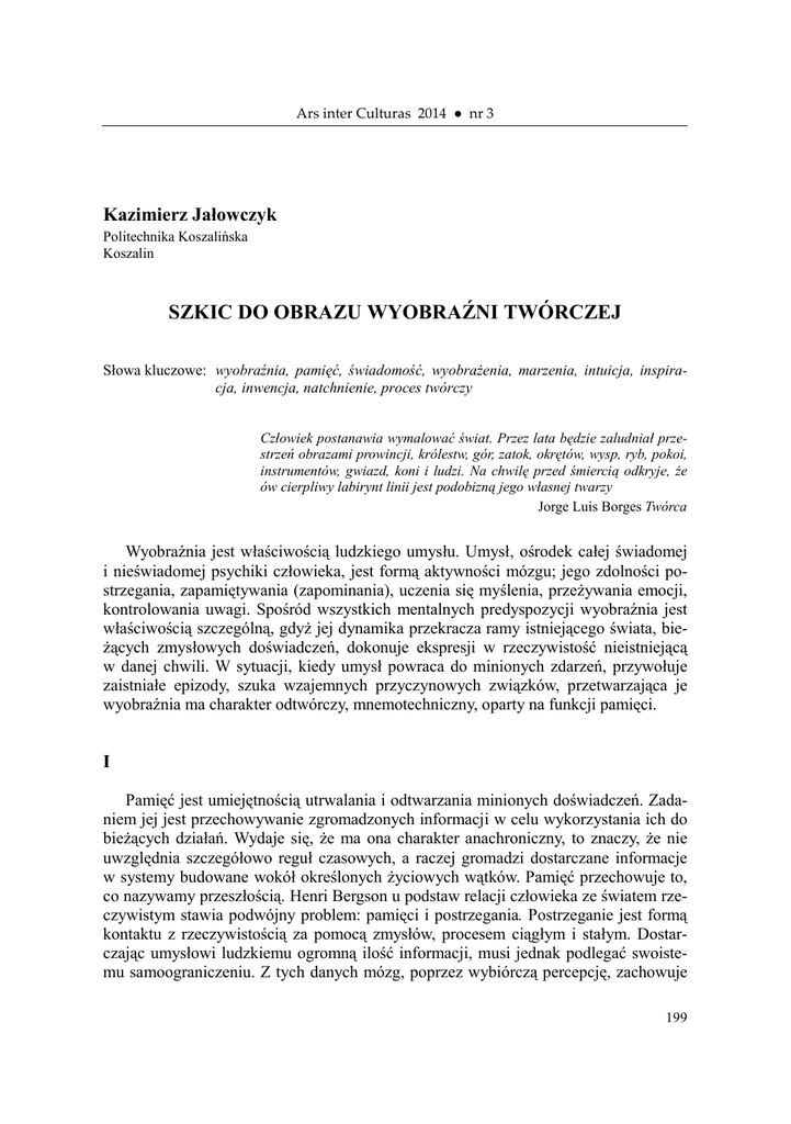 Ars inter Culturas 2014 ● nr 3 Kazimierz Jałowczyk Politechnika Koszalińska Koszalin SZKIC DO OBRAZU WYOBRAŹNI TWÓRCZEJ Słowa kluczowe: wyobraźnia, pamięć, świadomość, wyobrażenia, marzenia, intuicja, inspiracja, inwencja, natchnienie, proces twórczy Człowiek postanawia wymalować świat. Przez lata będzie zaludniał przestrzeń obrazami prowincji, królestw, gór, zatok, okrętów, wysp, ryb, pokoi, instrumentów, gwiazd, koni i ludzi. Na chwilę przed śmiercią odkryje, że ów cierpliwy labirynt linii jest podobizną jego własnej twarzy Jorge Luis Borges Twórca Wyobraźnia jest właściwością ludzkiego umysłu. Umysł, ośrodek całej świadomej i nieświadomej psychiki człowieka, jest formą aktywności mózgu; jego zdolności postrzegania, zapamiętywania (zapominania), uczenia się myślenia, przeżywania emocji, kontrolowania uwagi. Spośród wszystkich mentalnych predyspozycji wyobraźnia jest właściwością szczególną, gdyż jej dynamika przekracza ramy istniejącego świata, bieżących zmysłowych doświadczeń, dokonuje ekspresji w rzeczywistość nieistniejącą w danej chwili. W sytuacji, kiedy umysł powraca do minionych zdarzeń, przywołuje zaistniałe epizody, szuka wzajemnych przyczynowych związków, przetwarzająca je wyobraźnia ma charakter odtwórczy, mnemotechniczny, oparty na funkcji pamięci. I Pamięć jest umiejętnością utrwalania i odtwarzania minionych doświadczeń. Zadaniem jej jest przechowywanie zgromadzonych informacji w celu wykorzystania ich do bieżących działań. Wydaje się, że ma ona charakter anachroniczny, to znaczy, że nie uwzględnia szczegółowo reguł czasowych, a raczej gromadzi dostarczane informacje w systemy budowane wokół określonych życiowych wątków. Pamięć przechowuje to, co nazywamy przeszłością. Henri Bergson u podstaw relacji człowieka ze światem rzeczywistym stawia podwójny problem: pamięci i postrzegania. Postrzeganie jest formą kontaktu z rzeczywistością za pomocą zmysłów, procesem ciągłym i stałym. Dostarczając umysłowi ludzkiemu ogromną ilość informacji, musi jednak podlegać swoistemu samoograniczeniu. Z tych danych mózg, poprzez wybiórczą percepcję, zachowuje 199 tylko pewne fragmenty – będą to informacje niezbędne do bieżącego działania. W przypadku niektórych osób sfera postrzeżeń jest znacząco bardziej rozwinięta – zdarza się to przede wszystkim ludziom mniej pochłoniętym praktyczną stroną życia, zdystansowanym, a zarazem bardziej otwartym na rzeczywistość – zaliczyć można do nich myślicieli, wynalazców, artystów. Selektywną rolą pamięci jest zachowanie tego, co z minionych doświadczeń jest najbardziej przydatne do aktualnego istnienia. Według Bergsona „pojawia się w świadomości tylko w tej mierze, w jakiej może dopomóc zrozumieniu rzeczywistości i przewidywaniu przyszłości”1. Ladislaus Boros twierdzi, że „pamięć nie jest miejscem przechowywania przeszłości, lecz miejscem jej usuwania”2. Jednakże rola pamięci nie polega na eliminowaniu, a raczej „przemieszczeniu” ogromnej wiedzy, dostarczanej nam przez postrzeżenia i doświadczenia, w miejsce znajdujące się poza umysłem, które nazywamy nieświadomością. Twórczy wysiłek ludzkiego umysłu jest sumą świadomych decyzji, poprzedzonych refleksją, wynikających z uprzednich doświadczeń. II Świadomość jest stanem, w którym zdajemy sobie sprawę z własnych procesów myślowych, funkcji wewnętrznych organizmu, a także zjawisk zachodzących w świecie zewnętrznym. Bergson uściśla: świadomość to „nieodpowiedniość między czynem a wyobrażeniem [...], jest ona miarą odstępu między wyobrażeniem a czynem”3. Pojęcie „odstępu” jest kategorią przestrzenną, możliwą do uściślenia, a więc świadomość mieści się w pewnych ramach, ustalonych granicach. O ile świadomość istnieje w związku z tym, co realne, przedmiotowe – na odwrót nieświadomość należałoby odnieść do tego, co nierzeczywiste, nadzmysłowe. Określenie roli nieświadomości i sprzęgniętego z nią instynktu w procesach zachodzących w obrębie wyobraźni twórczej łączy się z obecnością czegoś niepojętego. Uznając wiedzę psychoanalityczną na temat nieświadomości, można przyjąć – uwzględniając reguły zachodzące w związku z postrzeganiem i pamięcią – że nieświadomość jest niejako rezerwuarem, miejscem przechowywania tego, co zostało odrzucone, uznane za niepotrzebne, ale i tego, co może się okazać kiedyś ważne, fundamentalne. Potwierdza to refleksja filozoficzna Karola Wojtyły, analizującego związki świadomości i nieświadomości, która „jest w znacznej mierze kształtowana przez świadomość – poza tym jest ona odwodem, czy zasobnikiem, w którym to, co znajduje się w podmiocie człowiek, czeka, aby stać się świadomym […] w ciągłej relacji ze świadomością ukazuje nam człowieka jako istotę poddaną od wewnątrz czasowi, istotę, która ma własną historię”4. Nieświadomość jest wewnętrzną ludzką tajemnicą. Zakryta przed światem zewnętrznym, pozostaje także nierozpoznawalna przez świadomość indywidualną. To miejsce, w którym niepamięć znajduje swoje przeznaczenie. Carl Gustaw Jung, zgodnie z psychoanalityczną teorią, uważa, że jest to przestrzeń, w której trwa stały niepo—————— 1 H. Bergson, Pamięć i życie, Warszawa 1988, s. 51. L. Boros, Istnienie wyzwolone, Warszawa 1985, s. 171. 3 H. Bergson, Ewolucja twórcza, Warszawa 1957, s. 132-133. 4 K. Wojtyła, Osoba i czyn, Lublin 1994, s. 120. 2 200 kój, powodujący swoisty chaos, gdyż skupia ona nieakceptowane społecznie pragnienia, popędy, przeżycia psychiczne i urazy, osobiste fantazje, zapomniane uczucia i myśli. Próbujemy jednak się domyślać, że mimo to sfera nieświadomości ma wewnętrzną organizację, jakiś rygor, być może podlegający regułom czasu, w którym kolejn