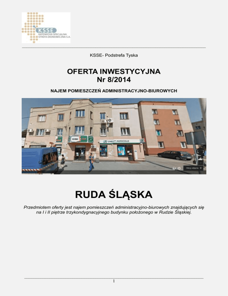 ________________________________________________________________________________ KSSE- Podstrefa Tyska OFERTA INWESTYCYJNA Nr 8/2014 NAJEM POMIESZCZEŃ ADMINISTRACYJNO-BIUROWYCH RUDA ŚLĄSKA Przedmiotem oferty jest najem pomieszczeń administracyjno-biurowych znajdujących się na I i II piętrze trzykondygnacyjnego budynku położonego w Rudzie Śląskiej. ______________________________________________________________________________ 1 ________________________________________________________________________________ INFORMACJE PODSTAWOWE BUDYNEK-OPIS: Trzykondygnacyjny budynek biurowy, którego pomieszczenia na I i II piętrze przeznaczono pod wynajem. Budynek posiada niezbędne media zasilające każde pomieszczenie. Wnętrza pomieszczeń wykonane z materiałów wysokogatunkowych, o współczesnej aranżacji. Wszystkie pomieszczenia biurowe klimatyzowane - nie posiadają umeblowania. Niektóre pomieszczenia biurowe uposażono w dodatkowe elementy wystroju wnętrz typu: sufit podwieszany wraz z punktami świetlnymi, żaluzje drewniane czy rolety, wykładzinę, panele, płytki podłogowe, ścianki dekoracyjne podświetlane punktami świetlnymi. Na nieruchomości wokół budynku znajduje się 14 miejsc parkingowych – nieodpłatnych dostępnych najemcom w czasie godzin pracy. Budynek nasłoneczniony, ze sporymi możliwościami aranżacji. Istnieje możliwość przearanżowania pomieszczeń według potrzeb najemcy i dostosowania ich do indywidualnych potrzeb najemcy tj. (łączenia poszczególnych pomieszczeń biurowych w celu zwiększenia powierzchni lub zamknięcia pomieszczenia przechodniego z udostępnieniem odrębnego wejścia). POWIERZCHNIE: Powierzchnia przeznaczona pod najem wydzielona w części na I piętrze: wynosi 59,7m2. Powierzchnia przeznaczona pod najem na II piętrze: wynosi łącznie 115,7m2. Powierzchnia parteru budynku w całości zagospodarowana przez aktualnego najemcę. POŁOŻENIE: W ścisłym centrum dzielnicy Halemba przy głównej arterii komunikacyjnej miasta Ruda Śląska. KOMUNIKACJA: Dojazd: bezkolizyjny zjazd z autostrady A4 odcinek o odległości ok. 1,5 km. Komunikacja z miastem aglomeracji śląskiej - Katowicami (15 minut) dzięki połączeniu z autostradę A4 i DTŚ. ______________________________________________________________________________ 2 ________________________________________________________________________________ DOKUMENTACJA FOTOGRAFICZNA I PIĘTRO ______________________________________________________________________________ 3 ________________________________________________________________________________ DOKUMENTACJA FOTOGRAFICZNA I PIĘTRO ______________________________________________________________________________ 4 ________________________________________________________________________________ DOKUMENTACJA FOTOGRAFICZNA I PIĘTRO ______________________________________________________________________________ 5 ________________________________________________________________________________ MIEJSCA PARKINGOWE DOKUMENTACJA FOTOGRAFICZNA II PIĘTRO ______________________________________________________________________________ 6 ________________________________________________________________________________ DOKUMENTACJA FOTOGRAFICZNA II PIĘTRO ______________________________________________________________________________ 7 ________________________________________________________________________________ DOKUMENTACJA FOTOGRAFICZNA II PIĘTRO DOKUMENTACJA FOTOGRAFICZNA II PIĘTRO ______________________________________________________________________________ 8 ________________________________________________________________________________ ______________________________________________________________________________ 9 ________________________________________________________________________________ INFORMACJE DOTYCZĄCE OFERTY NR 8_2014 LOKALIZACJA: Ruda Śląska BUDYNEK: 3 kondygnacyjny, słoneczny, z możliwościami aranżacji wg. własnych potrzeb PRZEZNACZONE POD NAJEM: I i II piętro budynku. POWIERZCHNIE POMIESZCZEŃ NA I PIĘTRZE /lokal biurowy ok.60 m2/: Nr 1 Pow. 27,5 m2 pomieszczenie przechodnie, w którym znajduje się aneks kuchenny, łazienka z wc. Nr 2 Pow. 18,4 m2 pomieszczenie przechodnie-przejście do pomieszczenia Nr 1 i Nr 3. Nr 3 Pow. 13,8 m2 wejście do pomieszczenia wyłącznie przez pomieszczenie Nr 2. WYPOSAŻENIE POMIESZCZEŃ NA I PIĘTRZE: Posadzka: wykładzina/panele/ płytki podłogowe. Każde jest doświetlone oknem. Okno uposażone w: roletę/żaluzję Pomieszczenia biurowe: każde posiada klimatyzację Pomieszczenie aneksu kuchennego i sanitarne-umeblowane. MEDIA I PIĘTRO: Pomieszczenia wyposażone we wszystkie niezbędne instalacje: elektryczną 230V , wodę, c.o. z odrębnych kotłów gazowych, z tym, że lokal o powierzchni 27,5m2 -posiada własne ogrzewanie z dwufazowego kotła WISSMAN, wod.kan., sanitarną, deszczową, telekomunikacyjną, ( z możliwością podłączenia dowolnej ilości numerów stacjonarnych), TV kablowej, internetową. Zużycie wody i centralne ogrzewanie obliczane będzie wg. proporcji z najmowanej powierzchni. CENA NETTO POMIESZCZEŃ I PIĘTRO: 35,00 zł/ m2 możliwość negocjacji ceny POWIERZCHNIE POMIESZCZEŃ II PIĘTRO: Nr 1 Pow. 18,4m2 wejście do pomieszczenia dostępne przez pom. Nr 2 Nr 2 Pow. 15,8m2 pomieszczenie przechodnie do pom. nr 1 i nr 3. Wejście przy klatce schodowej Nr 3 Pow. 19,9m2 pomieszczenie z oknem wykuszowym (3 okna na jednej ścianie). W bezpośrednim sąsiedztwie pom. zw. aneksu kuchennego i wc. Nr 4 Pow. 13,1m2 pomieszczenie przechodnie do najbliższego pom. nr 3 oraz dalszych nr 2 i nr 1 z bezpośrednim wyjściem na korytarz. W bezpośrednim sąsiedztwie pom. aneksu kuchennego i wc. Nr 5 Pow. 18,9m2 pomieszczenie przechodnie do pom. Nr 6. Nr 6 Pow. 19,8m2 pomieszczenie z podwieszanym sufitem do pom. Nr 5 oraz bezpośrednim wyjściem na korytarz. WYPOSAŻENIE POMIESZCZEŃ II PIĘTRZE: Posadzka: wykładzina/ panele/ płytki podłogowe. Każde jest do
