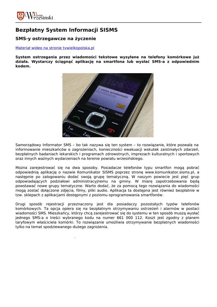 Bezpłatny System Informacji SISMS SMS-y ostrzegawcze na życzenie Materiał wideo na stronie tvwielkopolska.pl System ostrzegania przez wiadomości tekstowe wysyłane na telefony komórkowe już działa. Wystarczy ściągnąć aplikację na smartfona lub wysłać SMS-a z odpowiednim kodem. Samorządowy Informator SMS – bo tak nazywa się ten system – to rozwiązanie, które pozwala na informowanie mieszkańców o zagrożeniach, konieczności ewakuacji wskutek zaistniałych zdarzeń, bezpłatnych badaniach lekarskich i programach zdrowotnych, imprezach kulturalnych i sportowych oraz innych ważnych wydarzeniach na terenie powiatu wrzesińskiego. Można zarejestrować się na dwa sposoby. Posiadacze telefonów typu smartfon mogą pobrać odpowiednią aplikację o nazwie Komunikator SISMS poprzez stronę www.komunikator.sisms.pl, a następnie po zalogowaniu dodać swoją grupę tematyczną. W naszym powiecie jest pięć grup odpowiadających podziałowi administracyjnemu na gminy. W miarę zapotrzebowania będą powstawać nowe grupy tematyczne. Warto dodać, że za pomocą tego rozwiązania do wiadomości mogą zostać dołączone zdjęcia, filmy, pliki audio. Aplikacja ta dostępna jest również bezpłatnie w tzw. sklepach z aplikacjami dostępnymi z poziomu oprogramowania smartfonów. Drugi sposób rejestracji przeznaczony jest dla posiadaczy pozostałych typów telefonów komórkowych. Ta opcja opiera się na bezpłatnym otrzymywaniu ostrzeżeń i alarmów w postaci wiadomości SMS. Mieszkańcy, którzy chcą zarejestrować się do systemu w ten sposób muszą wysłać jednego SMS-a o treści wybranego kodu na numer 661 000 112. Koszt jest zgodny z planem taryfowym właściciela komórki. To rozwiązanie umożliwia otrzymywanie bezpłatnych wiadomości tylko na temat spodziewanego dużego zagrożenia. W najbliższym czasie Starostwo Powiatowe rozpocznie prace nad powstaniem systemu ostrzegania skierowanego do mieszkańców z terenów zagrożonych powodzią. Rejestracja użytkowników tej grupy będzie przebiegać w sposób indywidualny (przez wypełnienie formularza zgłoszenia) przy wsparciu urzędów gmin, które pomogą dotrzeć do szczególnie zainteresowanych takimi informacjami. (red.) ← Poprzedni wpis