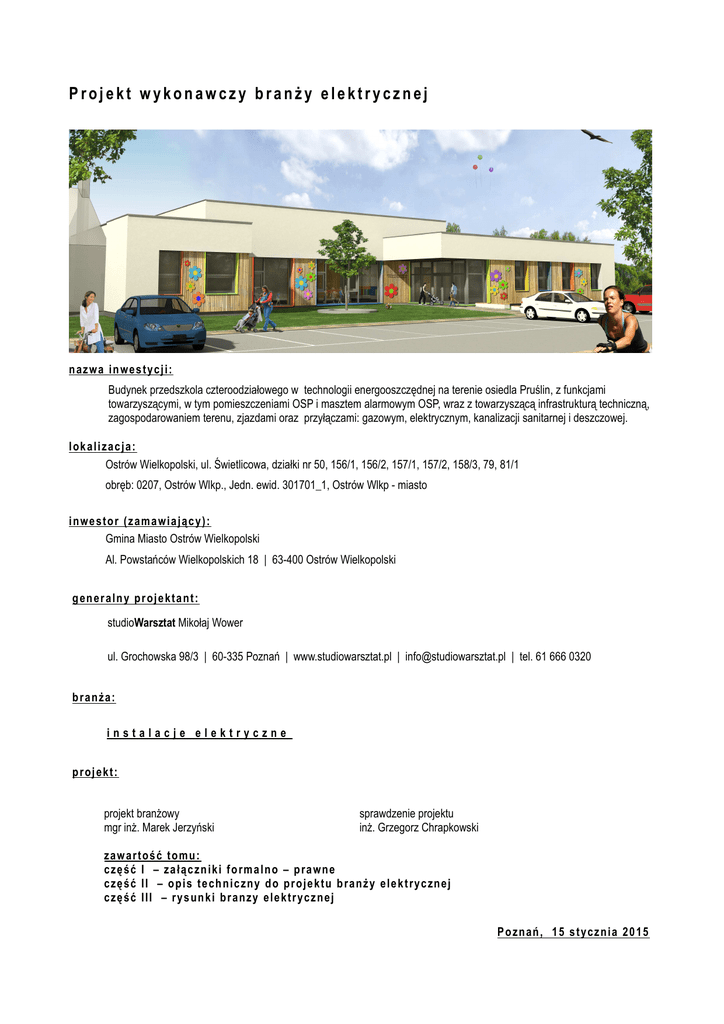 Projekt wykonawczy branŜy elektrycznej n az wa in wes t ycj i: Budynek przedszkola czteroodziałowego w technologii energooszczędnej na terenie osiedla Pruślin, z funkcjami towarzyszącymi, w tym pomieszczeniami OSP i masztem alarmowym OSP, wraz z towarzyszącą infrastrukturą techniczną, zagospodarowaniem terenu, zjazdami oraz przyłączami: gazowym, elektrycznym, kanalizacji sanitarnej i deszczowej. l ok ali zac ja: Ostrów Wielkopolski, ul. Świetlicowa, działki nr 50, 156/1, 156/2, 157/1, 157/2, 158/3, 79, 81/1 obręb: 0207, Ostrów Wlkp., Jedn. ewid. 301701_1, Ostrów Wlkp - miasto i n we st o r ( z am a wia jąc y) : Gmina Miasto Ostrów Wielkopolski Al. Powstańców Wielkopolskich 18 | 63-400 Ostrów Wielkopolski g en er aln y p r o je kt a n t : studioWarsztat Mikołaj Wower ul. Grochowska 98/3 | 60-335 Poznań | www.studiowarsztat.pl | [email protected] | tel. 61 666 0320 b r an Ŝ a: instalacje elektryczne p r o j ekt : projekt branŜowy mgr inŜ. Marek Jerzyński sprawdzenie projektu inŜ. Grzegorz Chrapkowski zaw ar t o ś ć t o m u : czę ść I – za łąc zn iki f o rm a ln o – p ra wn e czę ść II – o p is t e ch n ic zn y d o p r o je kt u b ran Ŝ y ele kt ryc zn ej czę ść III – r ys un ki b r an zy ele kt r ycz n ej P o zn ań , 1 5 s t ycz n ia 20 15 Część I - Załączniki formalno – prawne spis zawartości: 1. upr a wn ien ia bu dow la ne Pr oj ekta nta br an Ŝy el ektr yc zne j 2. zaś wi adc z enie o p r zyn al eŜn ośc i do Iz by I nŜ ynie r ów B ud own i ct wa Pr oj ekt ant a 3. upr a wn ien ia bu dow la ne Sp r aw dza ją ce go br an Ŝe el ekt r y czn ą 4. zaś wi adc z enie o p r zyn al eŜn ośc i do Iz by I nŜ ynie r ów B ud own i ct wa Sp r a wd zają ceg o 5. War un ki p r zy łą cze ni a E N E RG A n r P /1 4/0 437 21 z dn. 03 .10 .20 14 oświadczenie Projektanta i Sprawdzającego branŜe elektryczną Z god ni e z ar t.2 0 us t.4 U st aw y z dn ia 7 l ipc a 1 994 r. P r a wo bu dow la ne ( t j. D z. U . N r 2 07 z 200 3r. poz . 201 6 z p óź. zm .) n ini ej sz ym ośw iad cz am y, Ŝe p r oje kt wyk ona w cz ey w z akr esi e br an Ŝy el ekt r yc zn ej dla bud yn ku pr z eds z kola czt er o o dz iał ow ego w te chn ol ogi i e ner g oos zc zęd nej na te r eni e os ied la Pr u śl in , z fu nkc j am i tow ar z ysz ą c ym i, w t ym po m ie sz cz en iam i O SP i m asz tem alar m o wym OS P, w r az z tow ar z ysz ą cą in fr a st r uk tur ą t ec hnic zn ą, zag osp odar owa ni em te r en u, zja zd am i or a z pr z yłą cz am i : ga zow ym , e le ktr y cz ny m , kan ali za cj i sa ni tar nej i de szc zo we j w Ostr o wie W ie lk opo ls ki m , n a d zia łk ach nr 5 0, 156 /1, 156/ 2, 15 7/ 1, 1 57 /2, 158 /3, 79 , 81/ 1; wyk on any dl a Gm iny M ias to Ost r ów Wi el kop ol s ki zost a ł sp or z ądz ony zg odni e z ob owi ąz uj ący m i pr z epis am i or a z zas ada m i wi edz y tec hni czn ej or a z M i ej sco w ym P la nem Z ago spo da r ow ania Pr z es tr z enn ego . Część II - opis techniczny do projektu instalacji elektrycznych: spis zawartości: 1. Pr z edm io t opr a cow an ia 2. Po dst aw a opr a cow ani a 3. Z akr es opr aco wa nia 4. Opis r oz wi ąza ń te chn icz ny ch 5. Bi la ns m o cy 6. Obl ic zen ia te ch ni czn e 7. Z esta w ien ia i loś ci po d staw ow yc h m a ter ia łó w 1. P r ze dm io t o p ra co wa ni a: Przedmiotem opracowania jest projekt wykonawczy instalacji elektrycznych wykonywanych w ramach budynku przedszkola czteroodziałowego w technologii energooszczędnej na terenie osiedla Pruślin, z funkcjami towarzyszącymi, w tym pomieszczeniami OSP i masztem alarmowym OSP, wraz z towarzyszącą infrastrukturą techniczną, zagospodarowaniem terenu, zjazdami oraz przyłączami: gazowym, elektrycznym, kanalizacji sanitarnej i deszczowej w Ostrowie Wielkopolskim, na działkach nr 50, 156/1, 156/2, 157/1, 157/2, 158/3, 79, 81/1. Projekt obejmuje wykonanie linii zasilającej rozdzielnicę RNN ze złącza zabudowanego przy granicy działki oraz wewnętrznych linii zasilających tablice bezpiecznikowe w budynku. Wszystkie punkty rozdziału energii elektrycznej zostały przedstawione w projekcie. Zaprojektowano zasilanie urządzeń elektrycznych tj. gniazda wtykowe 230V, gniazda siłowe, oświetlenie, urządzenia sanitarne i urządzenia technologiczne. Projektowany pobór mocy elektrycznej przez odbiory w budynku wynosi P=31,5 kW. 2. P o d st a wa o p r aco wan ia: • zlecenia wykonania projektu; • podkłady architektoniczne przygotowane przez studiowarsztat z Poznania, • przepisów i norm, a w szczegóIności: Dz.U. 1994 nr 89 poz. 414 z późn. Ustawa Prawo budowlane zmianami Dz.U. 2002 nr 75 poz. 690 z późn. Rozporządzenie Ministra Infrastruktury z dn. 12 kwietnia 2002r. w sprawie warunków zmianami technicznych, jakim powinny odpowiadać budynki i ich usytuowanie Dz. U. 2003 nr 47 poz. 401 Rozporządzenie Ministra Infrastruktury z dn. 6 lutego 2003r. w sprawie bezpieczeństwa i higieny pracy przy wykonywaniu robót budowlanych Dz. U. 1999 nr 80 poz. 912 Rozporządzenie Ministra Gospodarki z dn. 17 września 1999r. w sprawie bezpieczeństwa i higieny pracy przy urządzeniach i instalacjach energetycznych PN-IEC 60364-4-41:2000 Instalacje elektryczne w obiektach budowlanych -- Ochrona dla zapewnienia bezpieczeństwa -- Ochrona przeciwporaŜeniowa PN-IEC 60364-1:2000 Instalacje elektryczne w obiektach budowlanych -- Zakres, przedmiot i wymagania podstawowe PN-IEC 60364-4-43:1999 Instalacje elektryczne w obiektach budowlanych -- Ochrona dla zapewnienia bezpieczeństwa -- Ochrona przed prądem przetęŜeniowym PN-IEC 60364-5 Instalacje elektryczne w obiektach budowlanych -- Dobór i montaŜ wyposaŜenia elektrycznego 3 . Z ak r es o p r aco wan i a: Zakres opracowania obejmuje następujące elementy instalacji elektrycznych: - zasilenie ze złącza ZK rozdzielnicy głównej RNN, - rozdzielnicę główną RNN, - wewnętrzne linie zasilające tablice bezpiecznikowe, - tablice elektryczne TB1