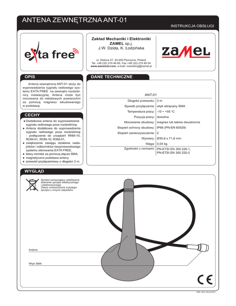 ANTENA ZEWNĘTRZNA ANT-01 INSTRUKCJA OBSŁUGI Zakład Mechaniki i Elektroniki ZAMEL sp.j. J.W. Dzida, K. Łodzińska ul. Zielona 27, 43-200 Pszczyna, Poland Tel. +48 (32) 210 46 65, Fax +48 (32) 210 80 04 www.zamelcet.com, e-mail: [email protected] OPIS DANE TECHNICZNE Antena zewnętrzna ANT-01 służy do wyprowadzenia sygnału radiowego systemu EXTA FREE na zewnątrz rozdzielnicy instalacyjnej. Antena może być mocowana do metalowych powierzchni za pomocą magnesu wbudowanego w podstawę. ANT-01 Długość przewodu: 3 m Sposób przyłączenia: wtyk wkręcany SMA Temperatura pracy: -10 ÷ +55 oC CECHY Pozycja pracy: dowolna ●Dodatkowa antena do wyprowadzenia sygnału radiowego poza rozdzielnicę, ● Antena dodatkowa do wyprowadzenia sygnału radiowego poza rozdzielnicę - podłączenie do urządzeń RNM-10, ROM-01, ROM-10, RXM-01, ● zwiększenie zasięgu działania nadajników i odbiorników bezprzewodowego systemu sterowania EXTA FREE, ● łatwy montaż za pomocą złącza SMA, ● magnetyczna podstawa anteny ● przewód przyłączeniowy o długości 3 m. Mocowanie obudowy: magnes lub taśma dwustronna Stopień ochrony obudowy: IP66 (PN-EN 60529) Stopień zanieczyszczenia: 2 Wymiary: Ø30,8 x 71,8 mm Waga: 0,04 kg Zgodność z normami: PN-ETSI EN 300 220-1, PN-ETSI EN 300 220-2 WYGLĄD Symbol oznaczający selektywne zbieranie sprzętu elektrycznego i elektronicznego. Zakaz umieszczania zużytego sprzętu z innymi odpadami. Antena Wtyk SMA VER. 004_04.02.2011 WSPÓŁPRACA I ZASIĘG DZIAŁANIA Symbol ROP-01 ROP-02 ROB-01 /12-24V SRP-02 SRP-03 RNK-02 180 m 200 m 200 m 200 m 200 m 250 m RNK-04 180 m 200 m 200 m 200 m 200 m 250 m P-256/8 230 m 250 m 250 m 250 m 250 m P-257/4 (2) 180 m 200 m 200 m 200 m RNM-10 230 m 250 m 250 m RNP-01 160 m 180 m RNP-02 160 m RNL-01 RWG-01 RWL-01 ROM-01 ROM-10 RDP-01 RTN-01 180 m 250 m 250 m 180 m 250 m 180 m 250 m 250 m 180 m 250 m 300 m 200 m 300 m 300 m 230 m 300 m 200 m 250 m 180 m 250 m 250 m 180 m 250 m 250 m 250 m 300 m 200 m 300 m 300 m 230 m 300 m 180 m 180 m 180 m 200 m 160 m 200 m 200 m 160 m 200 m 180 m 180 m 180 m 180 m 200 m 160 m 200 m 200 m 160 m 200 m 160 m 180 m 180 m brak* brak* 200 m 160 m 200 m 200 m 160 m 200 m RTN-01 200 m 200 m 200 m 200 m 200 m 250 m 200 m 250 m 250 m 200 m 250 m RCR-01 160 m 180 m 180 m brak* brak* 200 m 160 m 200 m 200 m 160 m 200 m RTI-01 160 m 180 m 180 m 180 m 180 m 200 m 160 m 200 m 200 m 160 m 200 m RXM-01 230 m 250 m 250 m 250 m 250 m 300 m 200 m 300 m 300 m 230 m 300 m * - nadajniki 1-kanałowe nie współpracują ze sterownikami rolet UWAGA! Podany zasięg działania dotyczy przestrzeni otwartej, czyli warunków idealnych, bez przeszkód. Jeżeli pomiędzy nadajnikiem a odbiornikiem znajdują się przeszkody, należy przewidzieć zmniejszenie zasięgu działania odpowiednio dla: cegła od 10 do 40%, drewna i gipsu od 5 do 20%, betonu zbrojonego od 40 do 80%, metalu od 90 do 100%, szkła od 10 do 20%. Negatywny wpływ na zasięg działania mają też napowietrzne i podziemne linie energetyczne dużej mocy oraz nadajniki telefonii komórkowej umieszczone w bliskiej odległości urządzeń. NADAJNIKI ODBIORNIKI RNK-02 Radiowy nadajnik klawiszowy 2-kanałowy RNL-01 Radiowy nadajnik nożny ROP-01 Radiowy odbiornik dopuszkowy 1-kanałowy RWL-01 Radiowy wyłącznik oświetleniowy RNK-04 Radiowy nadajnik klawiszowy 4-kanałowy RTI-01 Translator IR/EXTA FREE ROP-02 Radiowy odbiornik dopuszkowy 2-kanałowy RWG-01 Gniazdo zdalnie sterowane P-256/8 Pilot 8-kanałowy RNM-10 Radiowy nadajnik modułowy 4-kanałowy RDP-01 Radiowy ściemniacz dopuszkowy 1-kanałowy SRP-02 Sterownik rolet dopuszkowy P-257/4 Pilot 4-kanałowy RNP-01 Radiowy nadajnik dopuszkowy 4-kanałowy ROB-01/12-24V Radiowy odbiornik bramowy SRP-03 Sterownik rolet dopuszkowy centralny P-257/2 Pilot 2-kanałowy RNP-02 Radiowy nadajnik dopuszkowy 4-kanałowy ROM-01 Radiowy odbiornik modułowy 1-kanałowy ROM-10 Radiowy odbiornik modułowy 2-kanałowy RCR-01 Radiowy czujnik ruchu AKCESORIA RXM-01 Translator RS-485/EXTA FREE ProducentGWARANCYJNA udziela 24 miesięcznej gwarancji KARTA Pieczęć i podpis sprzedawcy, data sprzedaży ANT-01 Antena zewnętrzna RTN-01 Retransmiter 1. ZMIE ZAMEL SP.J. udziela 24- miesięcznej gwarancji na sprzedawane towary. 2. Gwarancją ZMIE ZAMEL SP.J. nie są objęte: a) mechaniczne uszkodzenia powstałe w transporcie, załadunku / rozładunku lub innych okolicznościach, b) uszkodzenia powstałe na skutek wadliwie wykonanego montażu lub eksploatacji wyrobów ZMIE ZAMEL SP.J., c) uszkodzenia powstałe na skutek jakichkolwiek przeróbek dokonanych przez KUPUJĄCEGO lub osoby trzecie a odnoszących się do wyrobów będących przedmiotem sprzedaży lub urządzeń niezbędnych do prawidłowego funkcjonowania wyrobów będących przedmiotem sprzedaży, d) uszkodzenia wynikające z działania siły wyższej lub innych zdarzeń losowych, za które ZMIE ZAMEL SP.J. nie ponosi odpowiedzialności. 3. Wszelkie roszczenia z tytułu gwarancji KUPUJĄCY zgłosi w punkcie zakupu lub firmie ZMIE ZAMEL SP.J. na piśmie po ich stwierdzeniu. 4. ZMIE ZAMEL SP.J. zobowiązuje się do rozpatrywania reklamacji zgodnie z obowiązującymi przepisami prawa polskiego. 5. Wybór formy załatwienia reklamacji, np. wymiana towaru na wolny od wad, naprawa lub zwrot pieniędzy należy do ZMIE ZAMEL SP.J. 6. Terytorialny zasięg obowiązywania gwarancji: Rzeczpospolita Polska. 7. Gwarancja nie wyłącza, nie ogranicza, ani nie zawiesza uprawnień KUPUJĄCEGO wynikających z niezgodności towaru z umową.