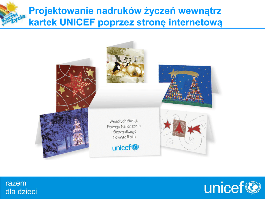 Projektowanie nadruków życzeń wewnątrz kartek UNICEF poprzez stronę internetową Podstawowe informacje Przyjmujemy zamówienia na nadruk wewnątrz kartek UNICEF w druku: – cyfrowym (niezależnie od nakładu) – offsetowym (dla nakładu powyżej 700 sztuk) Zróżnicowanie techniki nadruku wiąże się z relacją kosztów do ilości zamawianych kart. Koszt wykonania nadruków w offsecie jest korzystny jedynie przy większych zamówieniach, stąd dla mniejszego nakładu oferujemy tylko druk cyfrowy. W przypadku nadruków cyfrowych udostępniliśmy nowy program do projektowania nadruków na kartach korporacyjnych UNICEF na stronie http://www.qprint.com.pl/UNICEF UWAGA: Do wyświetlenia programu wymagana jest darmowa aplikacja Flash Player lub darmowa przeglądarka internetowa Mozzlia Firefox Podstawowe informacje: cennik Cennik na nadruk cyfrowy – 2011 rok Wszystkie wyżej podane ceny są cenami brutto. Do wyżej podanych cen należy doliczyć cenę kartki oraz koszt dostawy kuriera - 20 zł. Promocja: Dla zamówień do 15.10.2011 – 10% rabatu na nadruk Formy płatności:- Przedpłata – dla zamówień do 300 zł - Przelew z terminem płatności 14 dni dla zamówień powyżej 300zł ( faktura razem z kartkami) Projektowanie: wybór kartki W sklepie internetowym UNICEF wybierają Państwo wzór kartki. Kartki > Boże Narodzenie > Karty korporacyjne Kartki na których można wykonać nadruk są oznaczone symbolem: Aby rozpocząć projektowanie należy nacisnąć przycisk: Zaprojektuj własny nadruk Projektowanie: wybór kartki Potwierdzają Państwo dany wzór karty, dla którego będzie wykonany nadruk , klikając przycisk: Wybierz. W szczegółach wybranego projektu znajda Państwo cennik nadruku cyfrowego. Projektowanie: życzenia Na stronie programu wyświetlają się przykładowe życzenia świąteczne. Mogą Państwo wpisać swoje życzenia lub wybrać tekst z naszej bazy życzeń klikając na ten przycisk Uwaga! Część szablonów kartek ma ograniczone pole do wpisania życzeń i wstawiania symboli do jednej strony, ze względu na tłoczenia wykonane na pierwszej stronie kartki. Projektowanie: edycja tekstu Klikając na pole z życzeniami, po lewej stronie wyświetli się nam „Edycja Tekstów”, dzięki niej można: -Wybrać kolor w wartościach RGB -Ustawić rozmieszczenie tekstu (do lewej, do prawej lub wypośrodkować) oraz ustawić styl czcionki. -Wybrać czcionkę, jej wielkość i kolor itp. -Wkleić swoje życzenia -Dodać gotowe życzenia Projektowanie: wstawianie plików graficznych Następnie wybierając poszczególne ikony po lewej stronie mogą Państwo: - dodać Logo firmy (najlepiej w formacie: JPG) - dodać Ozdoby Projektowanie: edycja obiektów Aby powiększyć ozdobę lub logo należy je zaznaczyć, a następnie kliknąć na jeden z kwadracików i przeciągnąć go do odpowiedniej wielkości. Wszystkie elementy można przesuwać Aby usunąć dany element należy go zaznaczyć, a następnie przycisnąć ikonę kosz Powiększania projektu Pogląd projektu w wymiarze 3d Wydruk projektu Projektowanie: przesuwanie obiektów Aby przesunąć tekst z życzeniami należy kliknąć na ikonę a następnie przesunąć życzenia w odpowiednią stronę Naciskając na niebieskie kwadraciki mogą Państwo zmieniać szerokość pola tekstowego Projektowanie: rozmieszczenie obiektów Zielona linia wskazuje nam, że dane elementy zaczynają się lub kończą się na tej samej wysokości Projektowanie: zapisywanie projektu Po zakończeniu projektu należy przycisnąć ikonę: Zapisz, a następnie zapisać ten projekt jako nowy lub nadpisać zmiany na obecnym. Zapisany nowy projekt Uwaga! Przed zapisaniem projektu proszę sprawdzić czy nie mają Państwo zaznaczonej opcji: blokowania plików Cookie. Można to sprawdzić wchodząc w przeglądarce internetowej na: Narzędzia >Opcje internetowe > Prywatność, poniżej opisu: Wybierz ustawienia dla strefy internetowej jest informacja dotycząca blokowanych plików przez przeglądarkę Zamówienie: dodawanie do koszyka Mogą Państwo zaprojektować nadruki na kolejnych kartkach i zapisać kolejne projekty lub złożyć zlecenie. Przed dodaniem projektu do koszyka proszę sprawdzić czy nie ma błędów w projekcie! Aby złożyć zamówienie klikają Państwo na ikonę: Złóż zlecenie następnie wybrany projekt dodają Państwo do koszyka Zamówienie: koszty nadruku Koszt nadruku jest wyliczany automatycznie po wpisaniu nakładu oraz określeniu rodzaju nadruku (kolorowy lub w czerni) UWAGA: jeśli projekt wykonali Państwo w kolorze a przy składaniu zamówienia wybiorą Państwo druk w czerni, nadruk zostanie wykonany zgodnie z określonym rodzajem nadruku (w czerni) Akceptują Państwo szczegóły wykonania zlecenia klikając Dodaj Zamówienie: podsumowanie zawartości koszyka Jeżeli nie chcą Państwo dodawać kolejnych projektów do koszyka, należy kliknąć Dalej Zamówienie: szczegóły zamówienia/potwierdzenie W Oknie zamówienia wpisują Państwo swoje dane kontaktowe, w tym adres email, na który zostanie wysłana wiadomość z prośbą o potwierdzenie zamówienia. UWAGA! Jeżeli mają Państwo ustawioną skrzynkę odbiorczą w formacie zwykłym link do strony internetowej nie wyświetli się. Skrzynka powinna być ustawiona, aby można było odbierać wiadomości html. Jeżeli nie otrzymaliby Państwo e-mail proszę o sprawdzenie wiadomości śmieci. Aby potwierdzić zamówienie należy kliknąć na link Zamówienie: potwierdzenie W formularzu zamówienia określają Państwo sposób płatności i dostawy oraz podają Państwo dane do faktury i adres wysyłki zamówienia. Ostatnim krokiem jest potwierdzenie lub anulowanie formularza zamówienia.