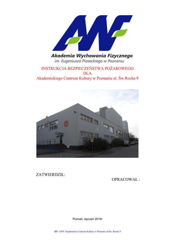 INSTRUKCJA BEZPIECZEŃSTWA POŻAROWEGO DLA Akademickiego Centrum Kultury w Poznaniu ul. Św.Rocha 9 ZATWIERDZIŁ: OPRACOWAŁ : Poznań, styczeń 2015r IBP -AWF Akademickie Centrum Kultury w Poznanie ul.Św. Rocha 9 INSTRUKCJA BEZPIECZEŃSTWA POŻAROWEGO 2 Spis treści: 1. Podstawy opracowania. 4 2. Przedmiot i zakres opracowania. 5 3. Warunki ochrony przeciwpożarowej. 6 3.1.Lokalizacja i opis budynku. 3.2.Układ funkcjonalny budynku. 3.3.Dojazdy do budynku oraz zaopatrzenie wodne. 3.4.Klasyfikacja pożarowa obiektu. 6 6 7 7 4. Sposoby poddawania przeglądom technicznym i czynnościom konserwacyjnym stosowanych w obiekcie urządzeń przeciwpożarowych i gaśnic. 9 4.1.Rozmieszczenie podręcznego sprzętu gaśniczego. 4.1.1.Zasady ogólne. 4.1.2.Etatyzacja podręcznego sprzętu gaśniczego. 4.2.Instalacja sygnalizacji pożaru. 4.3.Instalacja hydrantów wewnętrznych. 11 12 13 13 13 5. Sposoby wykonywania prac niebezpiecznych pod względem pożarowym. 14 6. Zasady zapobiegania możliwości powstania pożaru. 15 7. Sposoby postępowania na wypadek powstania pożaru. 16 7.1.Zagrożenie pożarowe. 7.2.Drogi rozprzestrzeniania się pożaru. 7.3.Czynniki wpływające na szybkość rozprzestrzeniania się pożaru. 7.4.Podstawowe zasady postępowania na wypadek powstania pożaru. 7.5.Sposób alarmowania jednostek straży pożarnej. 7.6.Zadania i obowiązki pracowników. 7.7.Instrukcja postępowania na wypadek powstania pożaru i podjęcia decyzji o ewakuacji ludzi i mienia z budynku. 8. Sposoby praktycznego sprawdzenia organizacji i warunków ewakuacji ludzi. 8.1.Zasady ogólne. 8.2.Organizacja ewakuacji. 8.3.Wskazania ewakuacyjne. 8.4.Podstawowe obowiązki osób odpowiedzialnych za ewakuację ludzi. 8.5.Organizacja ewakuacji mienia. 9.Sposoby zaznajamiania użytkowników obiektu z treścią instrukcji bezpieczeństwa pożarowego oraz przepisami przeciwpożarowymi. IBP -AWF Akademickie Centrum Kultury w Poznanie ul .Św.Rocha 9 16 17 18 18 19 20 25 26 26 26 28 29 29 29 ZAŁĄCZNIKI 1-4 Wzorcowa dokumentacja zabezpieczania prac niebezpiecznych pożarowo. 31 - 36 5 Wzór oświadczenia o przeszkoleniu pracownika. 37 6 Zarządzenie wprowadzające. 38 7 Oświadczenie pracownika o zapoznaniu się z treścią instrukcji bezpieczeństwa pożarowego. 39 8.Rzuty sytuacyjne IBP -AWF Akademickie Centrum Kultury w Poznanie ul.Św. Rocha 9 INSTRUKCJA BEZPIECZEŃSTWA POŻAROWEGO 4 1. PODSTAWY OPRACOWANIA. Merytoryczną podstawę niniejszego opracowania stanowią postanowienia obowiązujących aktów prawnych w zakresie ochrony przeciwpożarowej, a w szczególności; 1. Ustawa z dnia 07.07.1994 r. Prawo budowlane (tekst jednolity Dz. U. 2006 r. Nr 156 poz. 1118 z późn. zm.). 2. Obwieszczenie Marszałka Sejmu Rzeczypospolitej Polskiej z dnia 14.01.2009 r. w sprawie ogłoszenia jednolitego tekstu ustawy o Państwowej Straży Pożarnej (Dz. U. 2009 r. Nr 12, poz. 68). 3. Rozporządzenia MSWiA z dnia 07.06.2010 r. w sprawie ochrony przeciwpożarowej budynków, innych obiektów budowlanych i terenów (DZ. U. Nr 109, poz. 719). 4. Rozporządzenia MSWiA z dnia 24.07.2009 r. w sprawie przeciwpożarowego zaopatrzenia w wodę oraz dróg pożarowych ( DZ. U. 2009r. Nr 124 poz. 1030 ). 5. PN-92/N-01256/01 i /02. Znaki bezpieczeństwa. Ochrona przeciwpożarowa. Ewakuacja oraz PN-97/N-01256/04. 6. PN-92/M-51079/01 - /05. Sprzęt pożarniczy. Gaśnice przenośne. 7. PN-B-02852. Ochrona przeciwpożarowa budynków. Obliczanie ogniowego oraz wyznaczanie względnego czasu trwania pożaru. gęstości obciążenia 8. PN-86/E-05003/01 i 02 i 03. Ochrona odgromowa obiektów budowlanych. Wymagania ogólne. Ochrona podstawowa. Ochrona obostrzona. 9. Ustawa z dnia 27.04.2001r. Prawo ochrony środowiska ( Dz. U. Nr 62, poz.627 z późn. zm.). 10. Rozporządzenie Ministra Infrastruktury z dnia 12.04. 2002 r, w sprawie warunków technicznych, jakim powinny odpowiadać budynki i ich usytuowanie (Dz. U. 2002r. Nr 75. Poz. 690 z późn. zm.). 11. Rozporządzenie Ministra Gospodarki z dnia 27.04.2000 r. w sprawie bezpieczeństwa i higieny pracy przy pracach spawalniczych ( Dz. U. Nr 40, poz. 470 ). 12. Ustawa z dnia 21.11.2008 r. o zmianie ustawy kodeks pracy (Dz. U. Nr 223, poz. 1460). 13. Rozporządzenie Ministra Infrastruktury z dnia 12.03.2009 r. zmieniające rozporządzenie w sprawie warunków technicznych, jakim powinny odpowiadać budynki i ich usytuowanie (Dz. U. Nr 56, poz. 461). 14. Rozporządzenie MSWiA z dnia 16.07.2009 r. zmieniające rozporządzenie w sprawie uzgadniania projektu budowlanego pod względem ochrony przeciwpożarowej ( Dz. U. Nr 119, poz. 998 ). 15. Obwieszczenie Marszałka Sejmu Rzeczypospolitej Polskiej z dnia 15.10.2009 r. w sprawie ogłoszenia jednolitego tekstu ustawy o ochronie przeciwpożarowej (Dz. U. 2009 r. Nr 178, poz. 1380). 16. Materiały i informacje uzyskane w trakcie przeglądu obiektu od osoby zarządzającej. IBP -AWF Akademickie Centrum Kultury w Poznanie ul.Św. Rocha 9 INSTRUKCJA BEZPIECZEŃSTWA POŻAROWEGO 5 2. PRZEDMIOT I ZAKRES OPRACOWANIA. Przedmiotem niniejszego opracowania jest określenie szczegółowych wymagań zabezpieczenia przeciwpożarowego dla budynku AWF – Akademickiego Centrum Kultury zlokalizowanego w Poznaniu przy ul. Św. Rocha 9, stosownie do ustaleń zawartych w § 6 ust. 1 Rozporządzenia Ministra Spraw Wewnętrznych i Administracji z dnia 07.06.2010 r. w sprawie ochrony przeciwpożarowej budynków, innych obiektów budowlanych i terenów (Dz. U. 2010 r. Nr 109, poz.719). Zakres tematyczny instrukcji bezpieczeństwa pożarowego uwzględnia założenia ujęte w powyższym postanowieniu rozporządzenia MSWiA z dnia 07.06.2010 r. w sprawie ochrony przeciwpożarowej budynków, innych obiektów budowlanych i terenów i obejmuje następujące zagadnienia: 1) Warunki ochrony przeciwpożarowej, wynikające z przeznaczenia obiektu, sposobu użytkowania, prowadzonego procesu technologicznego i jego warunków technicznych, w tym zagrożenia wybuchem. 2) Sposób poddawania przegląd